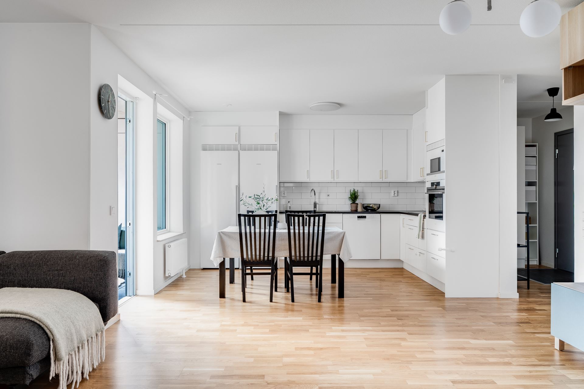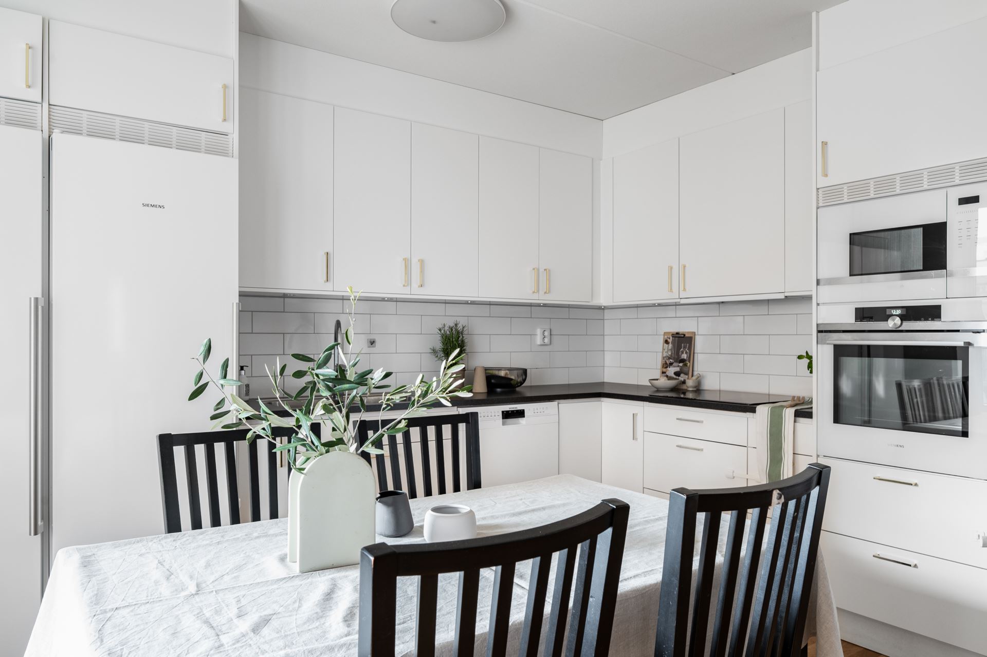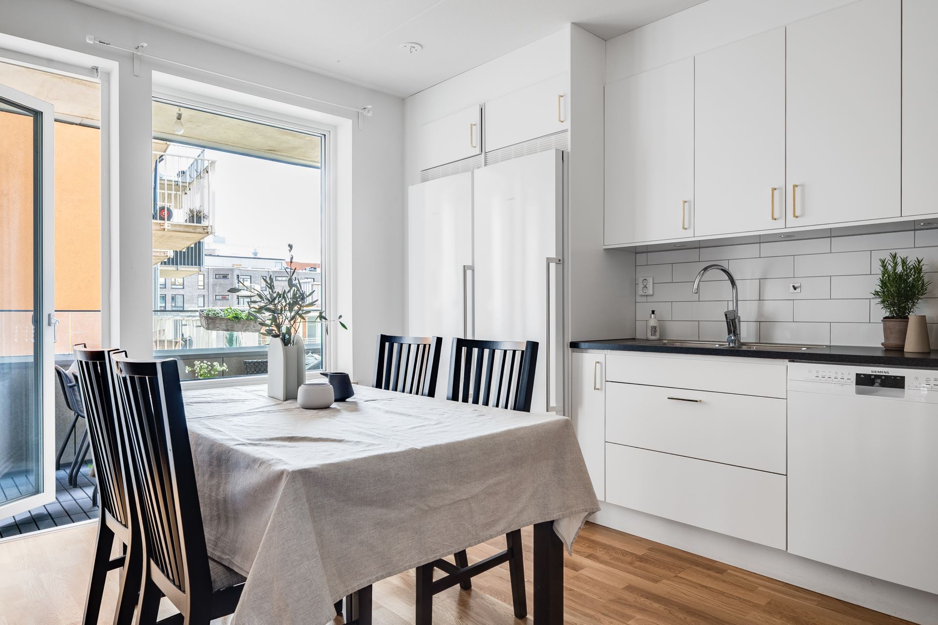 Ljusa köksluckor (Vedum) tillsammans med vitt kakel och mörk bänkskiva i laminat. Köket bjuder på både bra förvaringsmöjligheter i skåp och lådor samt goda arbetsytor. Plats för större matbord mot köksdelen. Köket är utrustat med diskmaskin, kyl och frys, spishäll, inbyggnadsugn, inbyggd mikro och fläkt. Från köket nås dessutom den sköna balkongen, belägen i härligt söderläge!