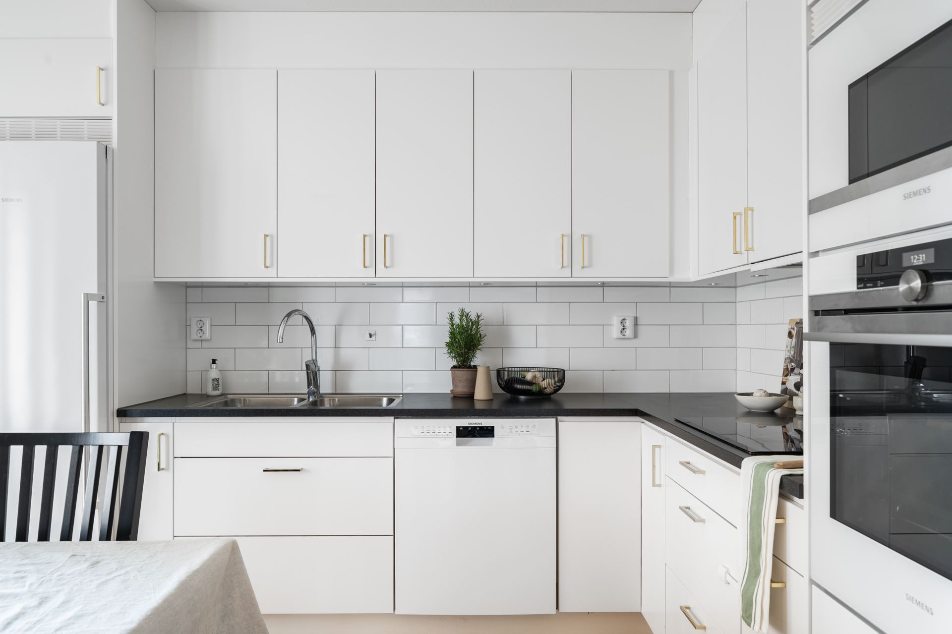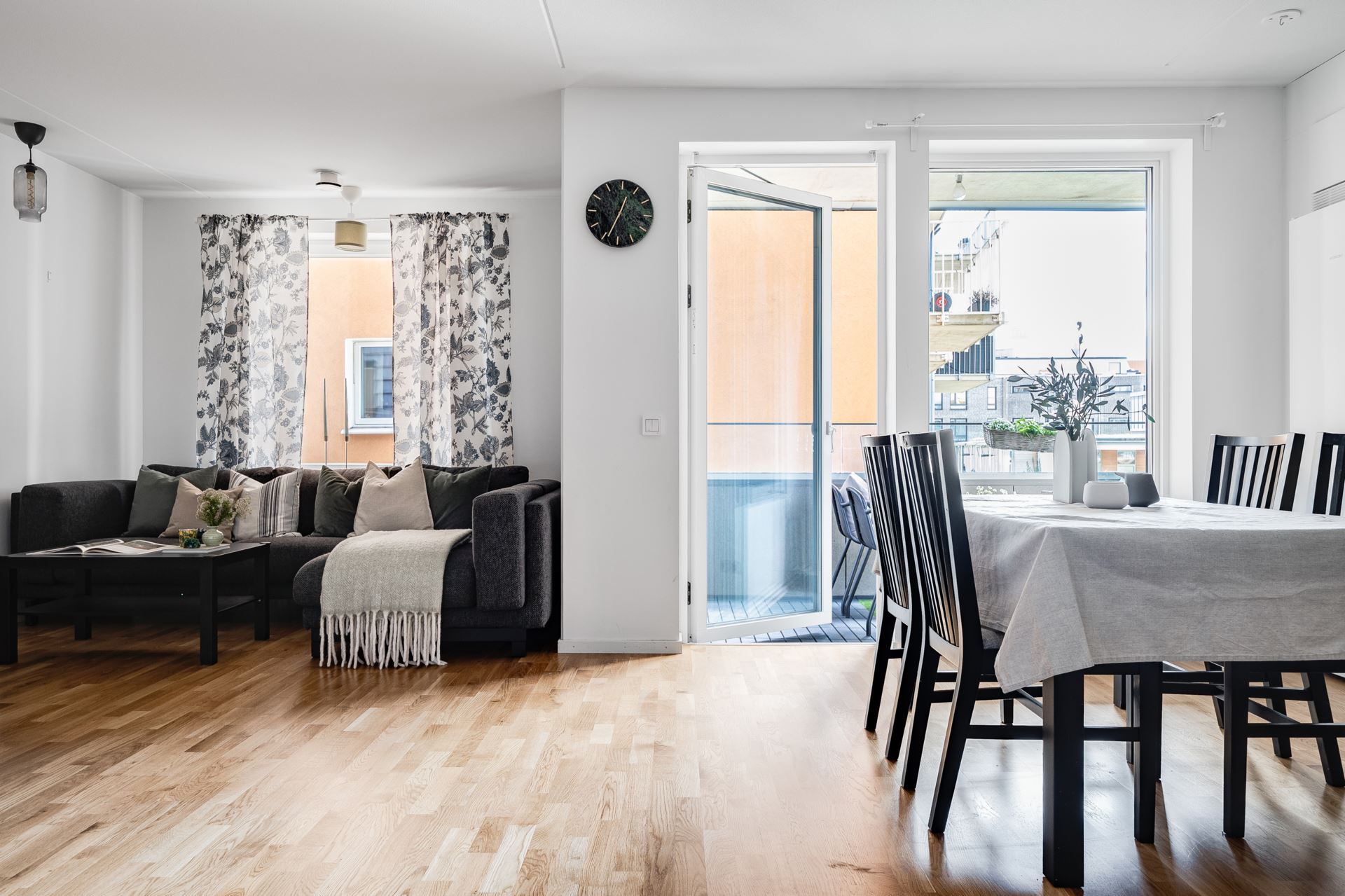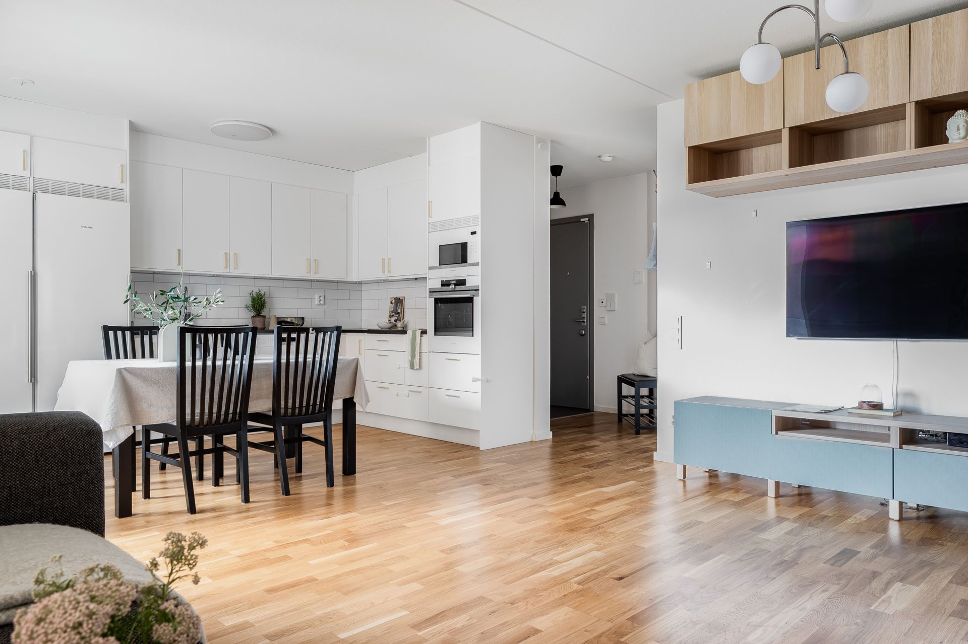 Ljusa köksluckor (Vedum) tillsammans med vitt kakel och mörk bänkskiva i laminat. Köket bjuder på både bra förvaringsmöjligheter i skåp och lådor samt goda arbetsytor. Plats för större matbord mot köksdelen. Köket är utrustat med diskmaskin, kyl och frys, spishäll, inbyggnadsugn, inbyggd mikro och fläkt. Från köket nås dessutom den sköna balkongen, belägen i härligt söderläge!