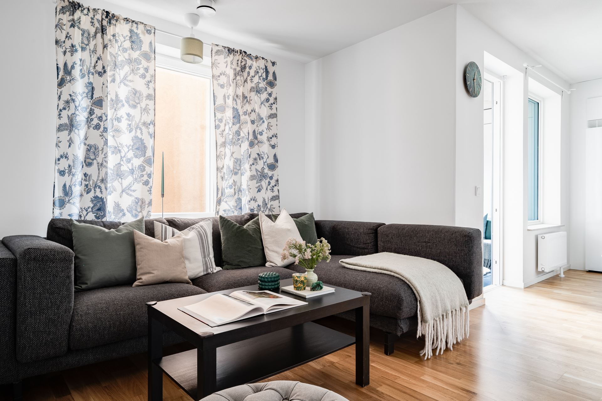 Vidare öppnar vardagsrummet upp med sociala ytor där kök och vardagsrum kombineras i trivsamt öppen planlösning. Plats för soffgrupp och matbord mot köksdelen.