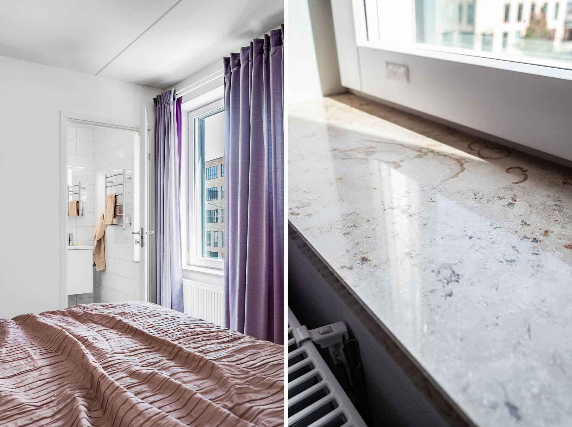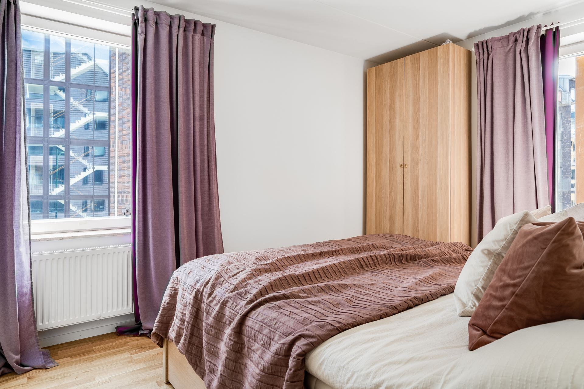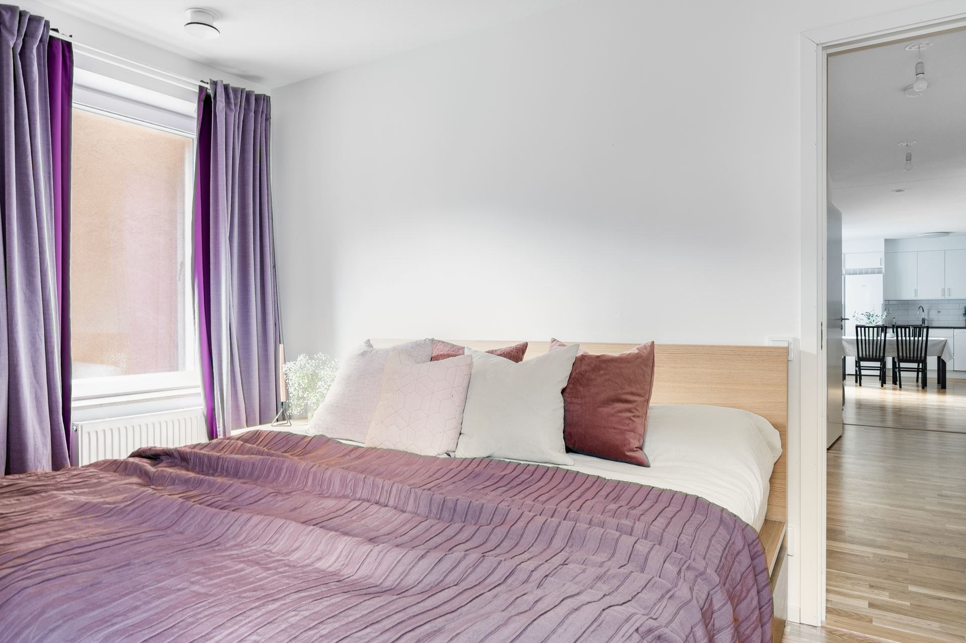 Master bedroom är rymligt till storleken och rymmer gott och väl plats för både dubbelsäng, sängbord och mer därtill. Vita väggar kombineras med solid parkett på golv. Från master bedroom nås även bostadens andra badrum.