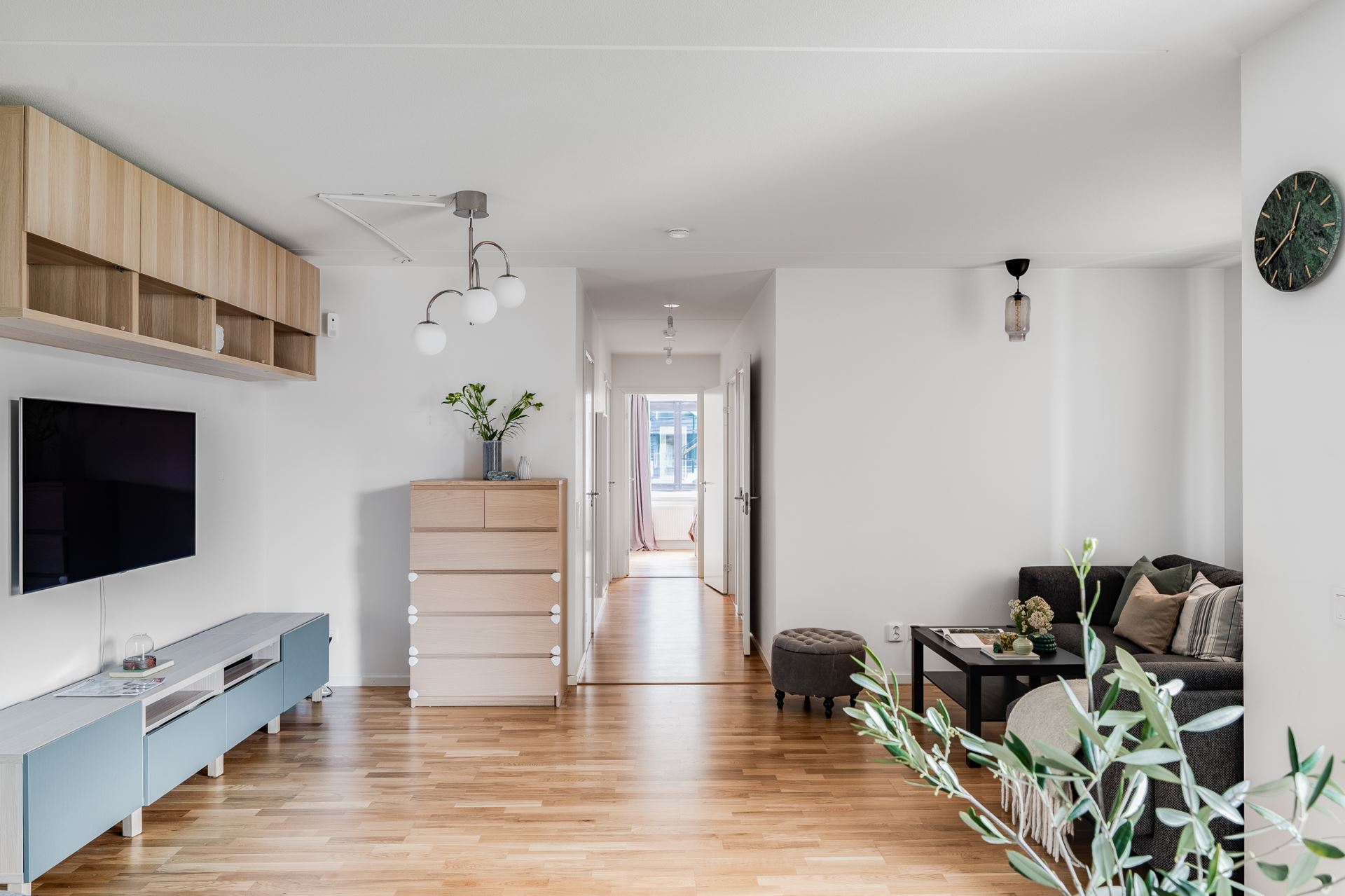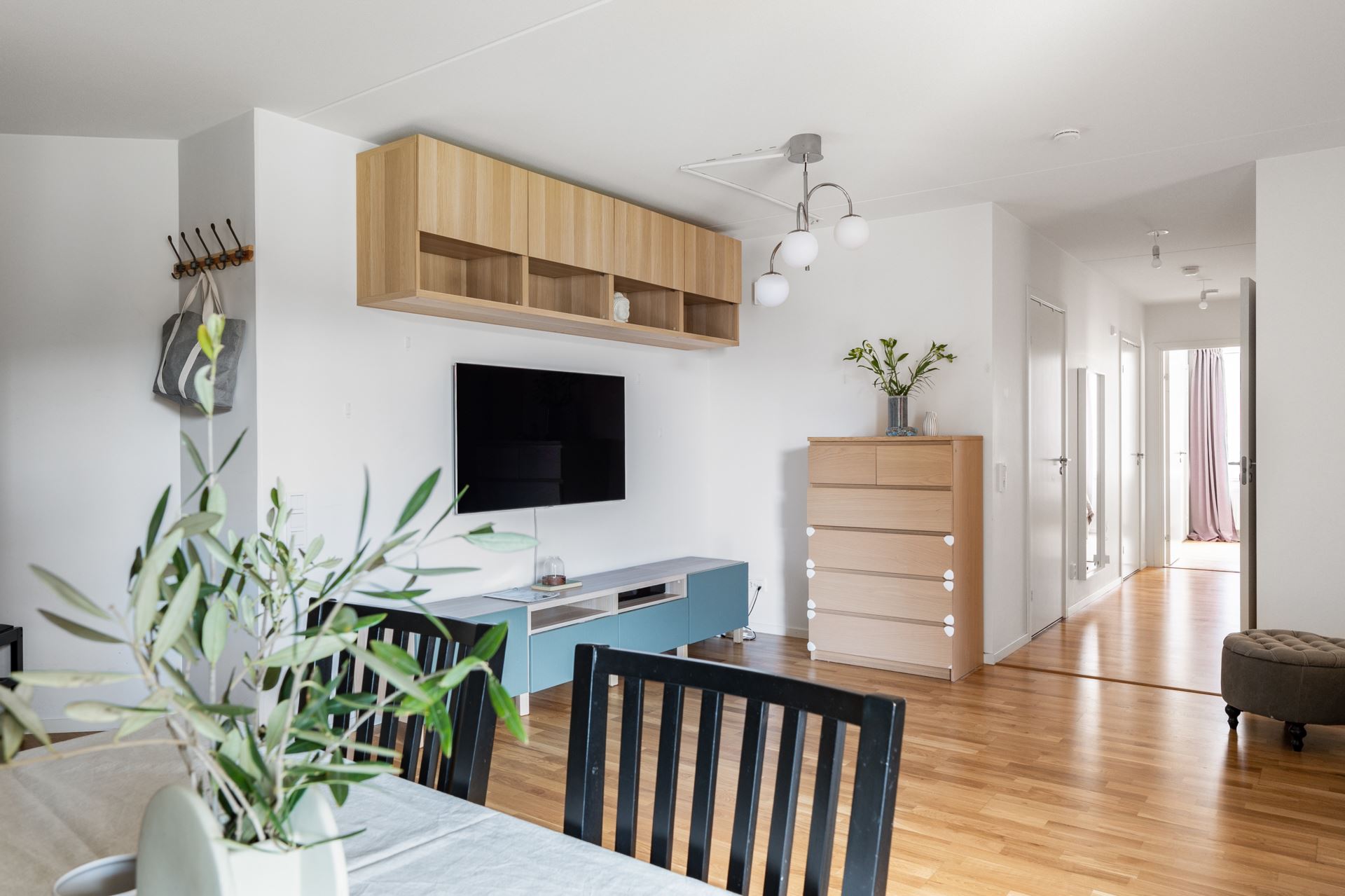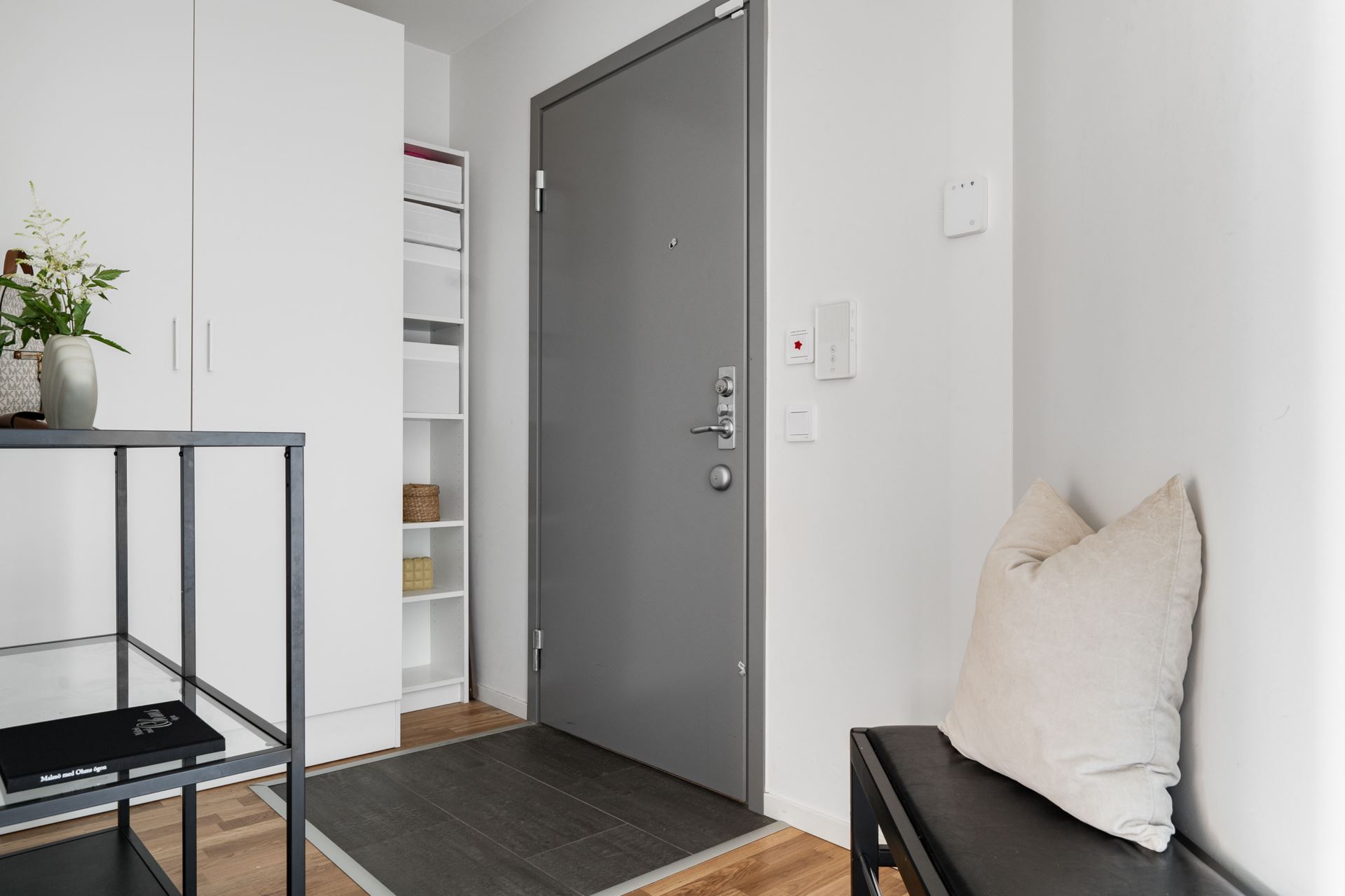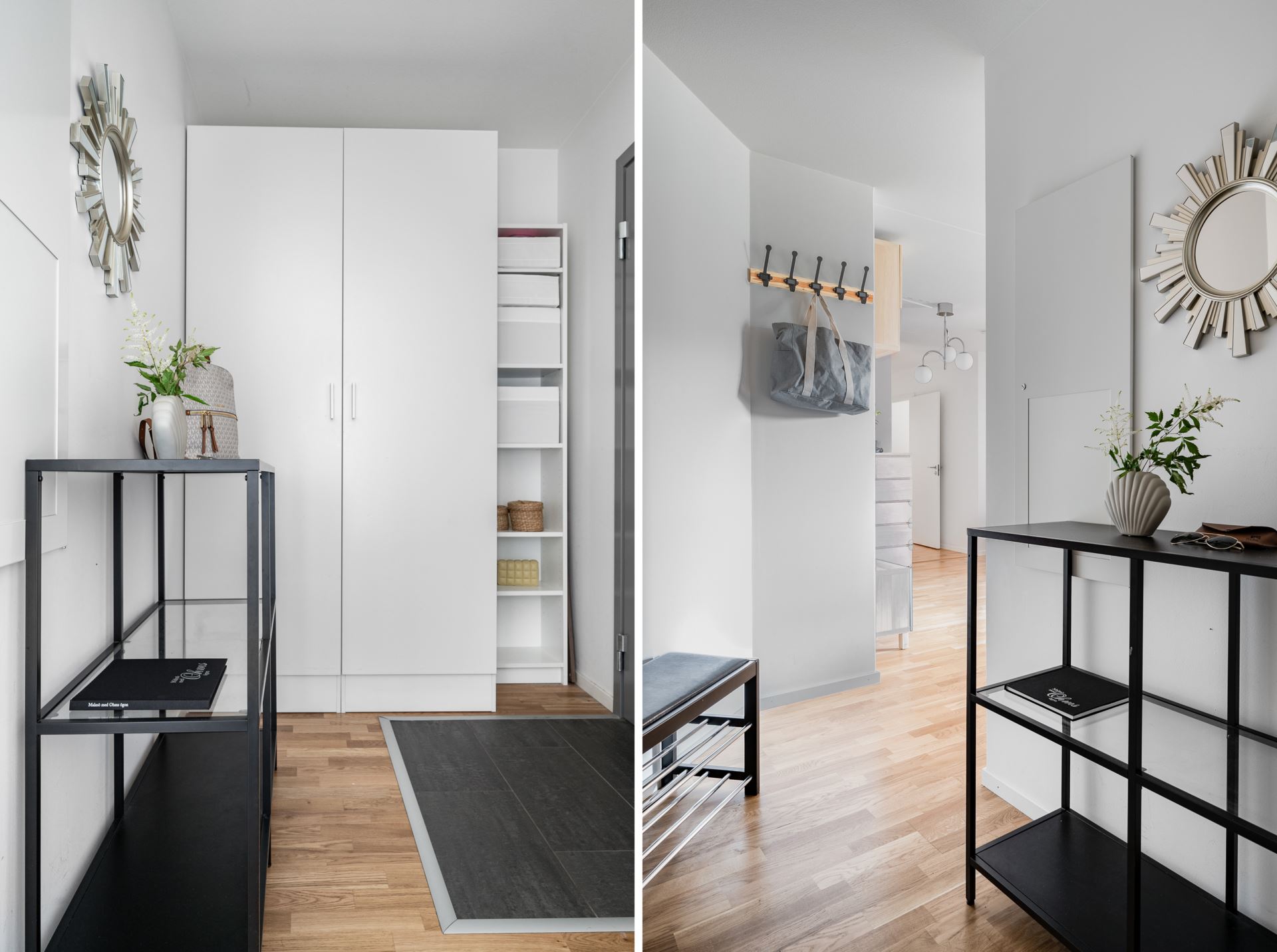 Vi tar hissen till tredje våningen där hallen välkomnar med mörka klinkers på golv tillsammans med släta vita väggar och parkett på golv, vilket är genomgående i hela bostaden. Avhängningsmöjligheter finns i hallen och vidare in finns även en större klädkammare/förråd som rymmer gott om plats till förvaring.
