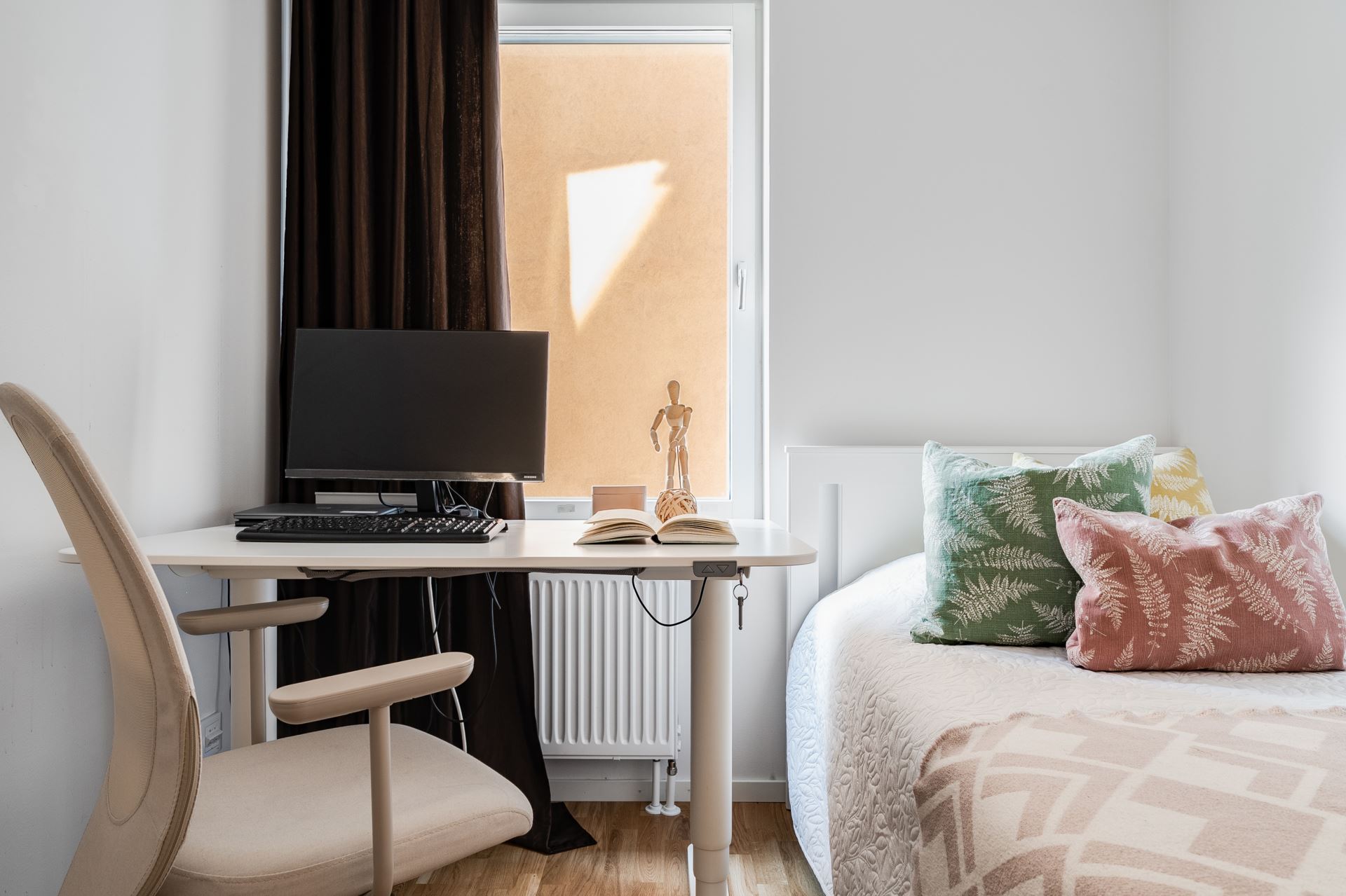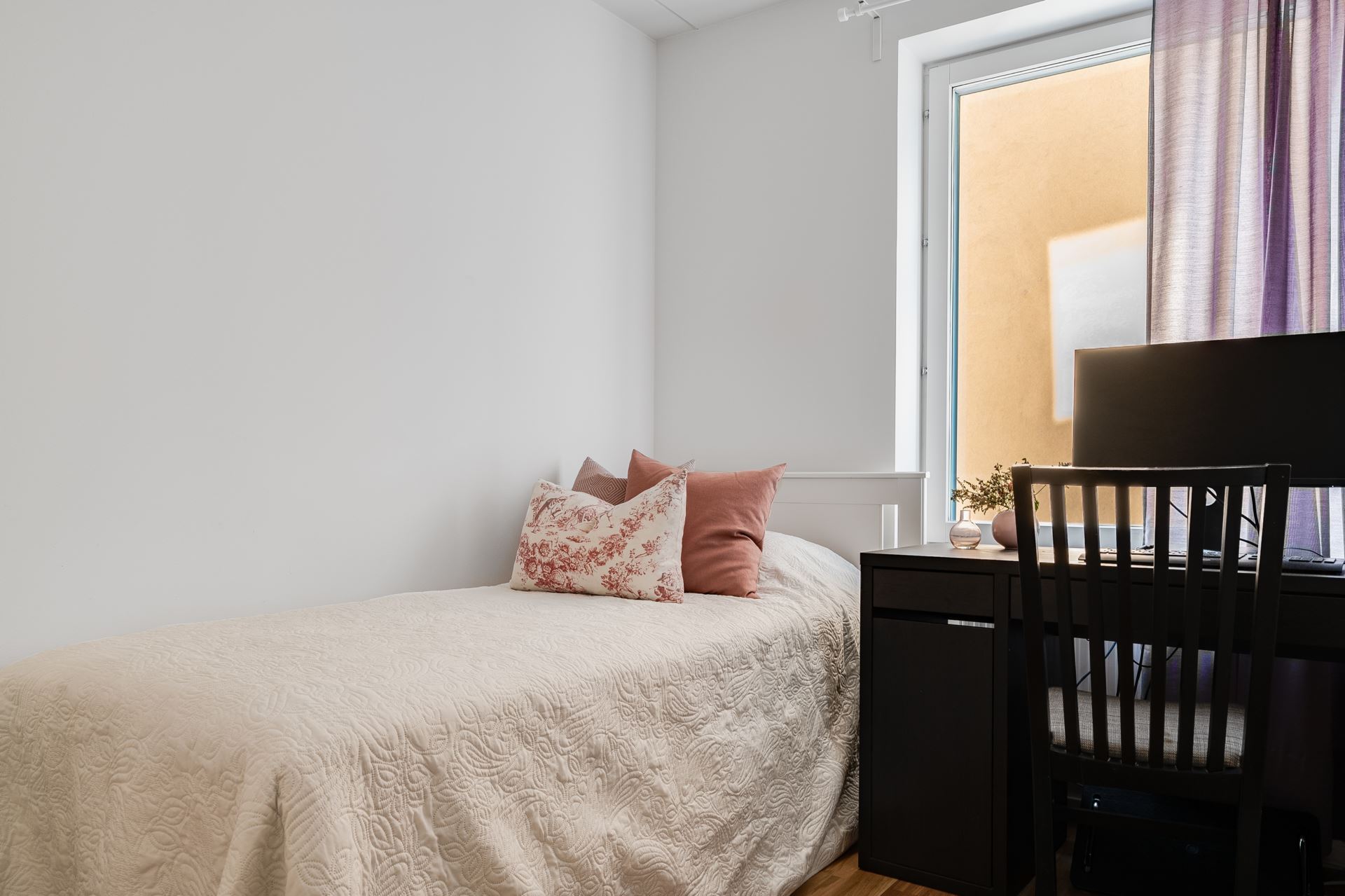 Det tredje sovrummet är i liknande storleken som rummet intill och här bjuds det på släta väggar tillsammans med parkett på golv, vilket återfinns i hela bostaden. Även detta rum passar utmärkt som barnrum eller hemmakontor.