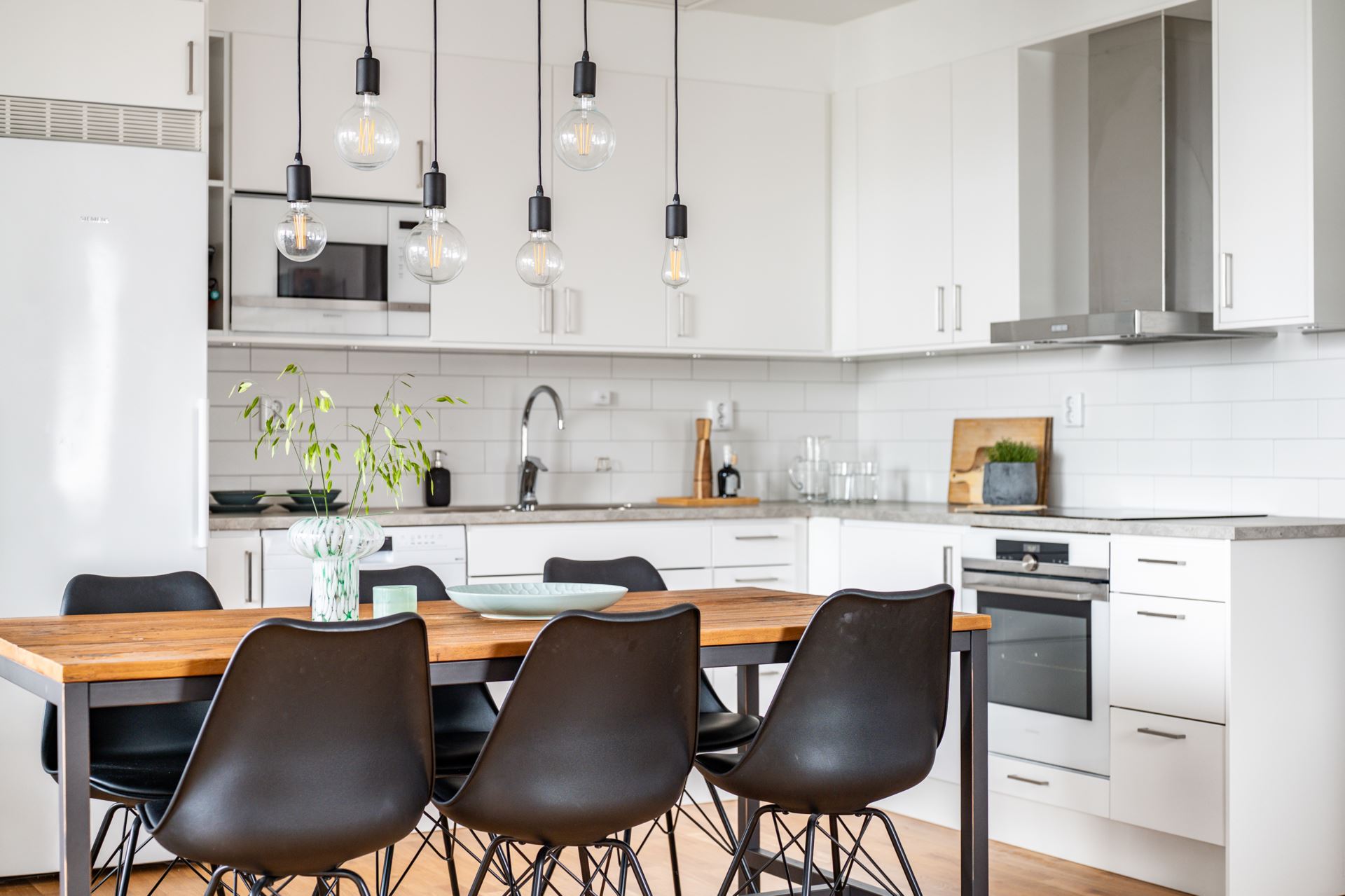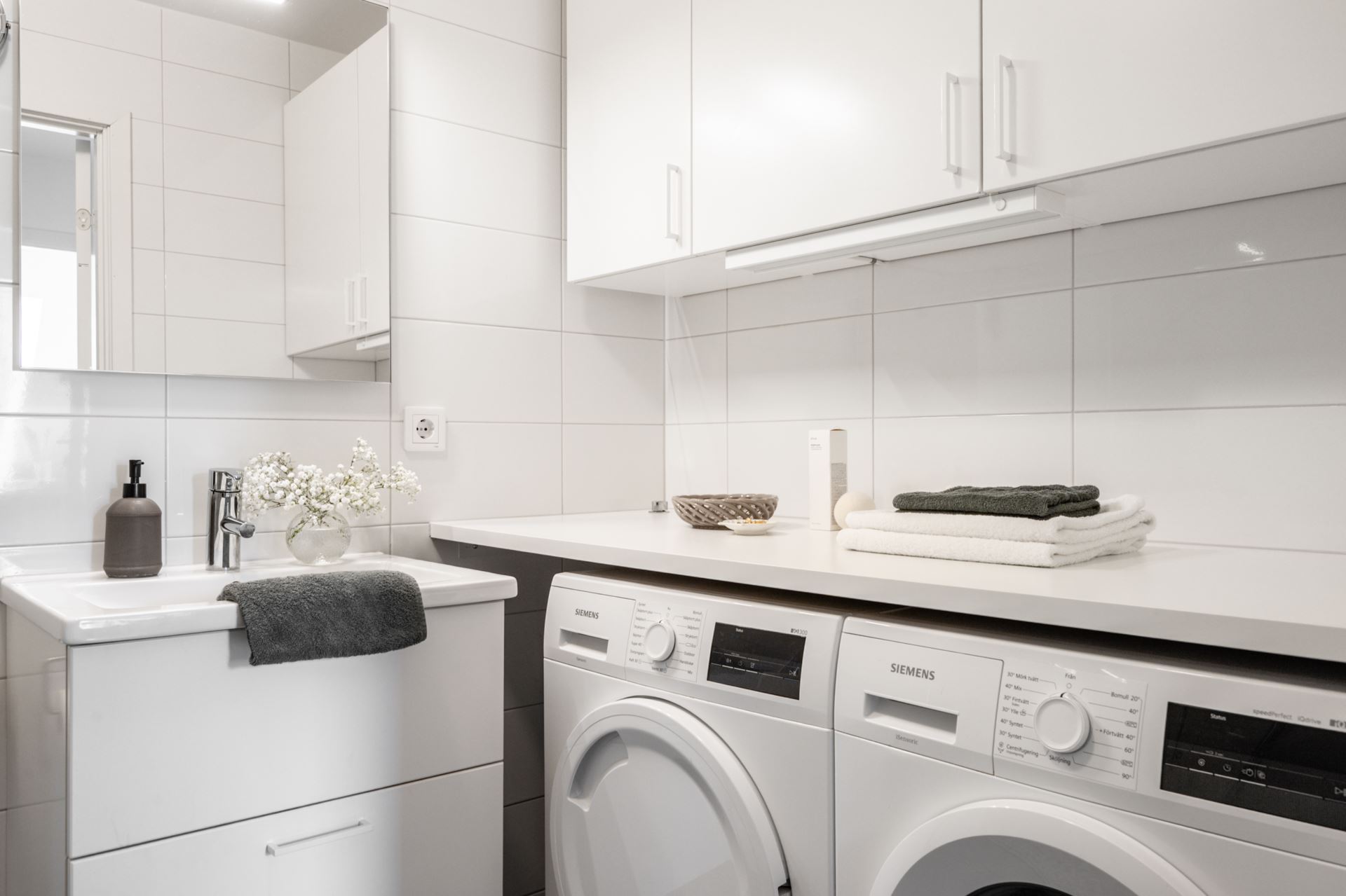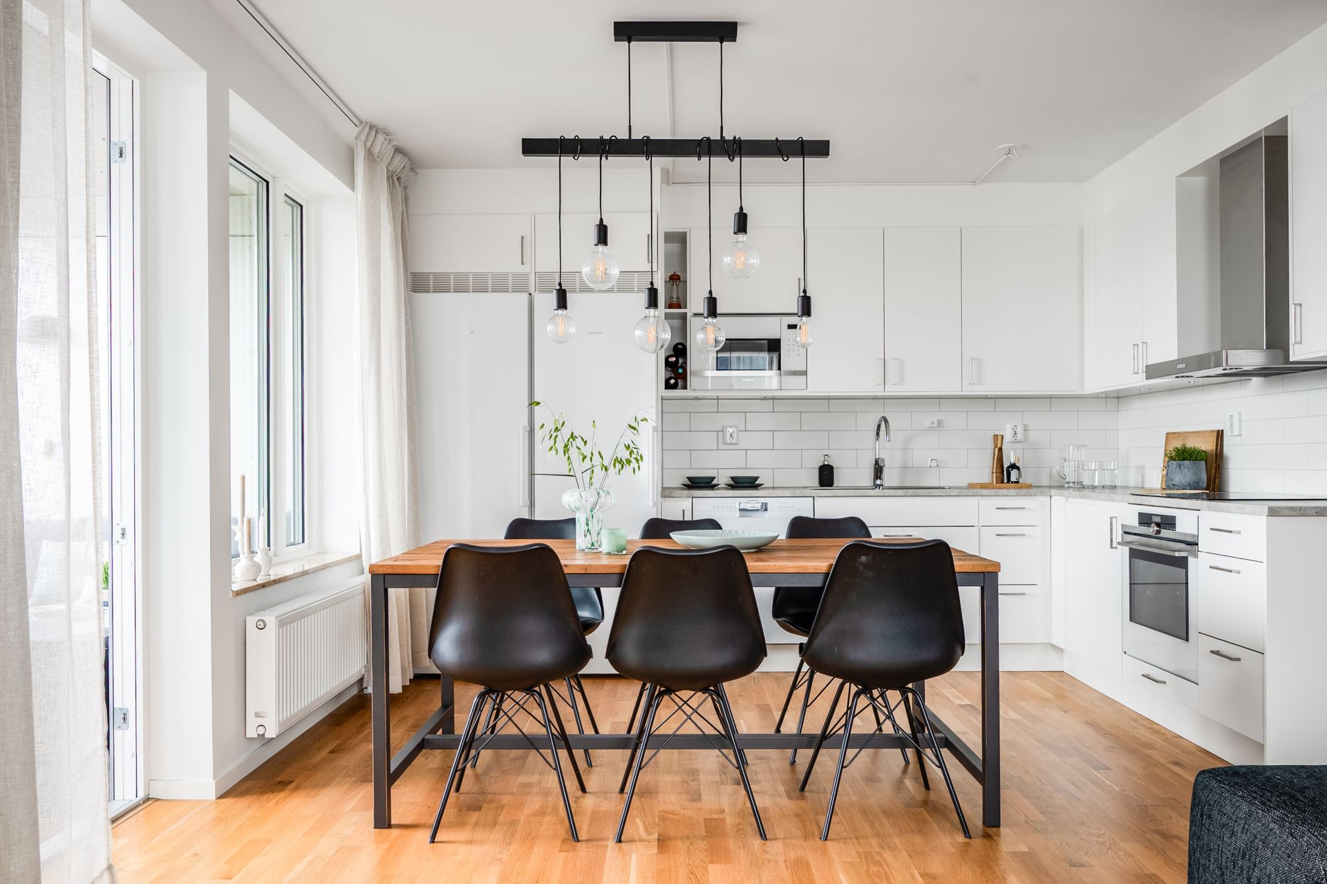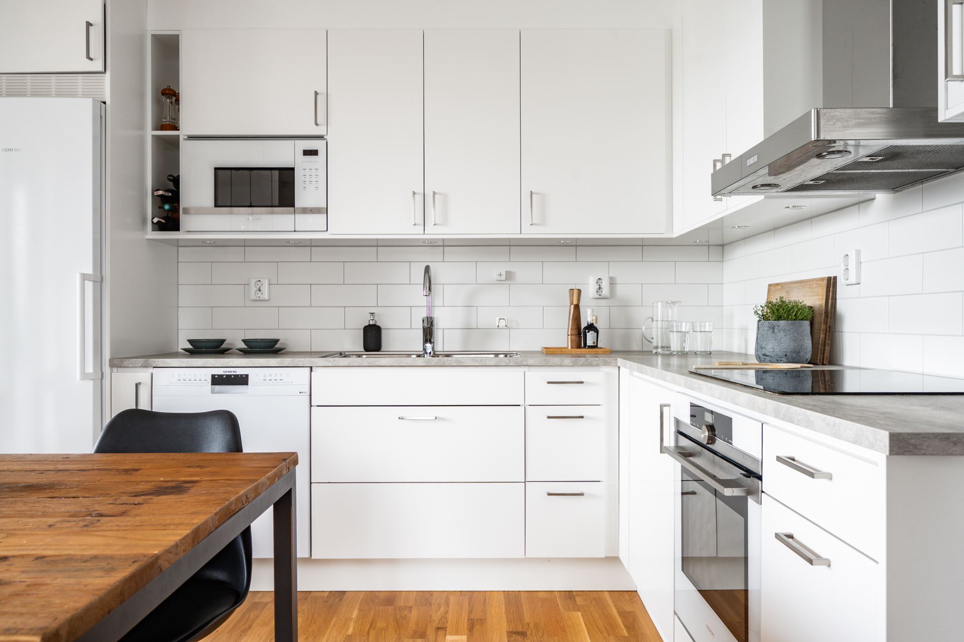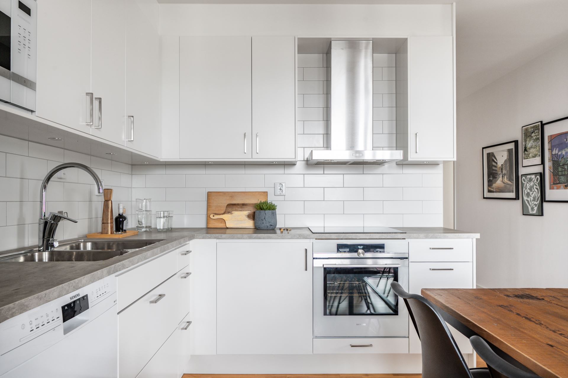 Smakfullt vita köksluckor (Vedum) som kombineras med vitt kakel och bänkskiva i ljus laminat. Köket bjuder på gott om plats till både arbetsytor och förvaring bakom skåp och luckor. Köket är utrustat med diskmaskin, kyl/frys, induktionshäll, ugn och mikrovågsugn. Samtlig utrustning från Siemens. Fläkt (Franke).