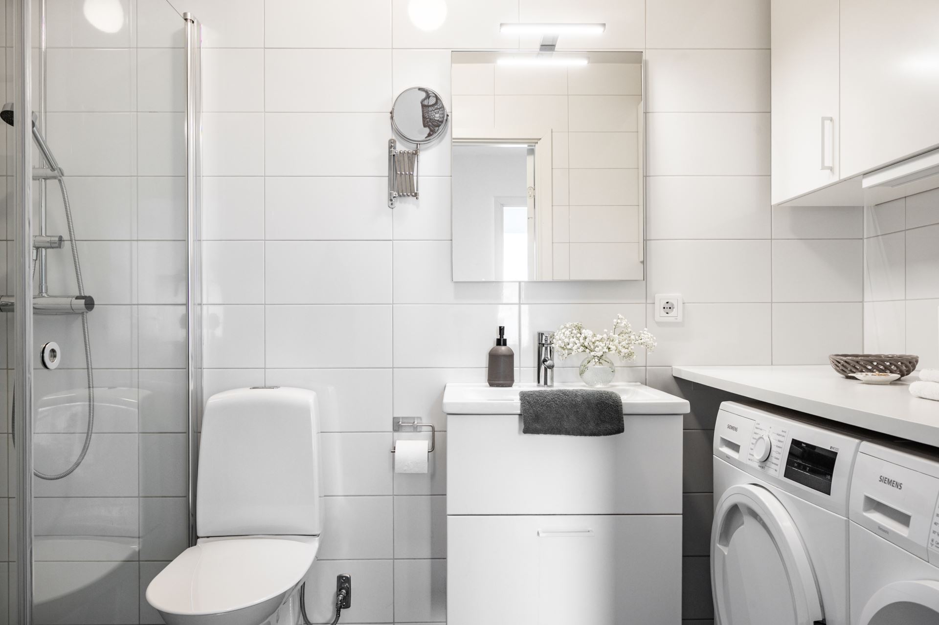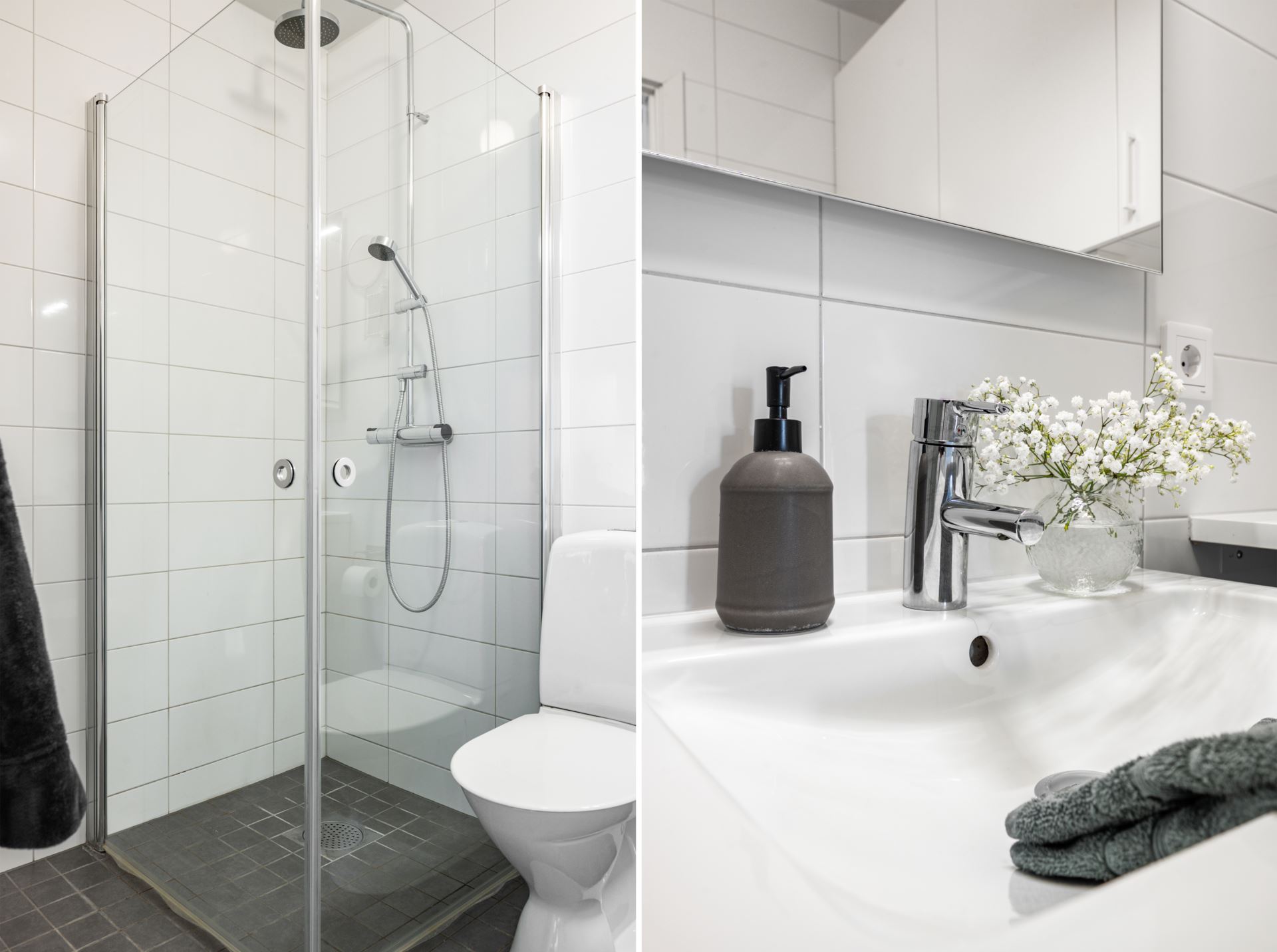 Helkaklat badrum med grått klinkergolv tillsammans med vitt kakel. Badrummet är utrustat med dusch bakom vikbara glasdörrar, handfat med kommod (Vedum), wc, handdukstork, tvättmaskin och torktummlare (Siemens). Skåpsförvaring (Vedum, sandbeige) finns dessutom ovanför här.