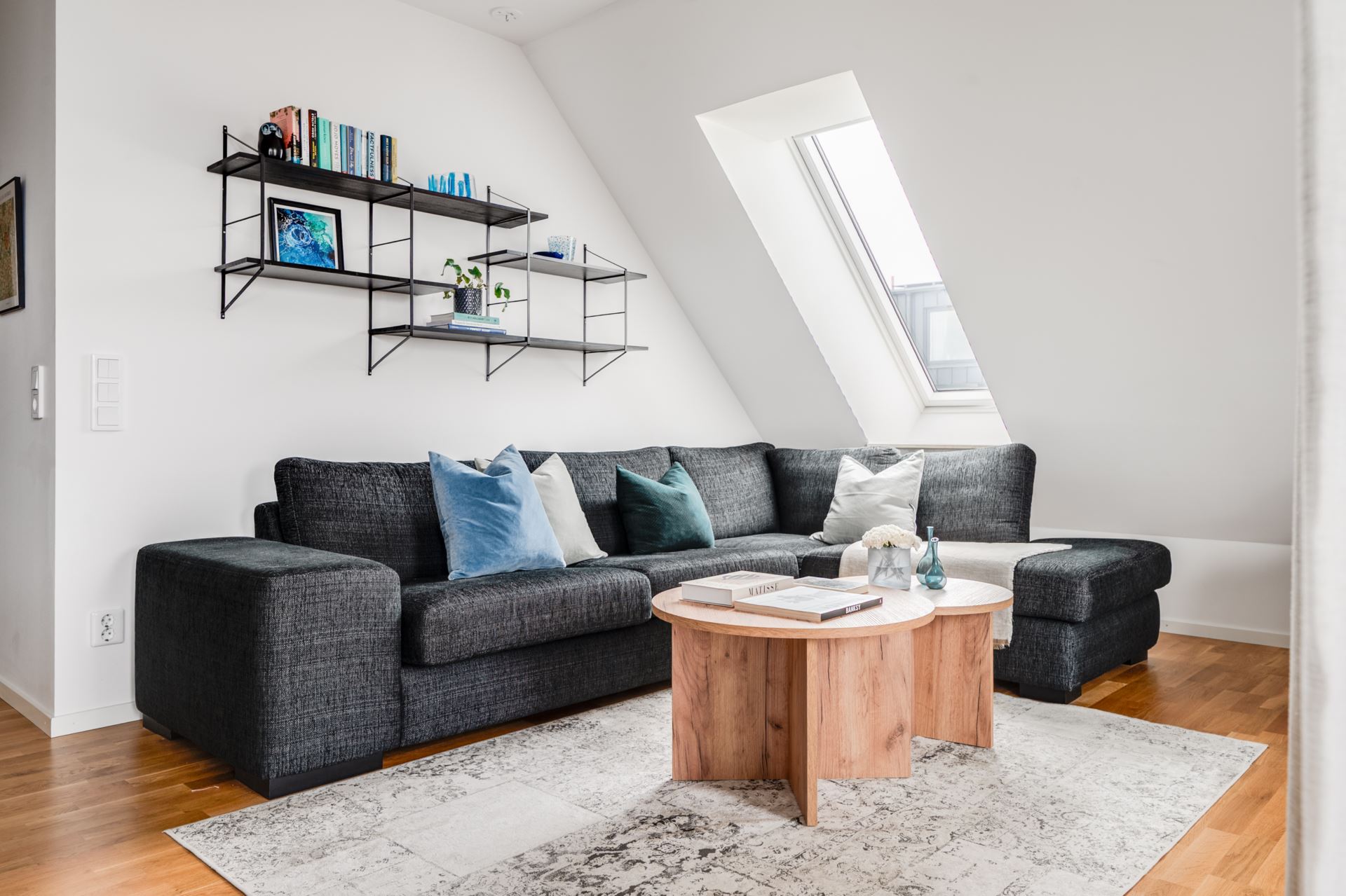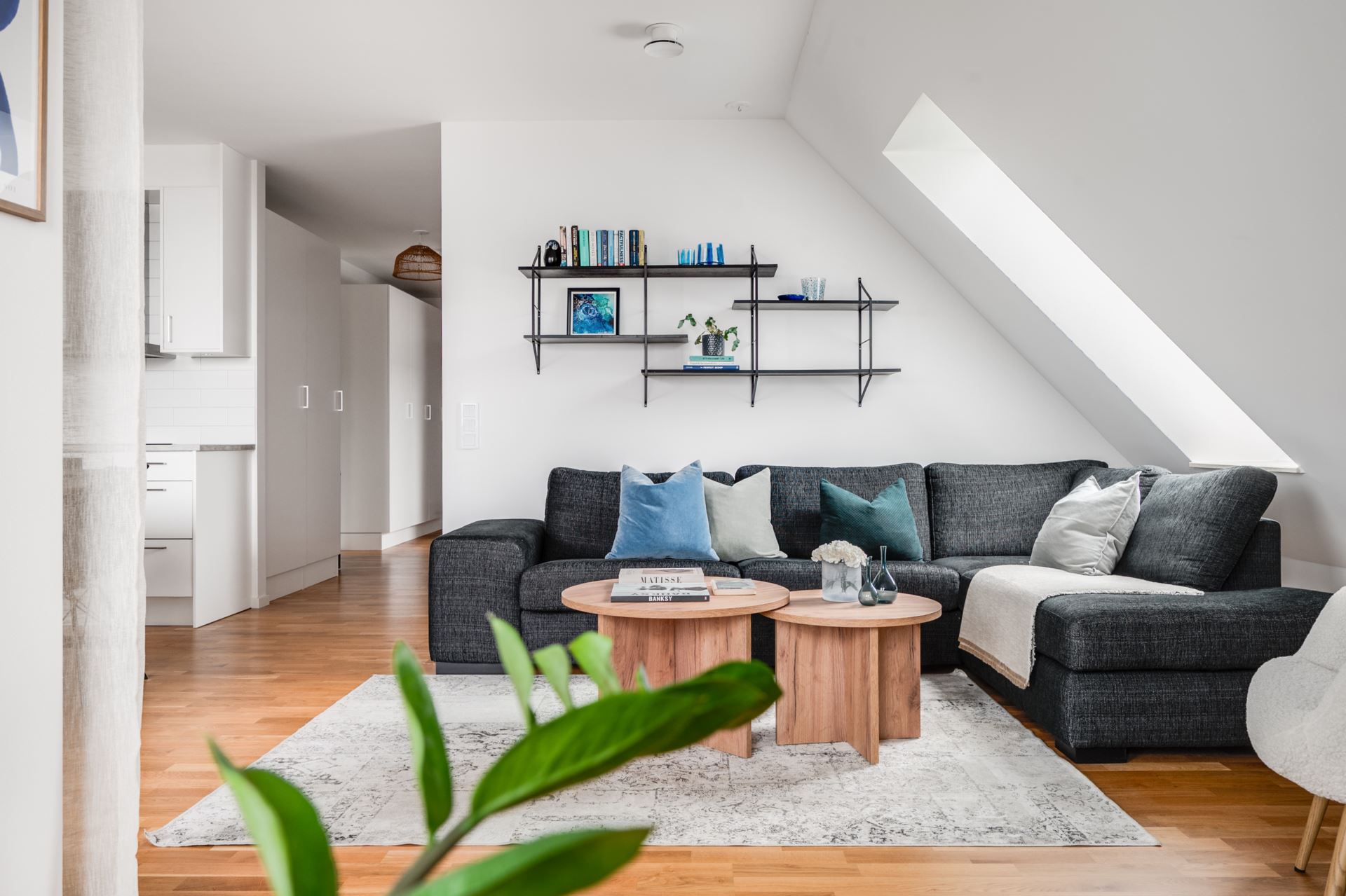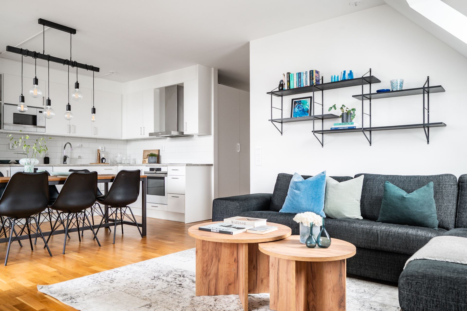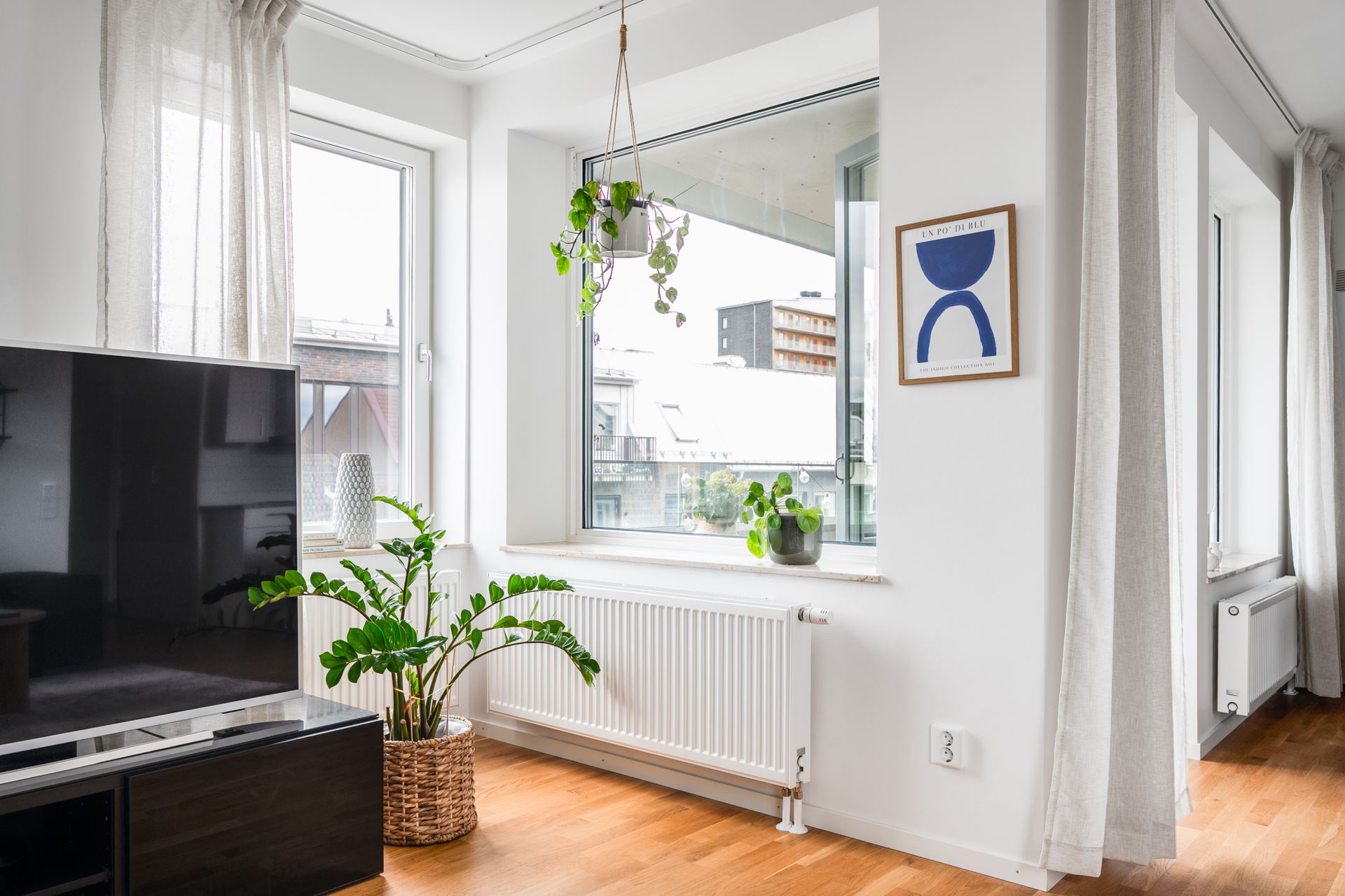 Vidare öppnar lägenheten upp med ljus och rymd tack vare stora fönsterpartier i två väderstreck, vardagsrummet som enkelt kan möbleras med soffgrupp och matbord mot köksdelen. Här kombineras smakfullt vita väggar tillsammans med ekparkett på golv. Från vardagsrummet når vi dessutom balkongen där vi kan njuta av förmiddagssolen, här finns plats för att möblera efter behov.
