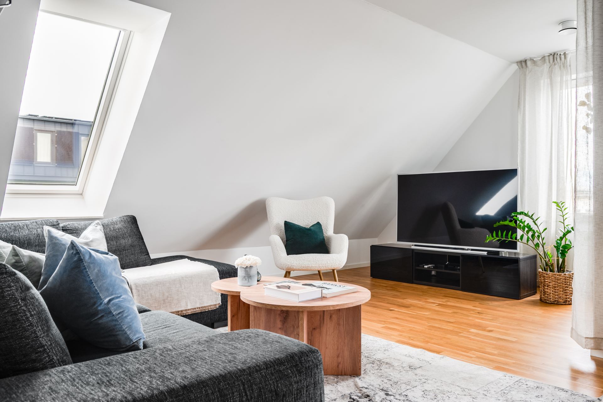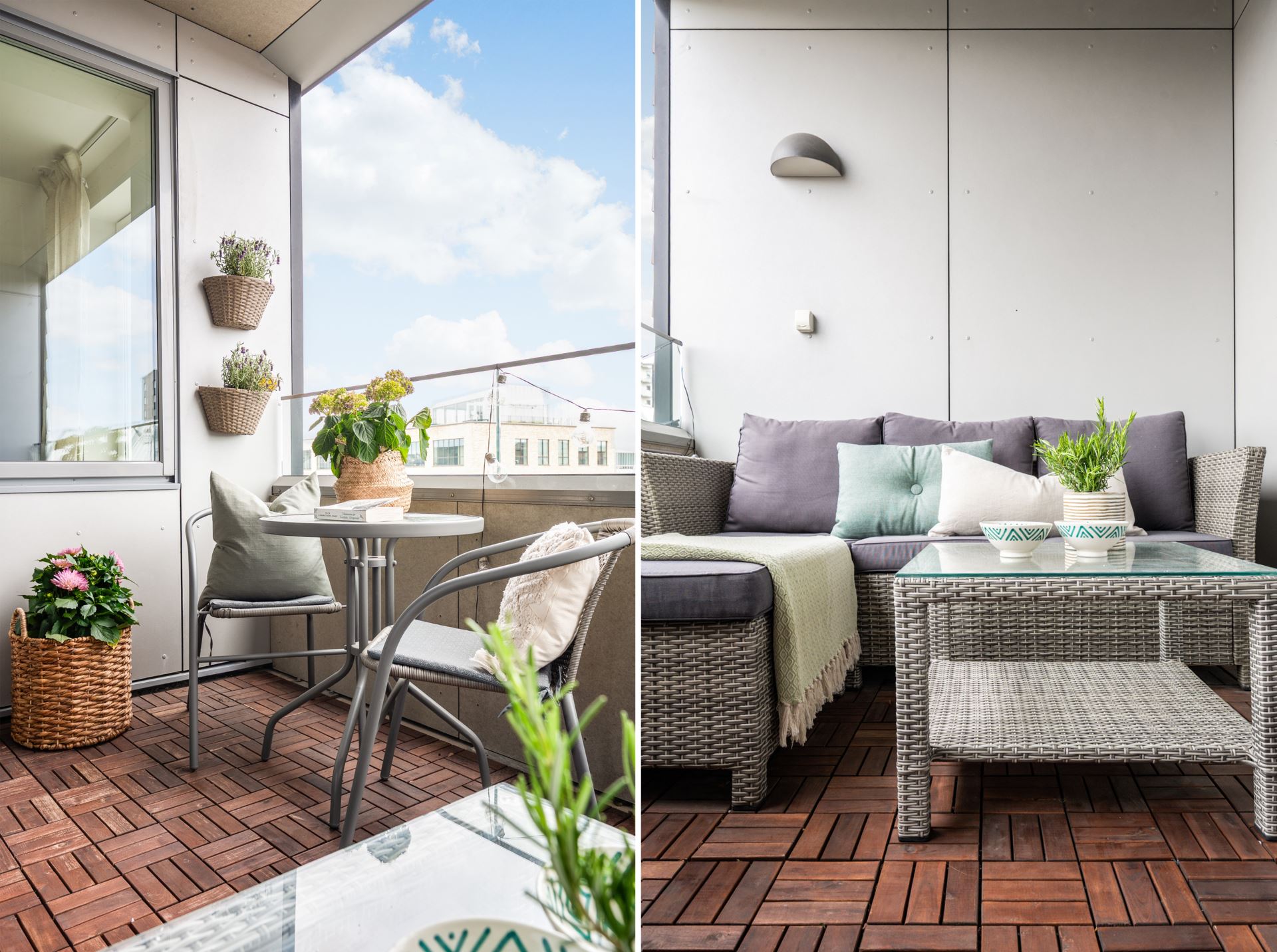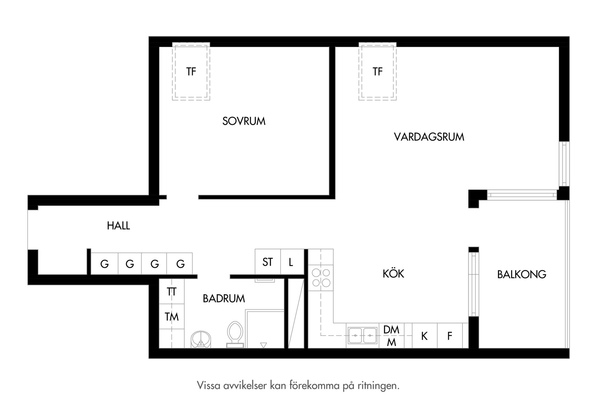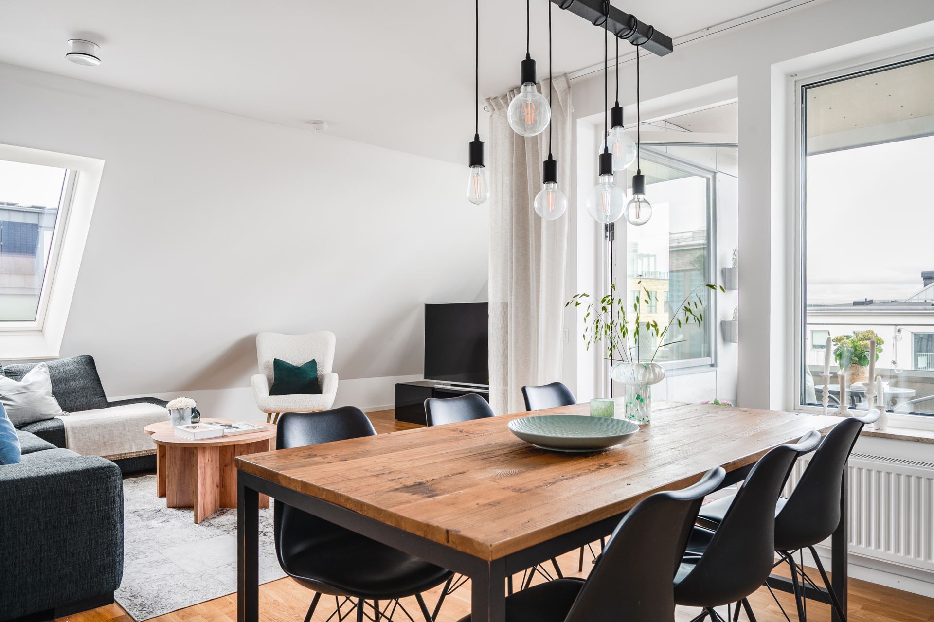 Vidare öppnar lägenheten upp med ljus och rymd tack vare stora fönsterpartier i två väderstreck, vardagsrummet som enkelt kan möbleras med soffgrupp och matbord mot köksdelen. Här kombineras smakfullt vita väggar tillsammans med ekparkett på golv. Från vardagsrummet når vi dessutom balkongen där vi kan njuta av förmiddagssolen, här finns plats för att möblera efter behov.