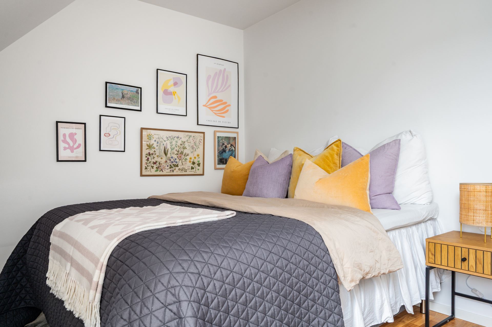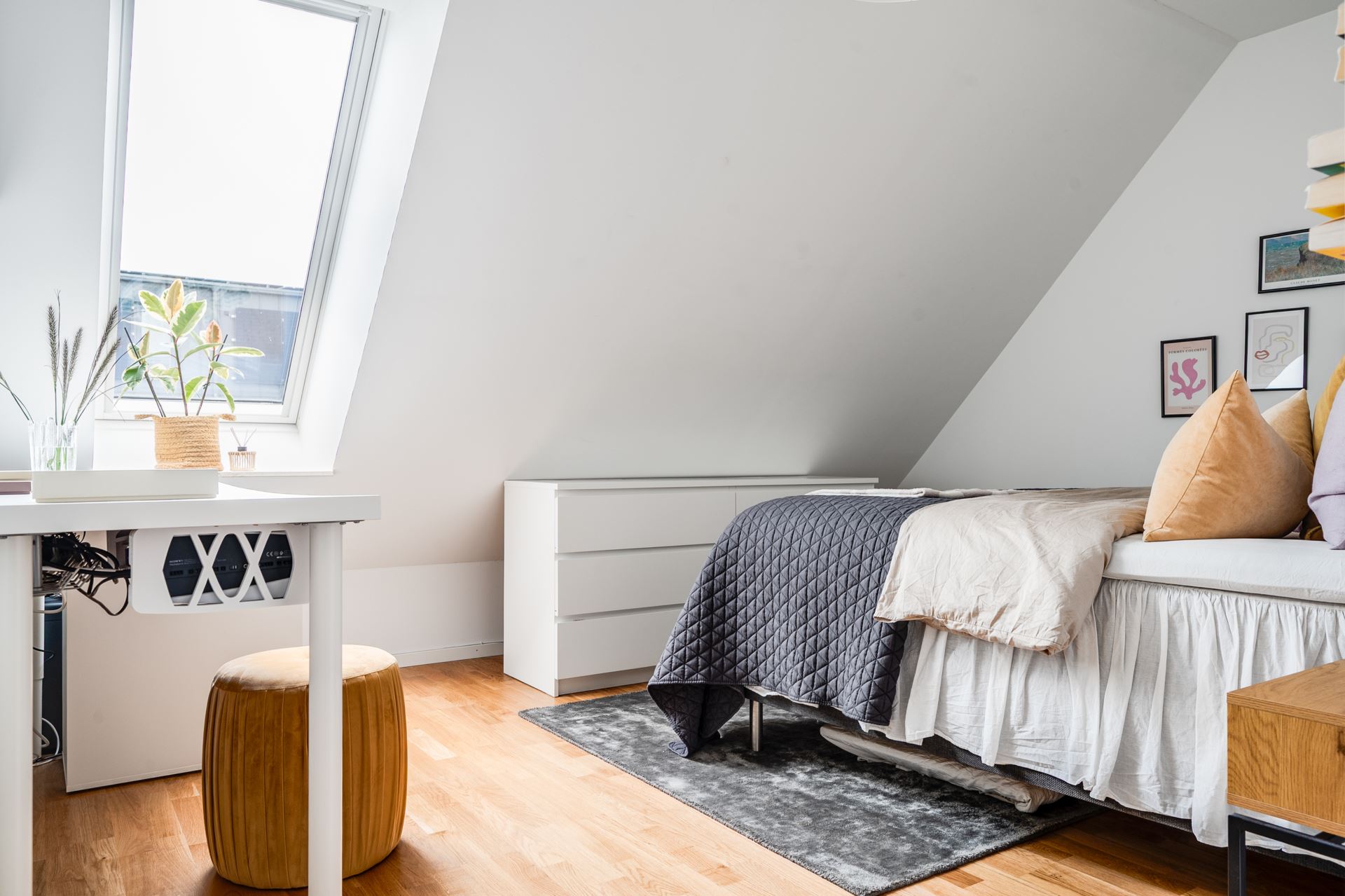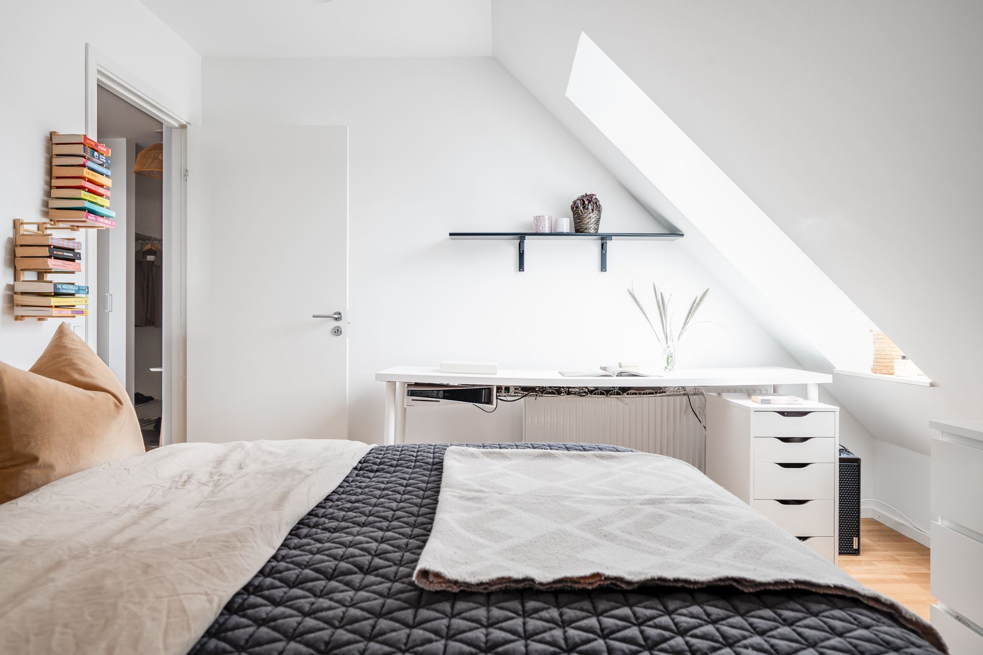 Vidare ligger det mysiga sovrummet som rymmer gott om plats för dubbelsäng, sängbord och ytterligare förvaringsmöbler. Praktiskt utrymme som kan nyttjas på många vis.