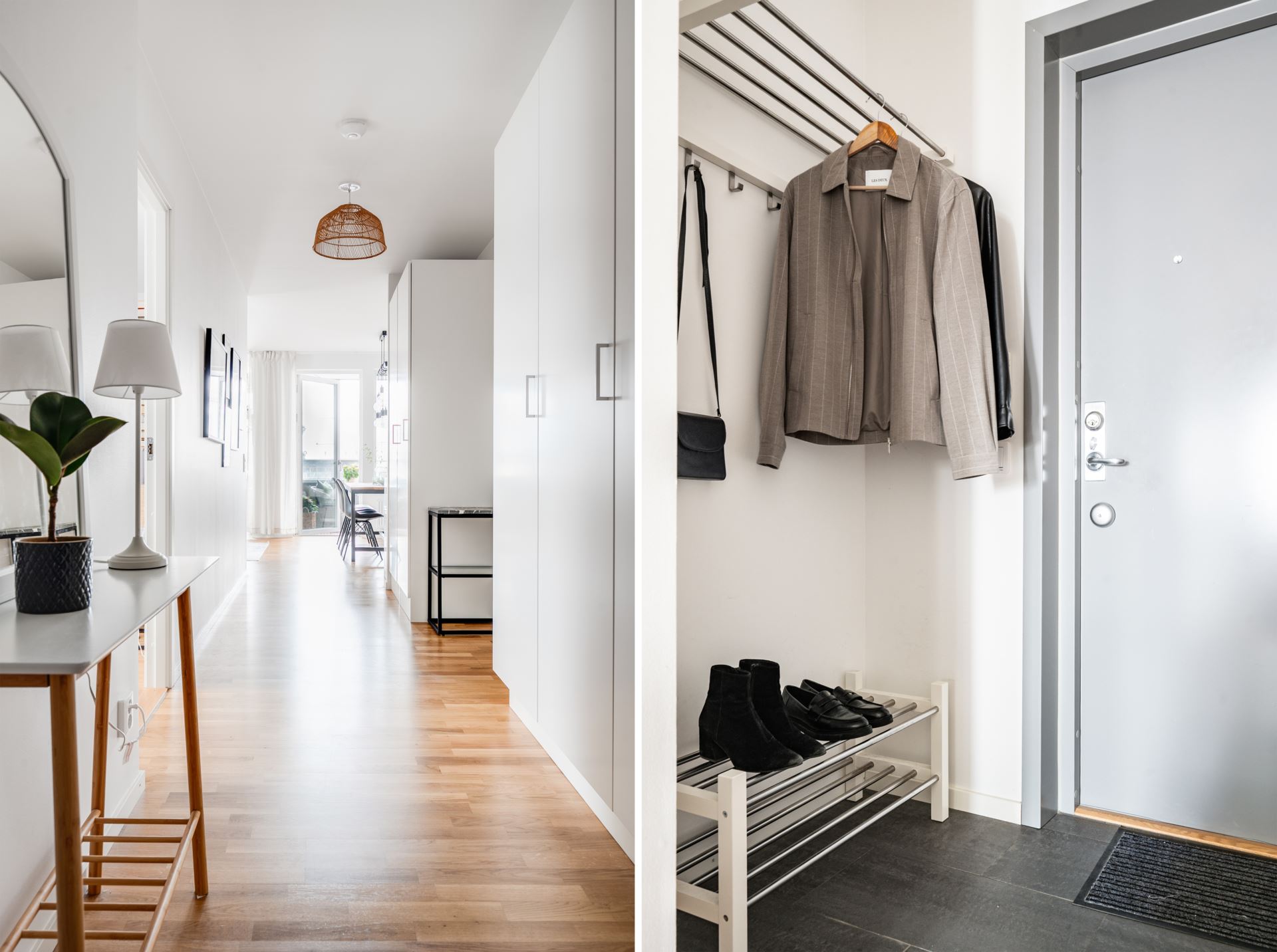 Vi tar hissen högst upp i huset till våning 6 där vi välkomnas in i rymlig hall som bjuder på klinkers på golv, vilket sedan övergår till ekparkett i resterande av lägenheten. Gott om plats för både avhängning och ytterligare förvaring i garderober (Vedum) längst med höger sida.