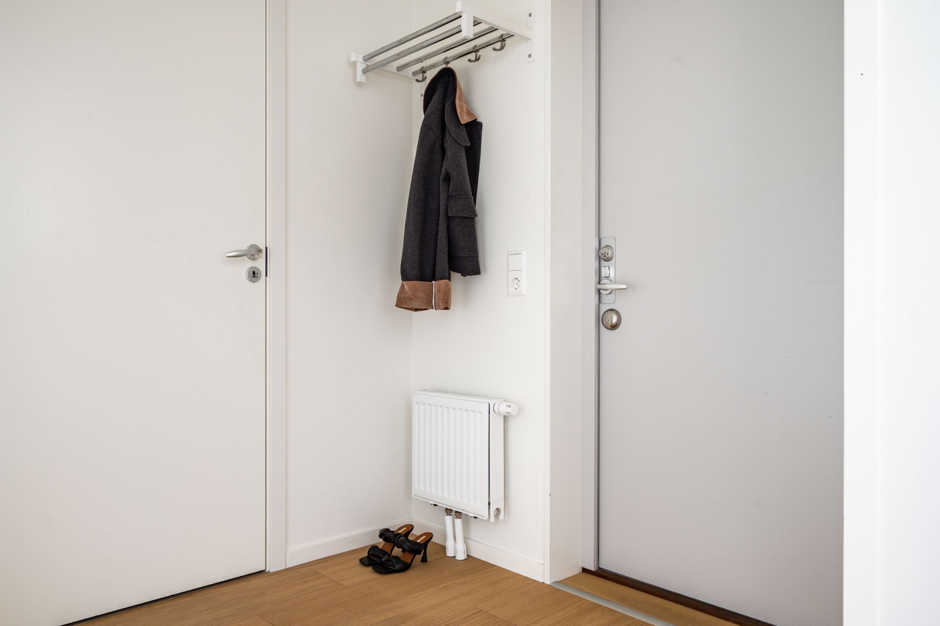 Vi tar hissen högst upp i huset och möts av hallen som är rymlig och inbjudande med tidlöst parkettgolv i samspel med ljusa väggar, ett tema som genomsyrar hela bostaden och skapar en fin sammanhängande känsla. Här i finns dessutom en stor klädkammare, här ryms gott om plats för både kläder och skor.