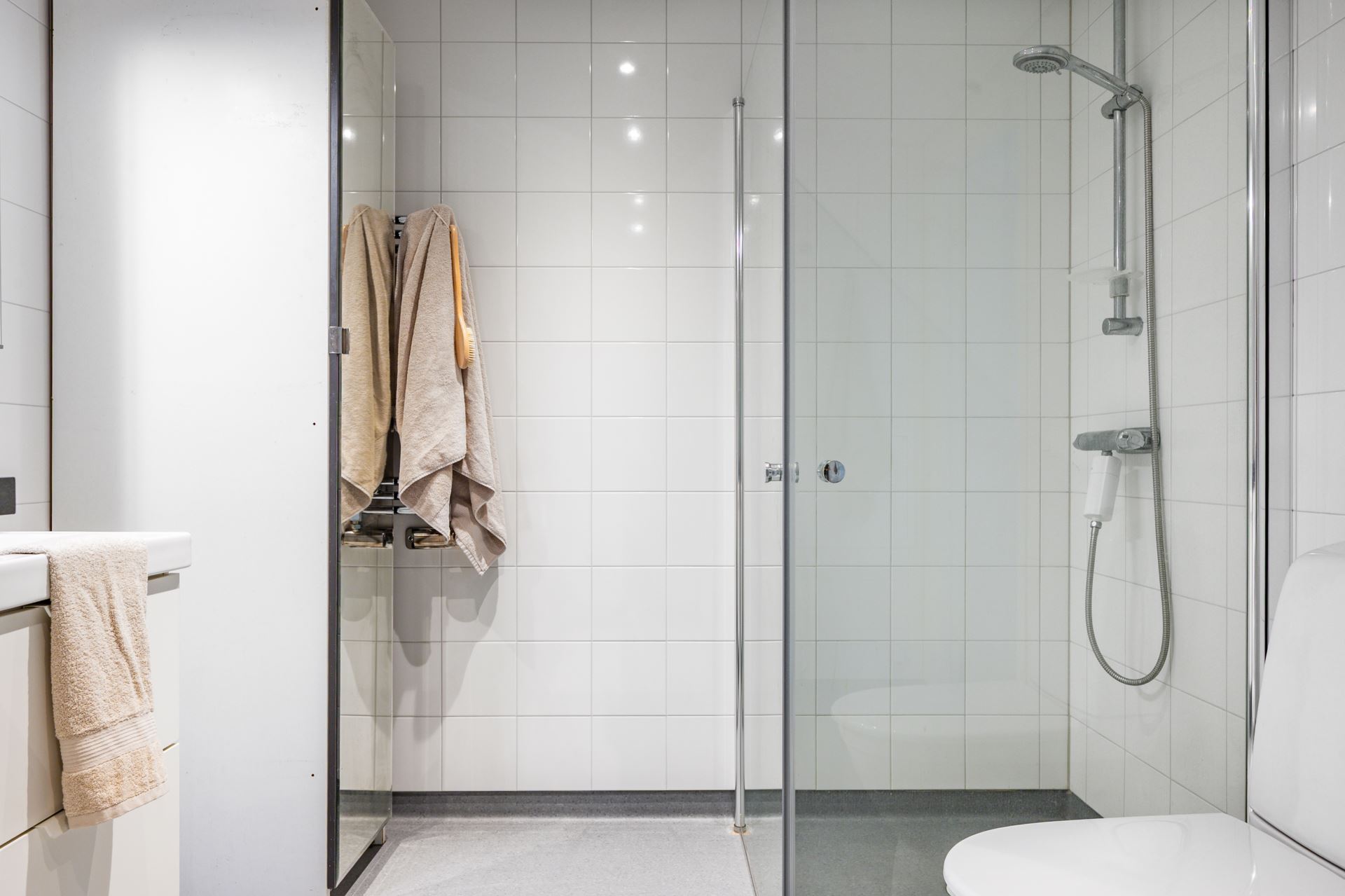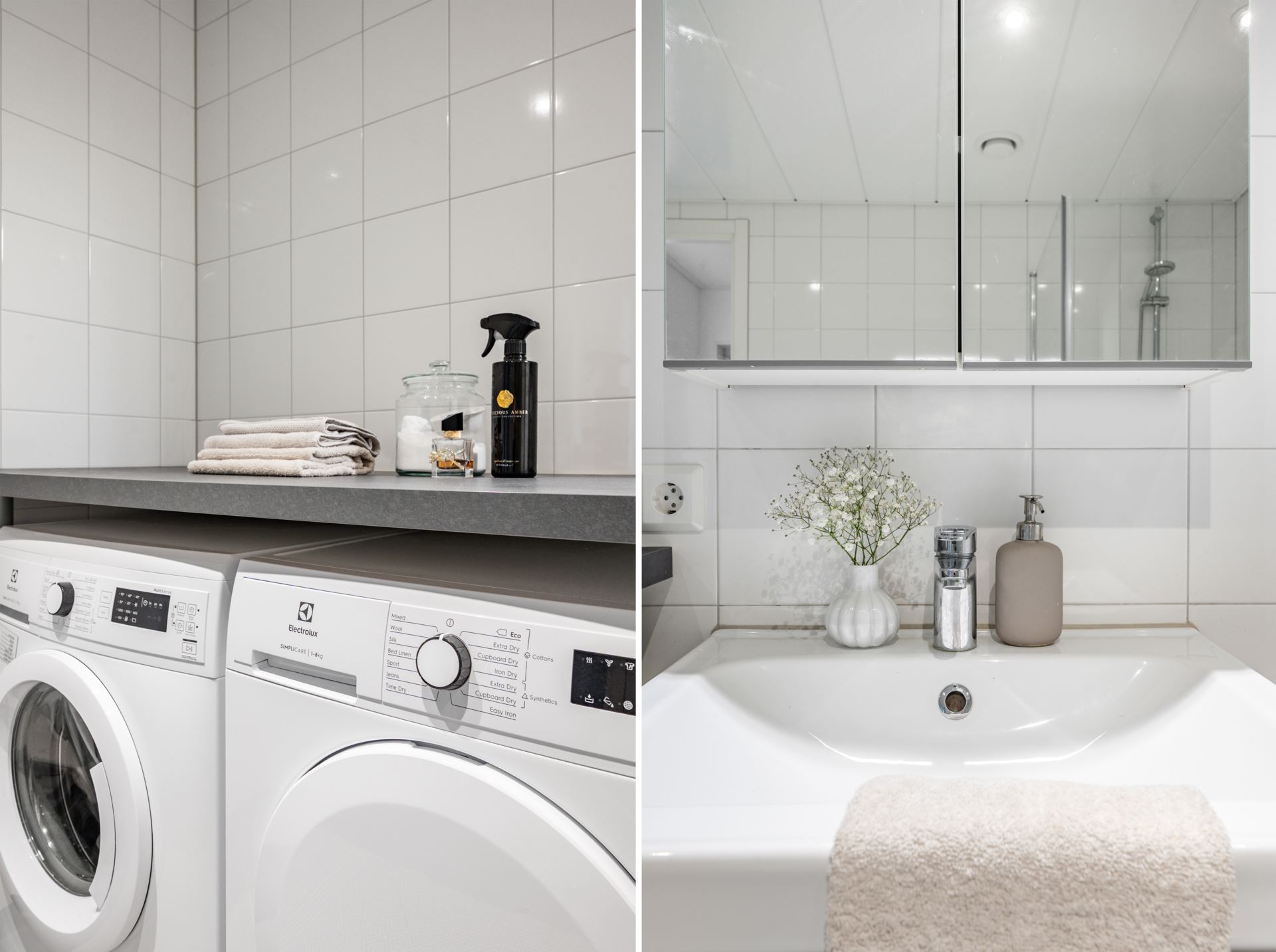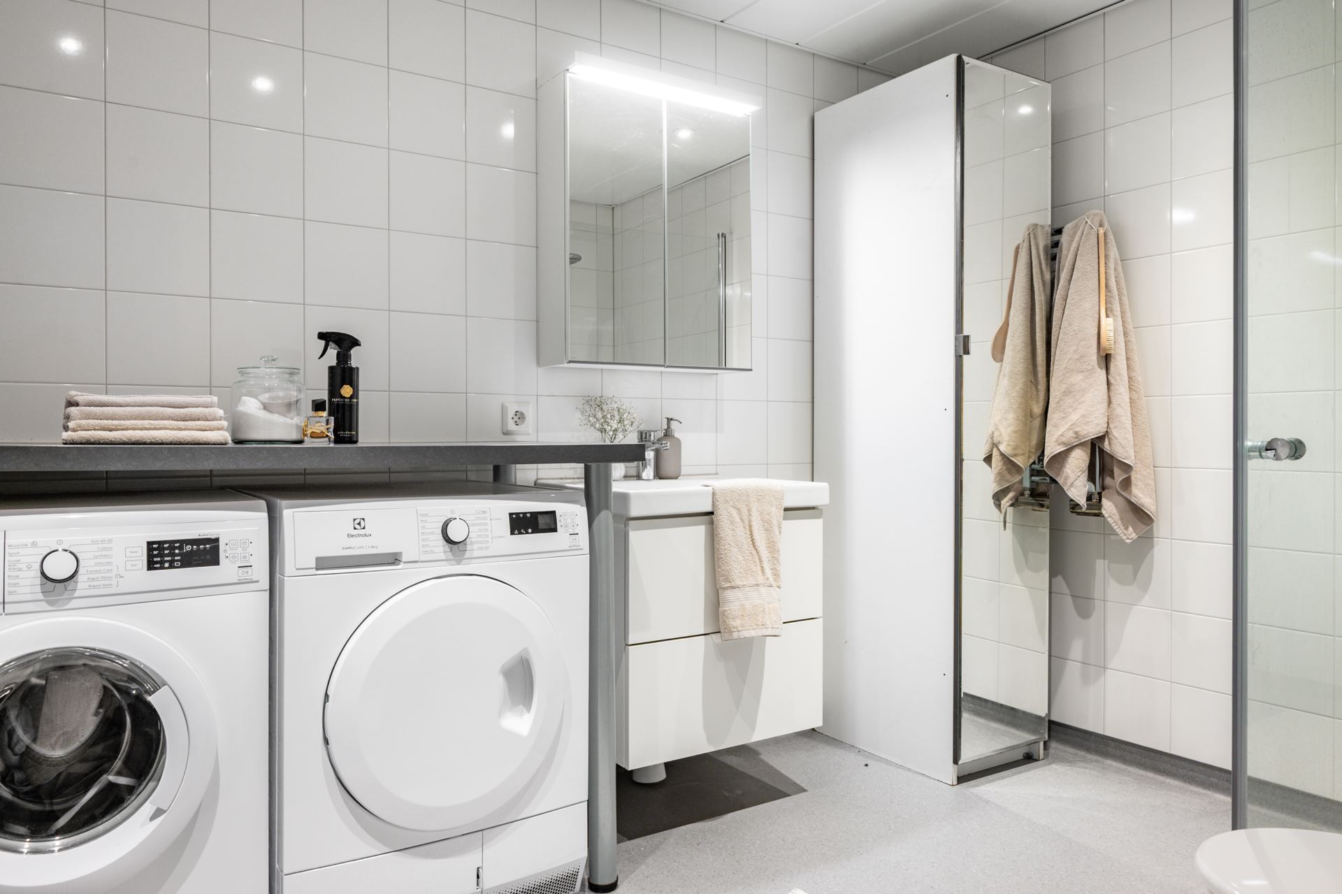 Badrum med vitt kakel på väggarna tillsammans med ljusgråa plastmatta på golv. Badrummet är utrustat med dusch bakom glasvägg, wc, handfat med kommod, spegelskåp, handdukstork, tvättmaskin och torktumlare. Arbetsyta finns dessutom ovanför tvätt,- och tork.