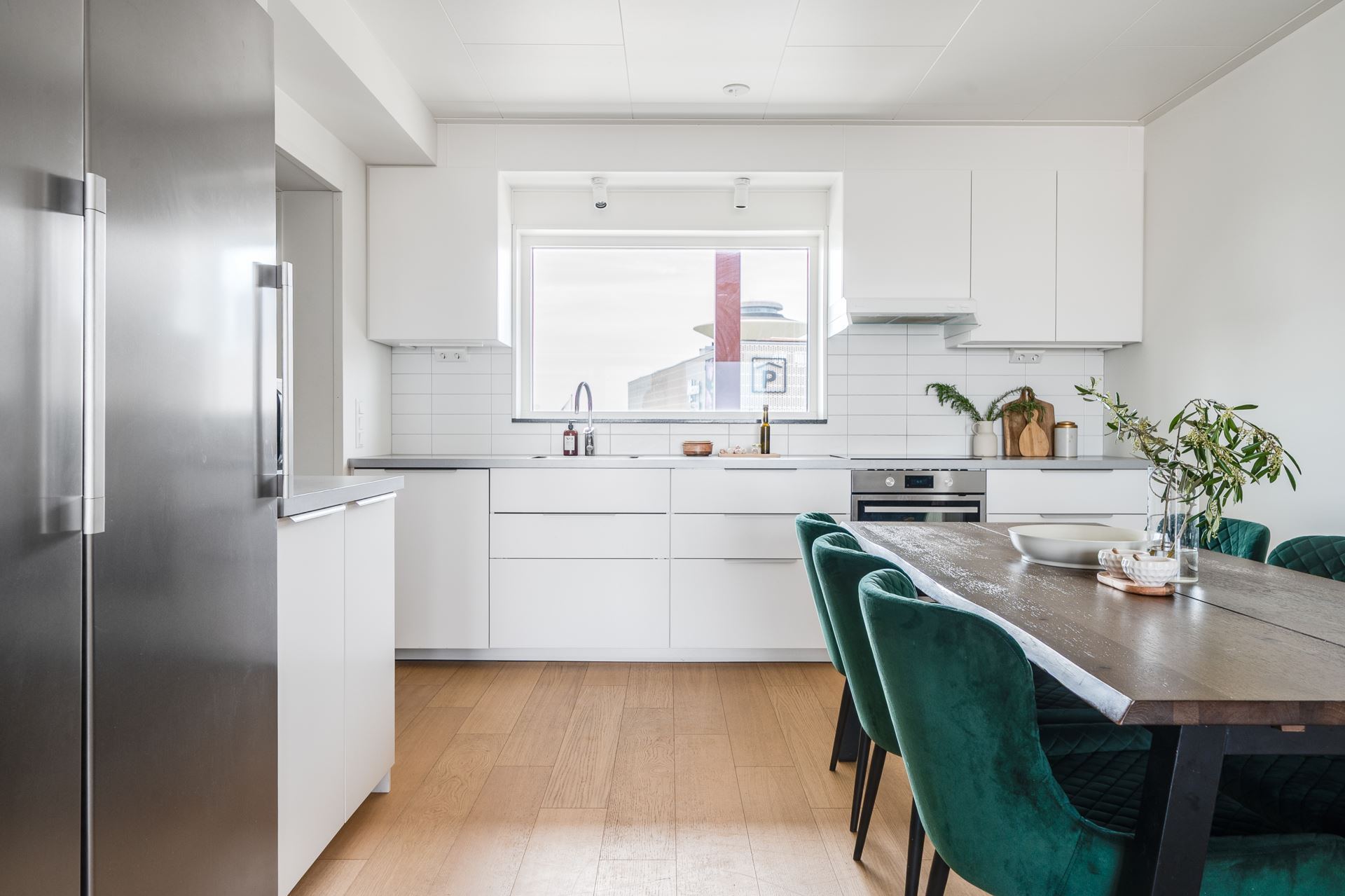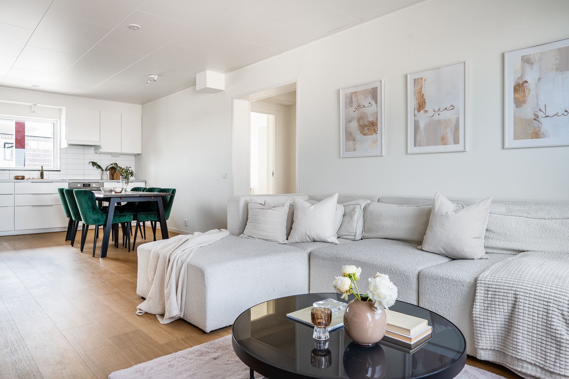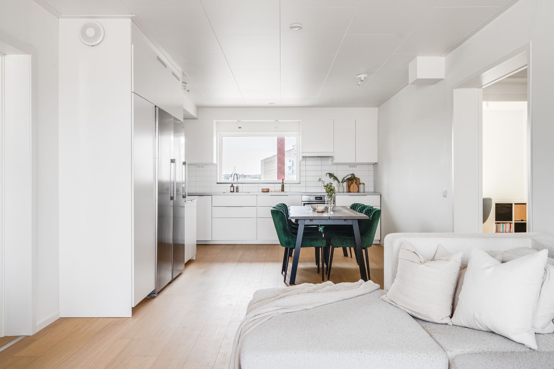 Trivsamt öppen planlösning mellan kök och vardagsrum och fint ljusinsläpp till hela rummet tack vare stora fönsterpartier. I vardagsrummet finns plats för både soffgrupp och större matbord mot köksdelen. Ekparkett på golv kombineras fint med släta vita väggar. Från vardagsrummet når vi även den sköna balkongen, med gott om plats för möblering!