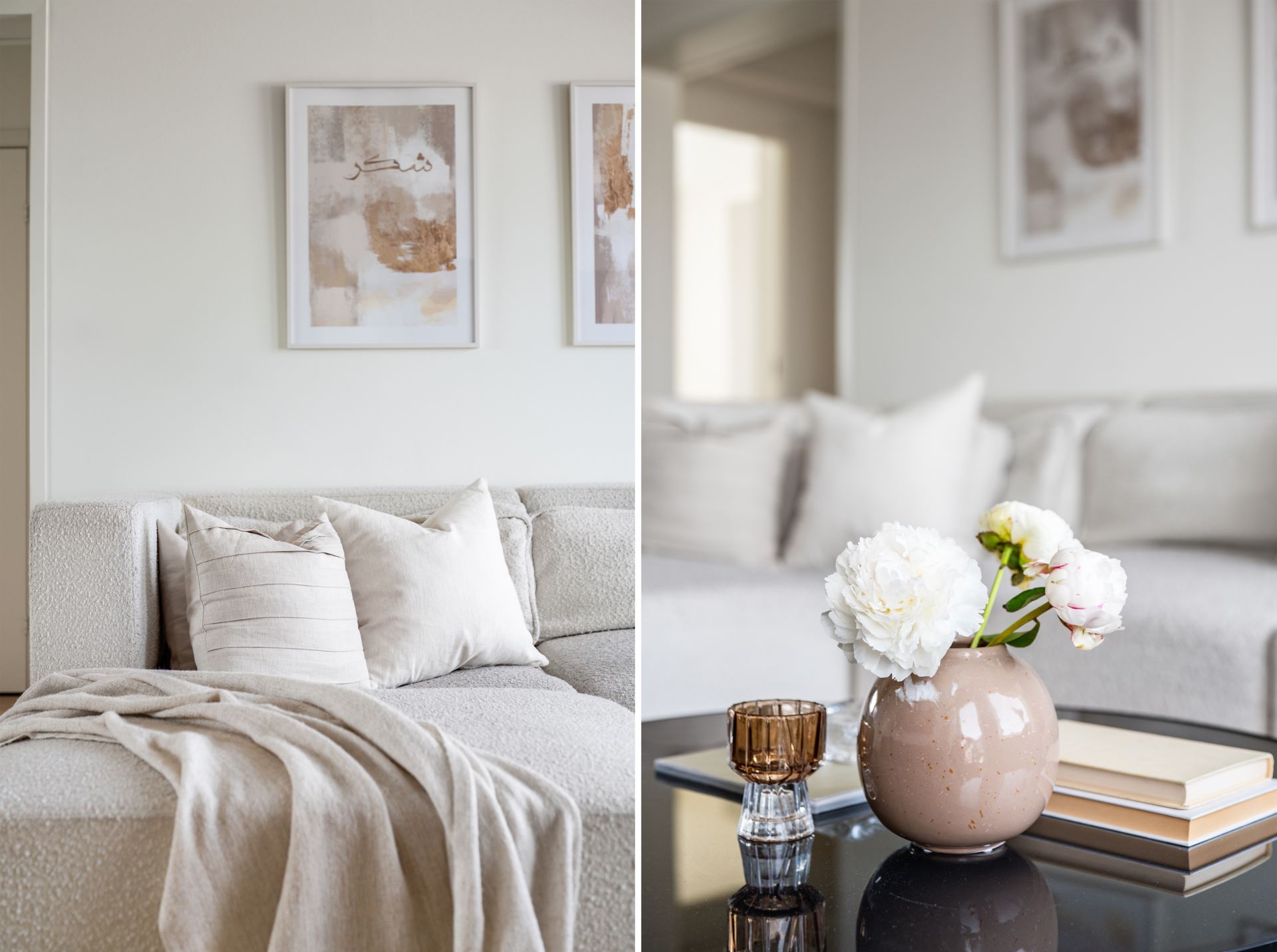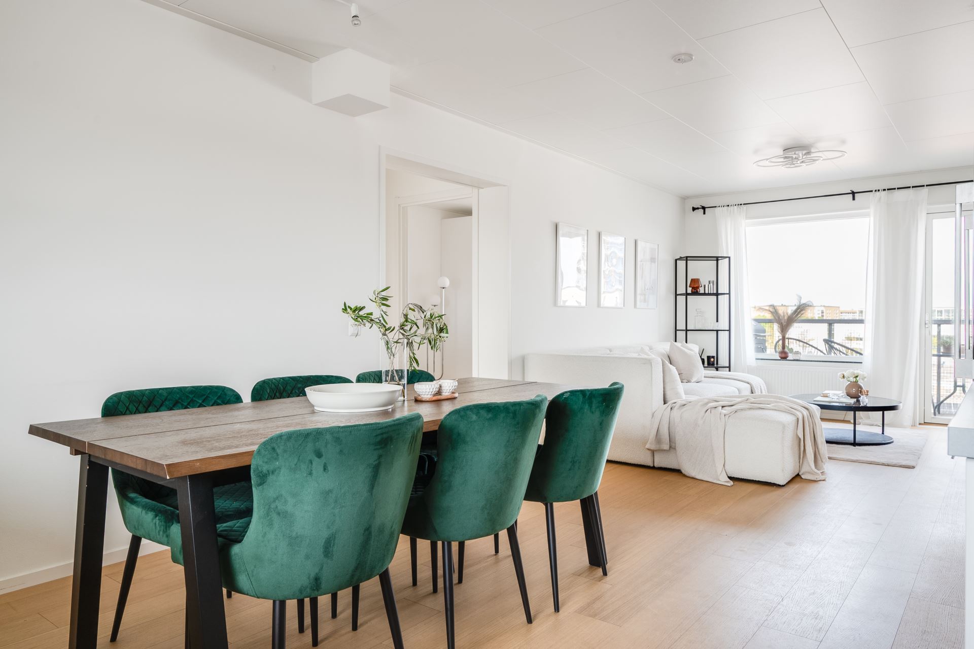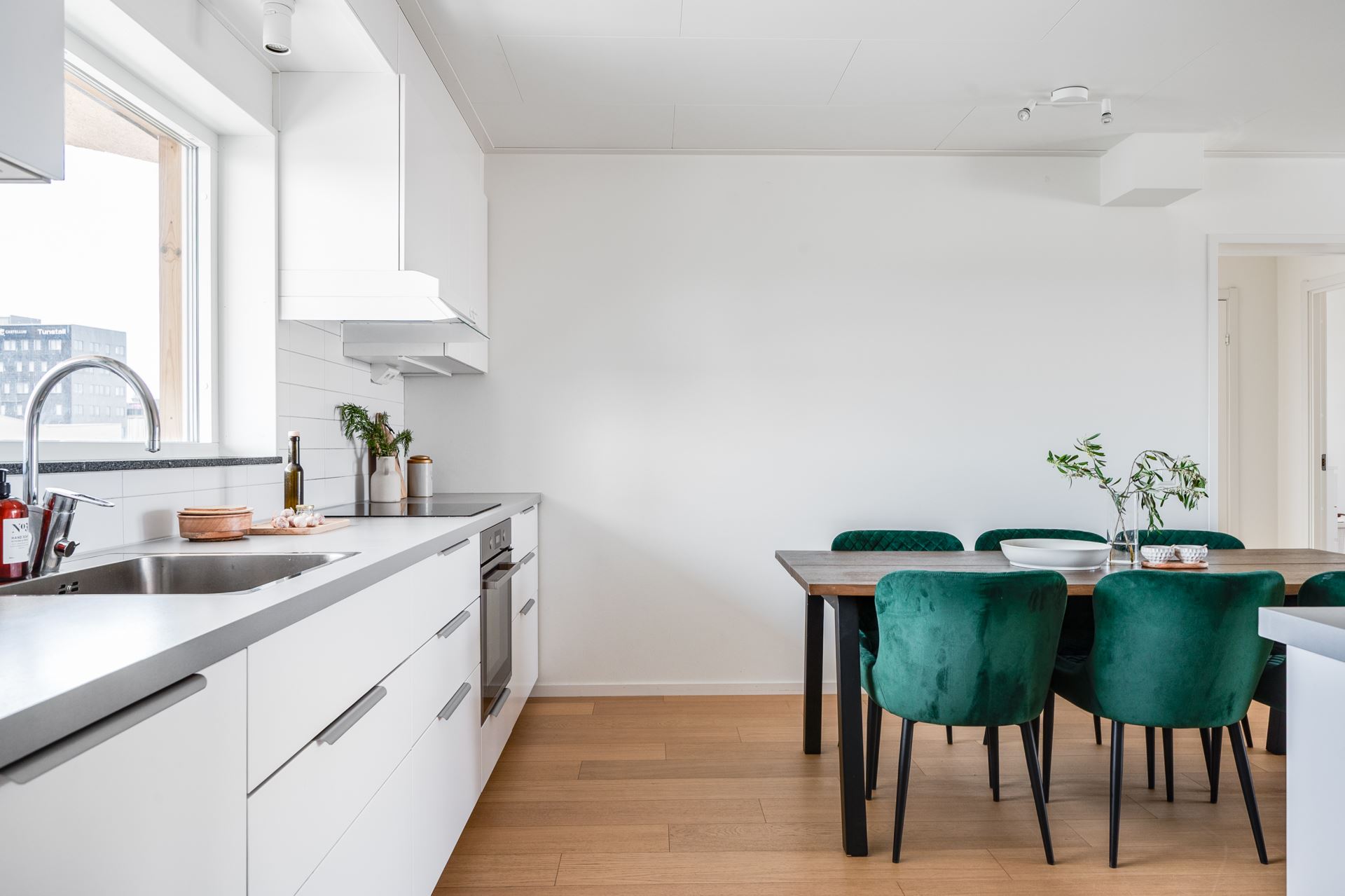 Trivsamt öppen planlösning mellan kök och vardagsrum och fint ljusinsläpp till hela rummet tack vare stora fönsterpartier. I vardagsrummet finns plats för både soffgrupp och större matbord mot köksdelen. Ekparkett på golv kombineras fint med släta vita väggar. Från vardagsrummet når vi även den sköna balkongen, med gott om plats för möblering!