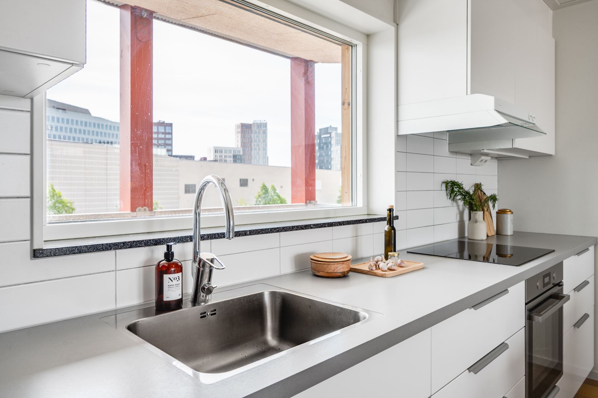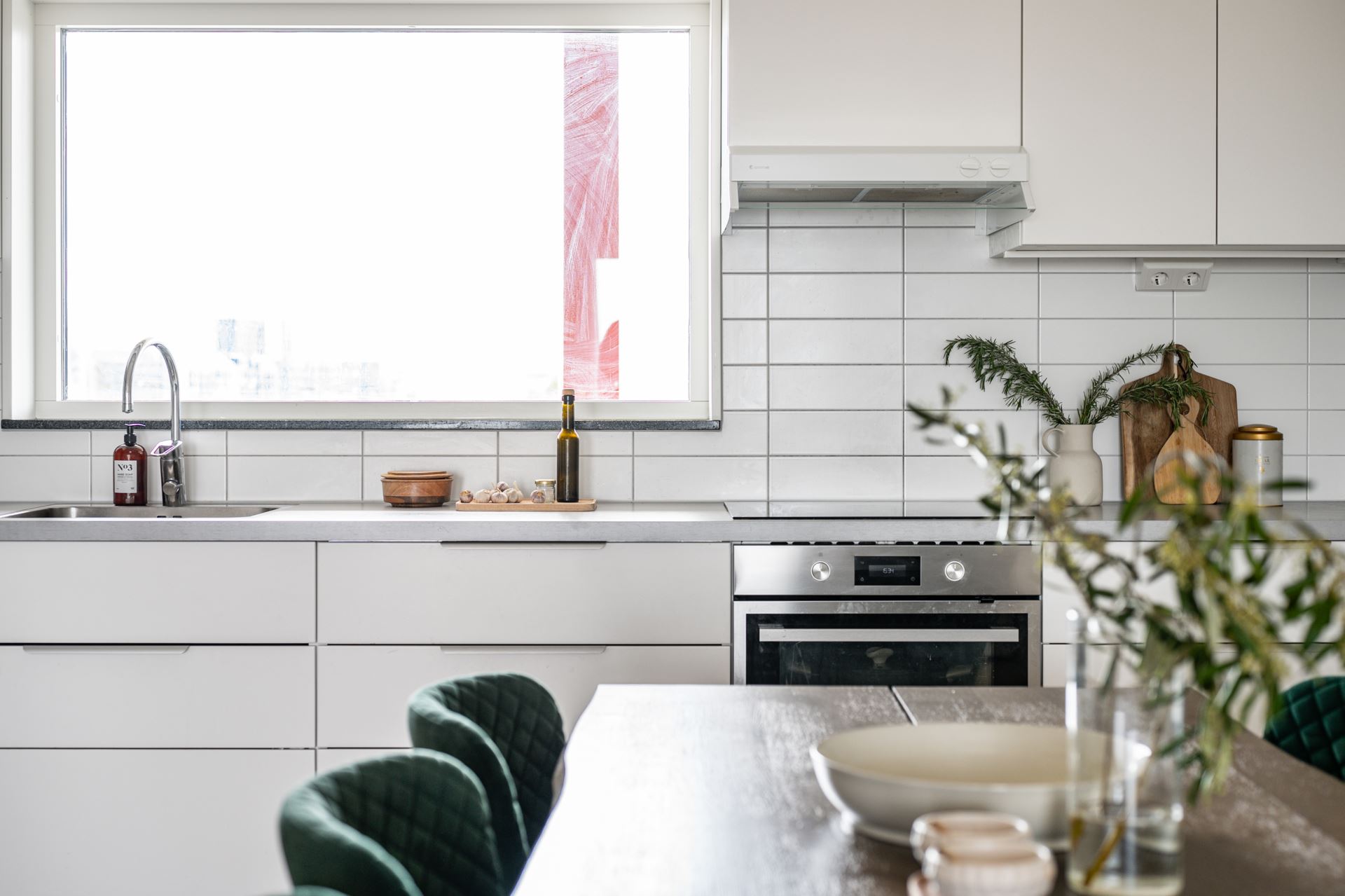 Smakfullt Ikea kök med stilrent vita köksluckor tillsammans med mörk bänkskiva i laminat och vitt kakel. Gott om plats till förvaring i både skåp och lådor. Köket är utrustat med kyl och frys, diskmaskin, spishäll (induktion), inbyggd ugn, fläkt. Samtlig utrustning från Ikea.