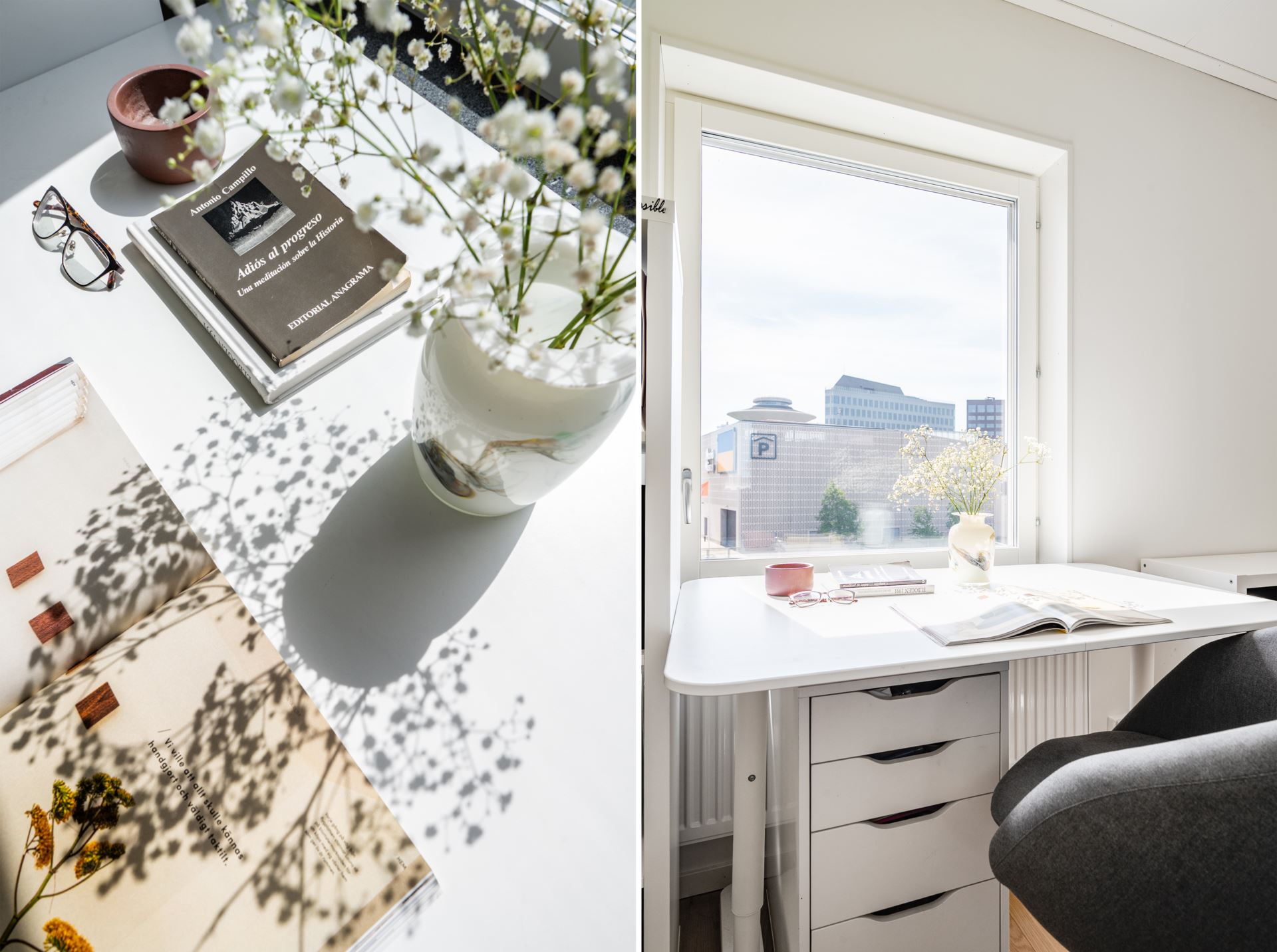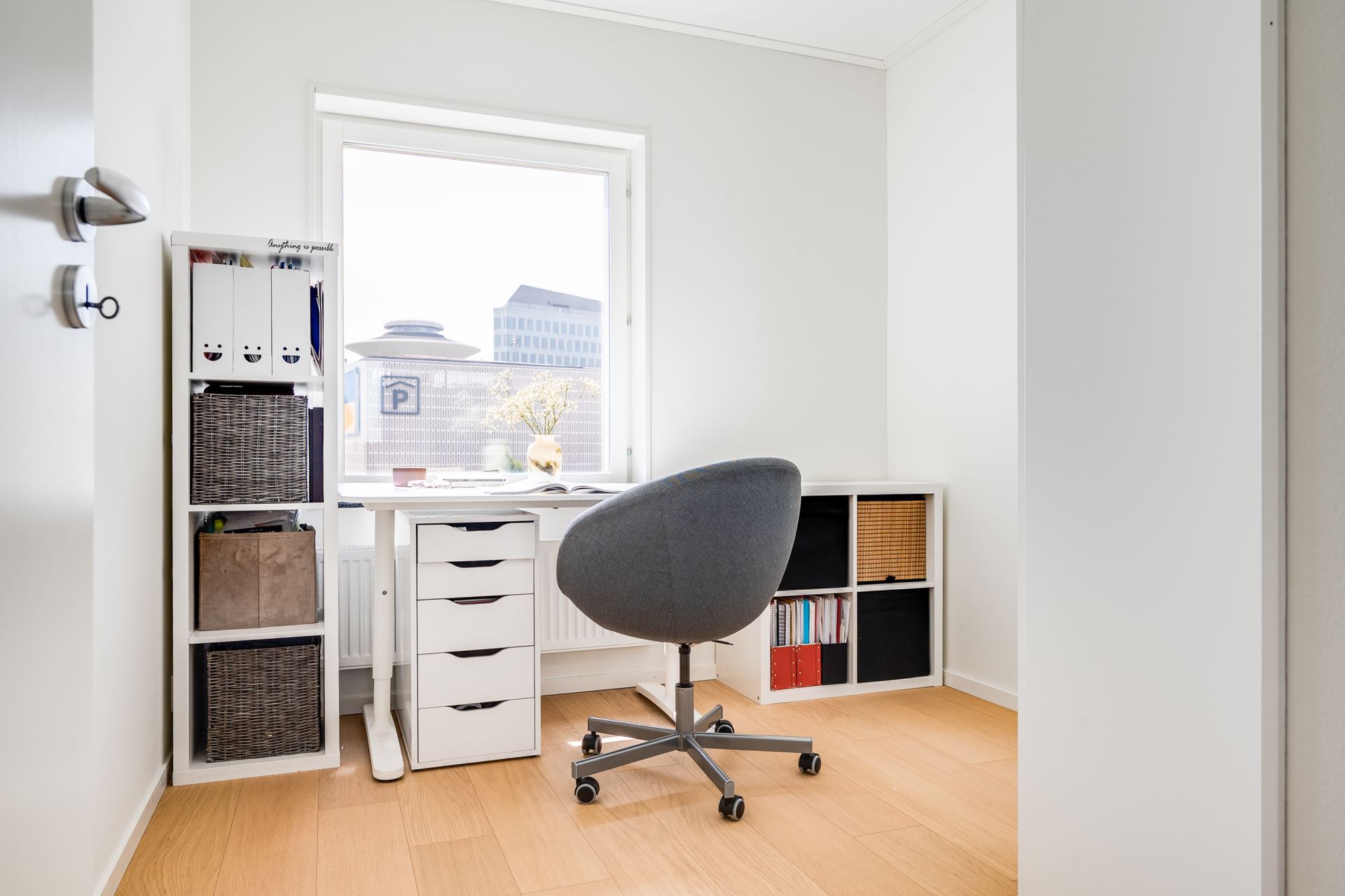 Andra sovrummet används idag som kontor. Passar även perfekt som barnrum eller gästrum. Även här ryms större säng och tillhörande möblemang.