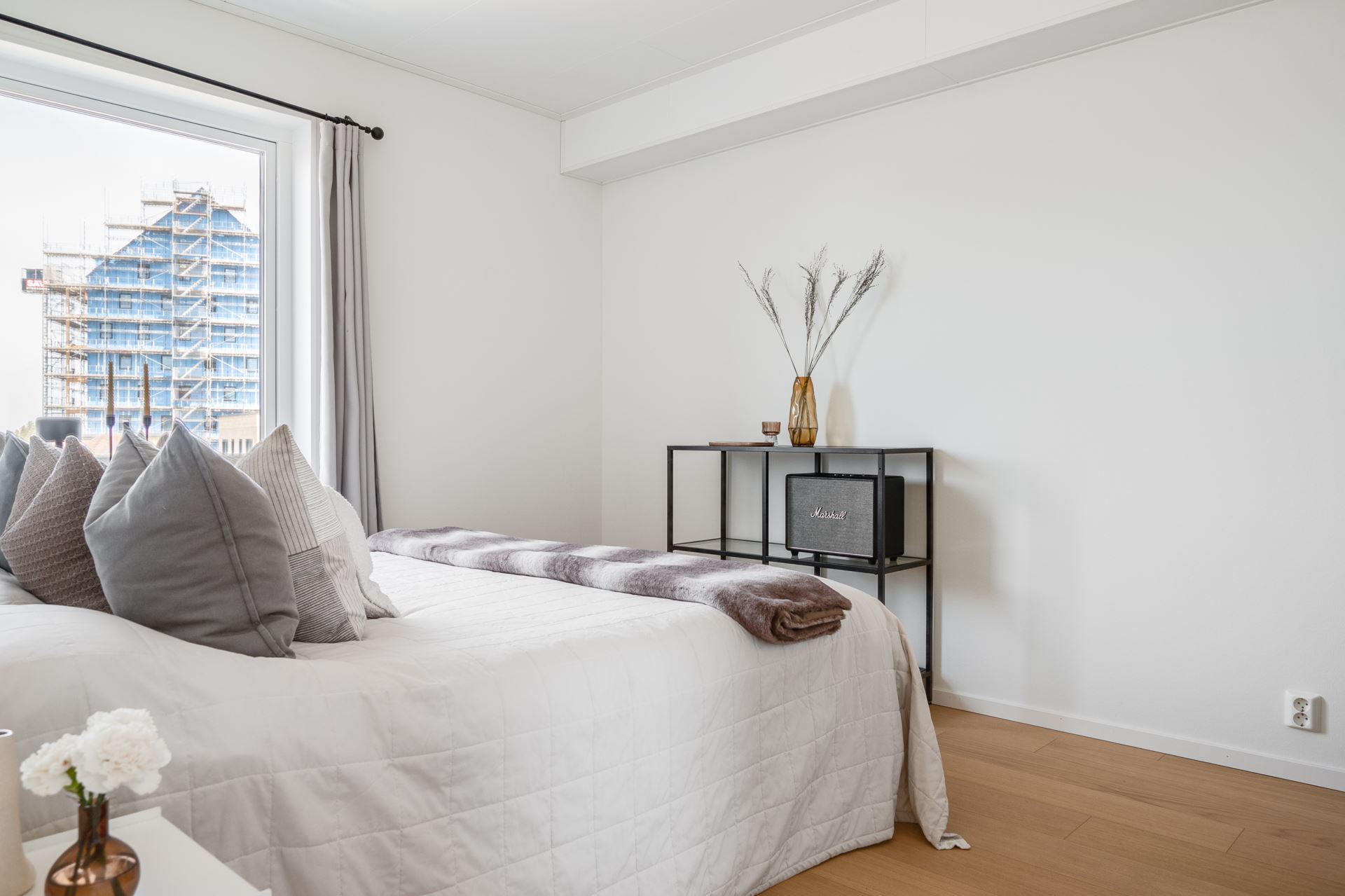 Master bedroom är rymligt till storleken och här ryms plats för dubbelsäng, sängbord och mer därtill. Utmärkt plats till förvaring finns längst med väggen till höger.