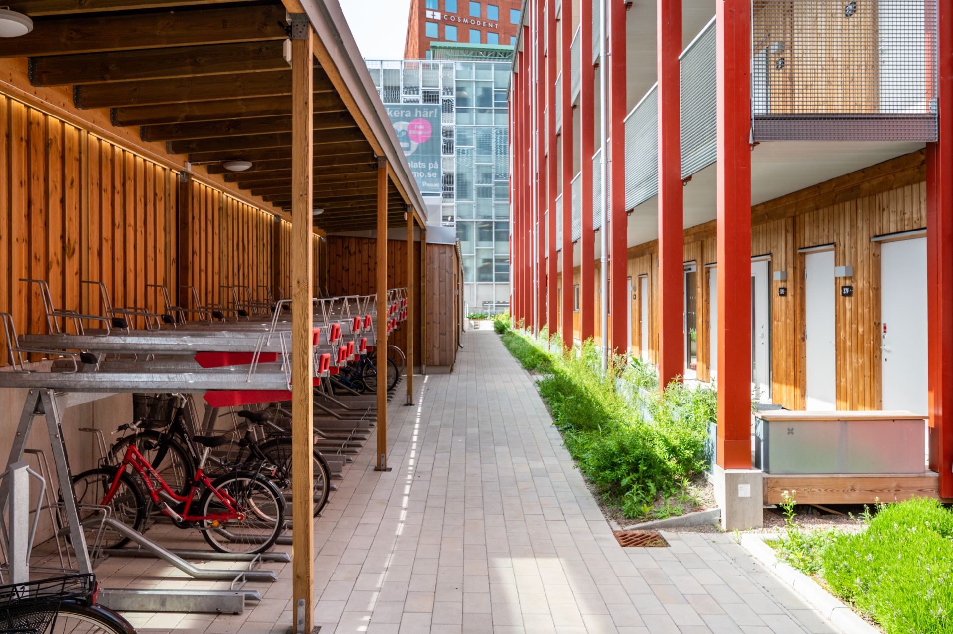 Lägenheter: Kallförråd finns i egna byggnader nedanför loftgångarna, ca 2 kvm kan hyras för 200kr/månad. Alla boende har tillgång till gemensamt förråd för barnvagnar och rullstolar.