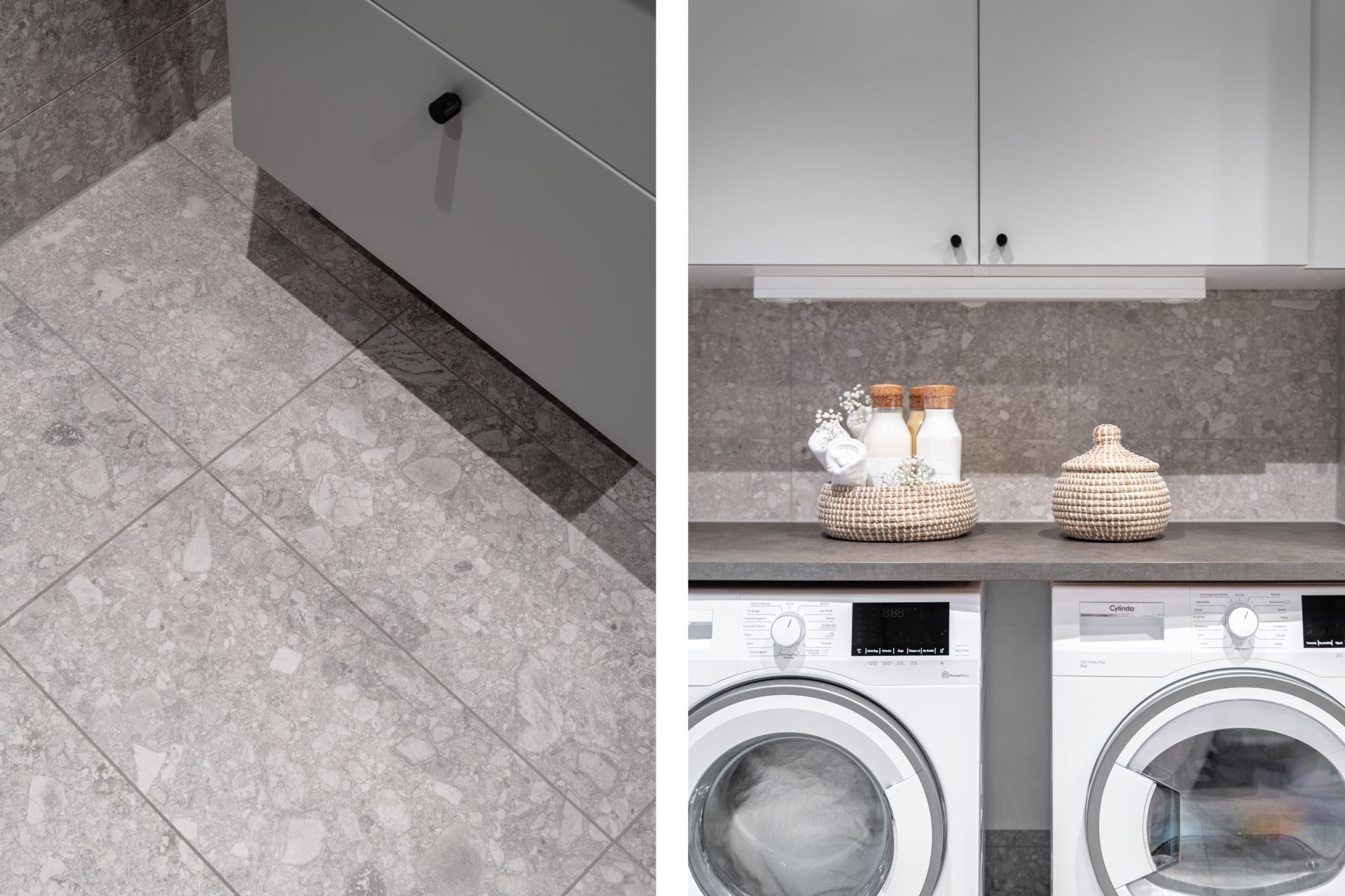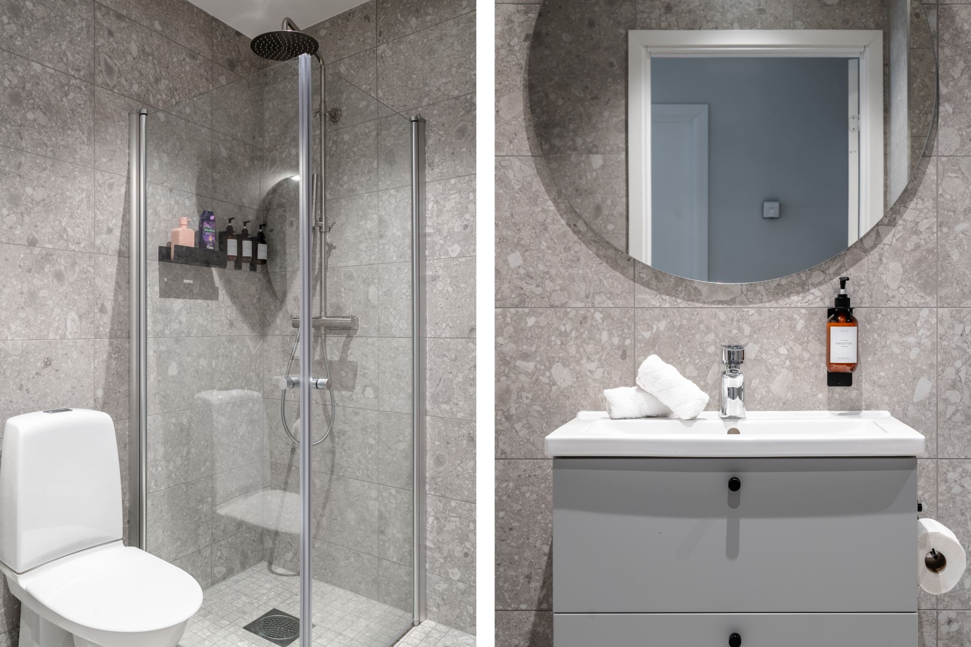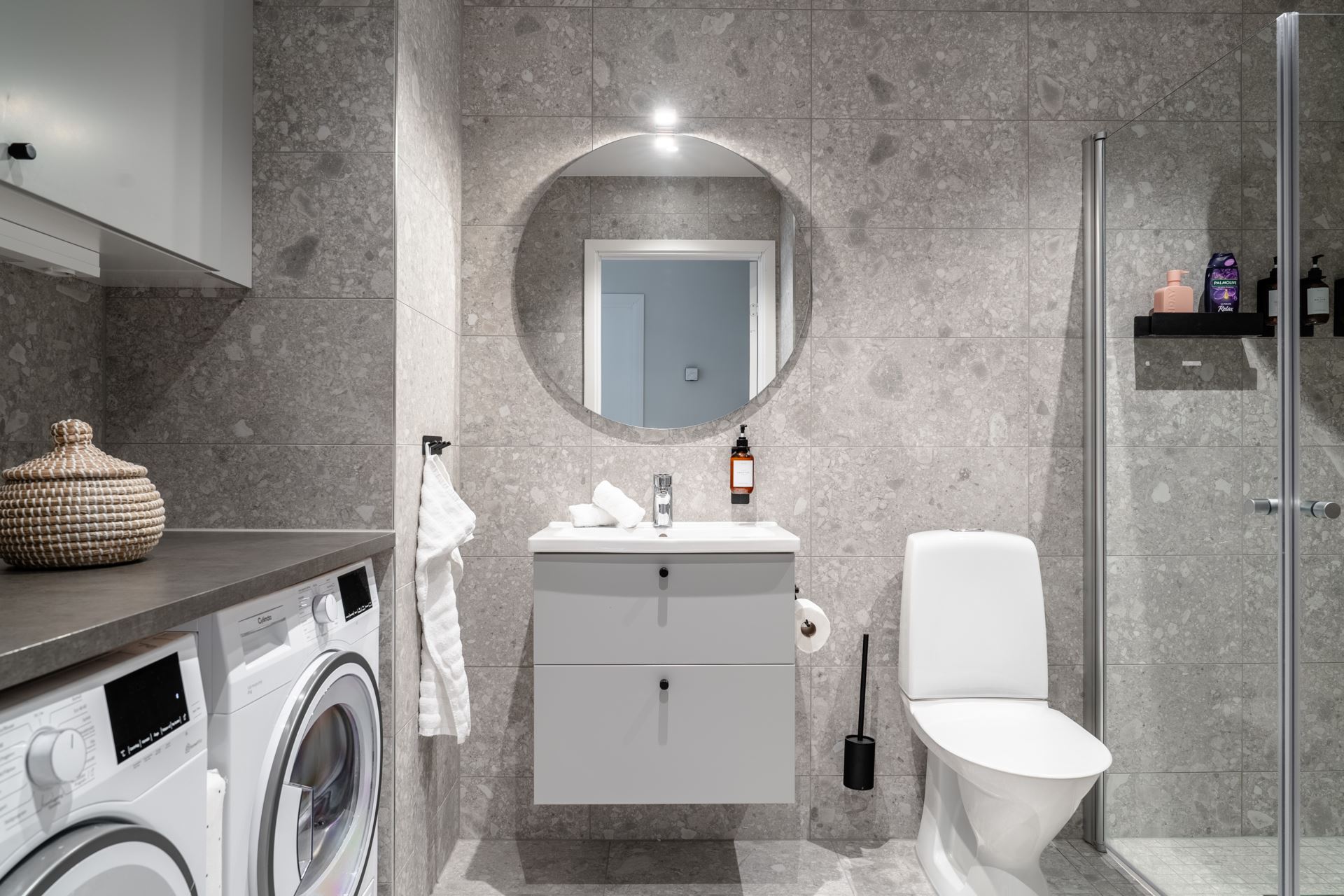Smakfullt helkaklat badrum där exklusivt kakel och klinkers (Terrazo) kombineras på allra bästa vis. Badrummet är utrustat med dusch bakom glasvägg, handfat med kommod, spegel, wc, handdukstork, tvättmaskin och torktumlare (Cylinda). Ovanför tvätt,- och tork finns ytterligare skåpsförvaring (Vedum).