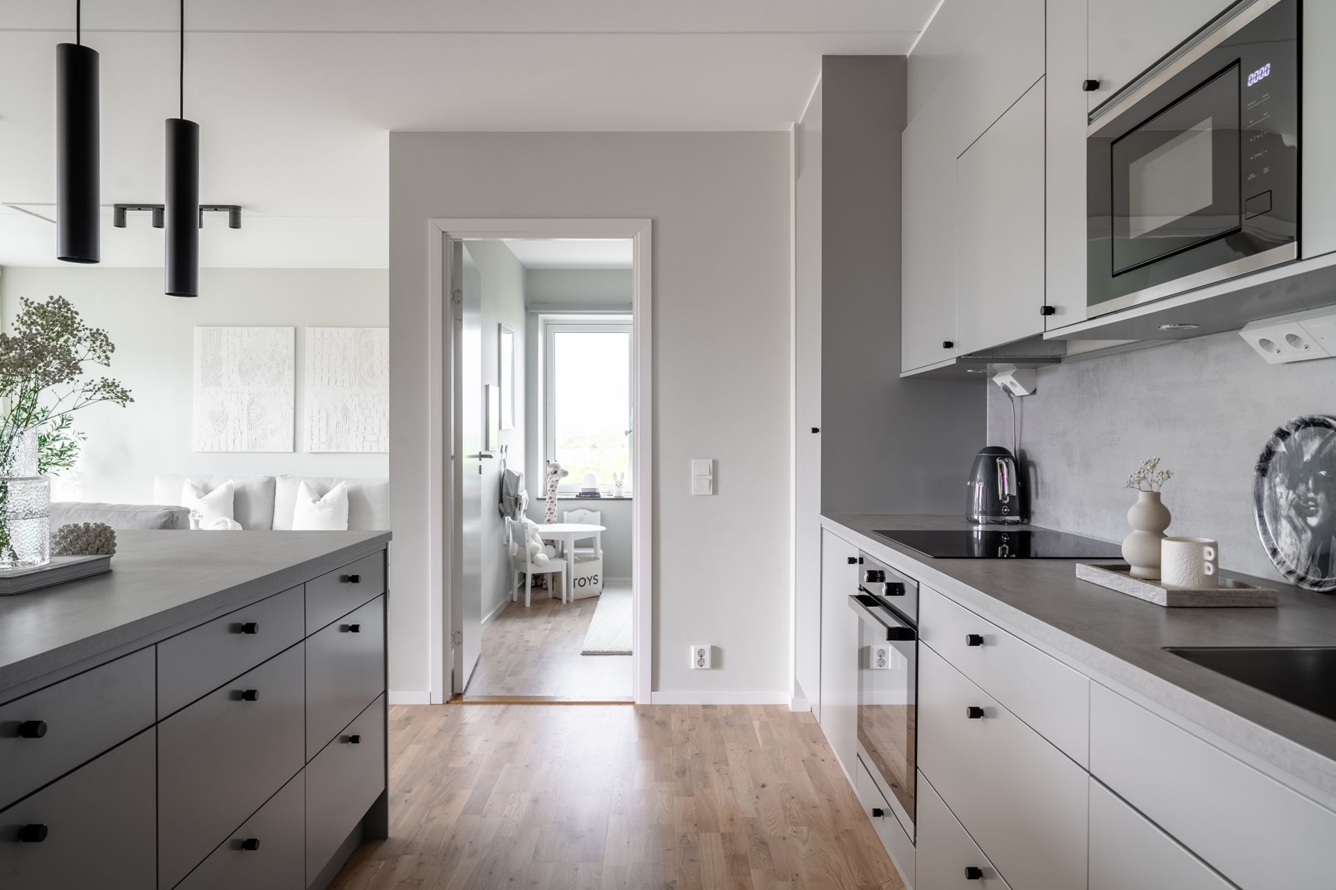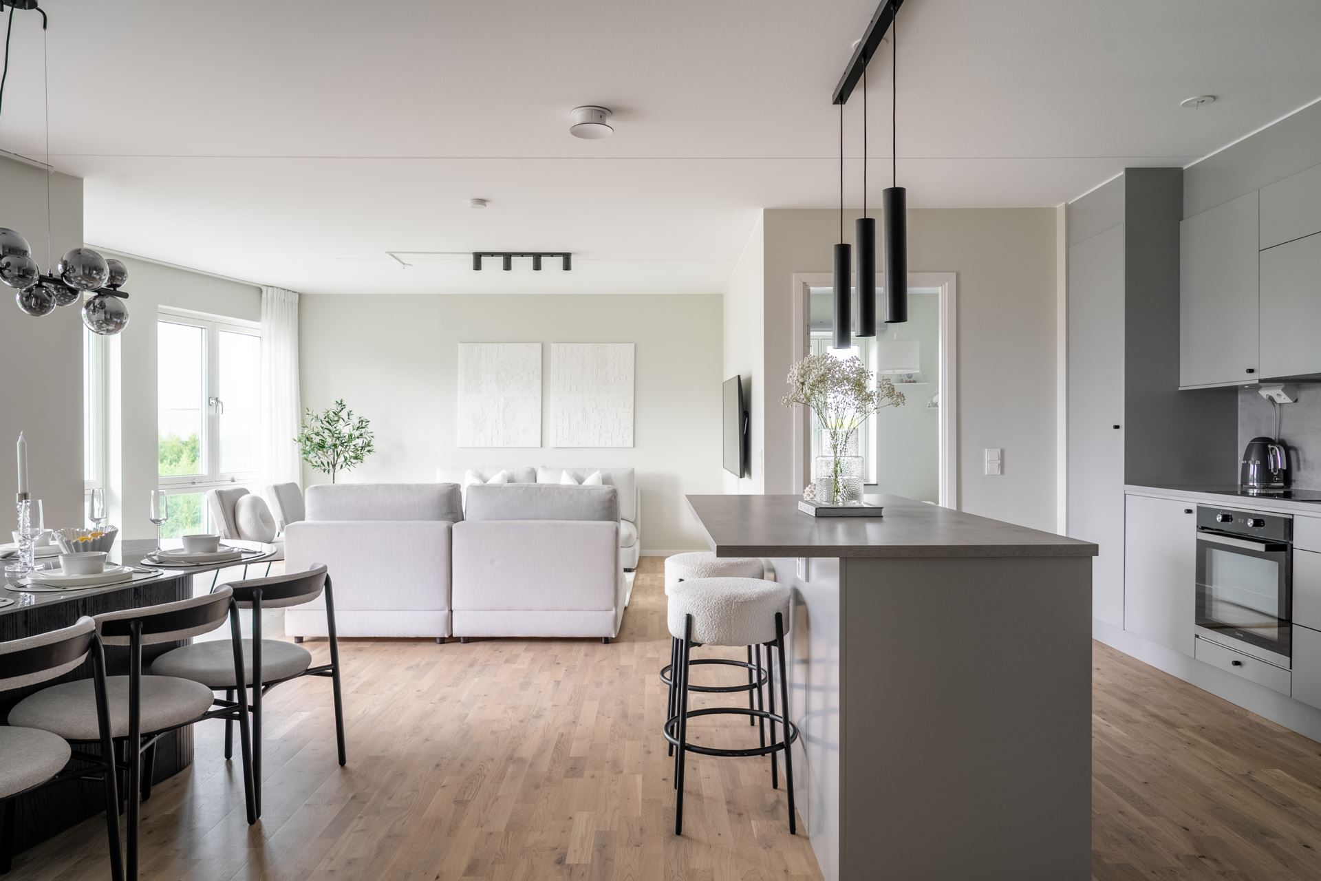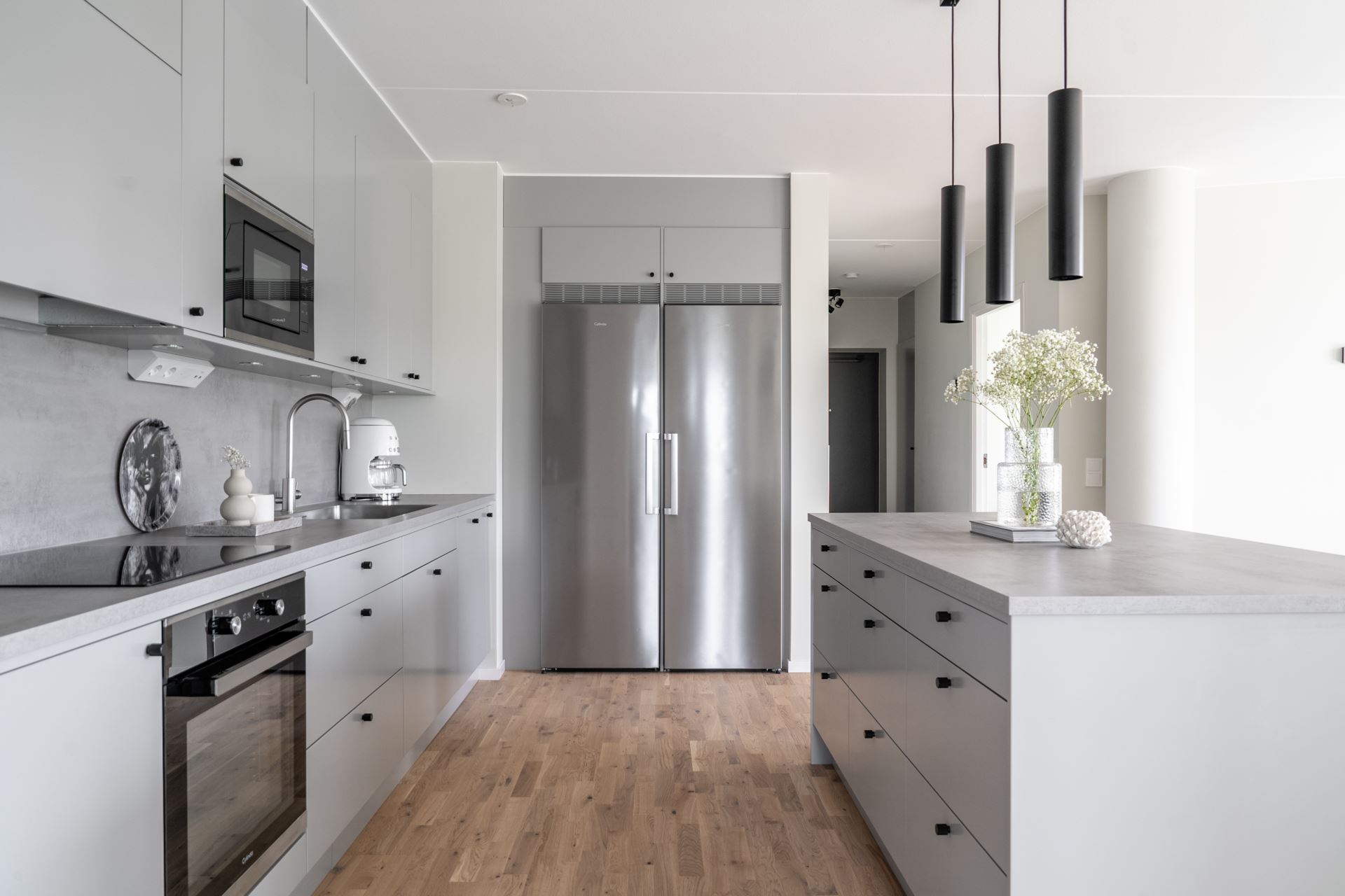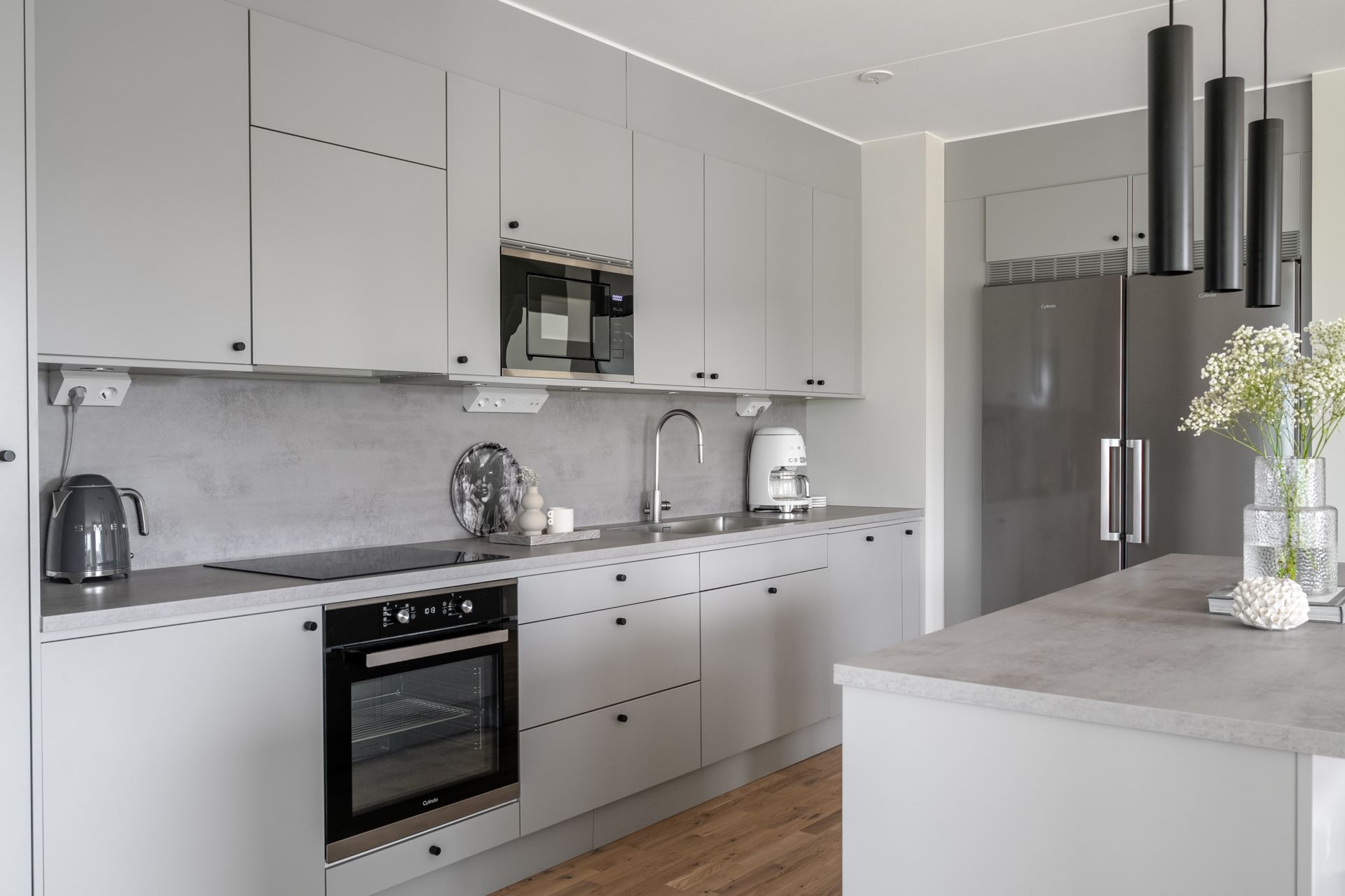 Vidare öppnar lägenheten upp med köket som bjuder på fantastisk rymd och plats för ett stort matbord. Stilrent ljusgråa köksluckor (Vedum) med accentuerade svarta beslag kombinerat med beige bänkskiva och grått stänkskydd. Köket är utrustat med kyl och frys i fullhöjd, induktionshäll, ugn, köksfläkt, mikrovågsugn, extra stor diskho, samt integrerad diskmaskin. Dessutom gott om plats med skåpsförvaring med extra höjd och utmärkta arbetsytor. Samtlig utrustning från Cylinda. Spotlights under överskåpen. Praktisk köksö länkar samman kök och vardagsrum på ypperligt vis och även här finns gott om plats till förvaring i lådor.