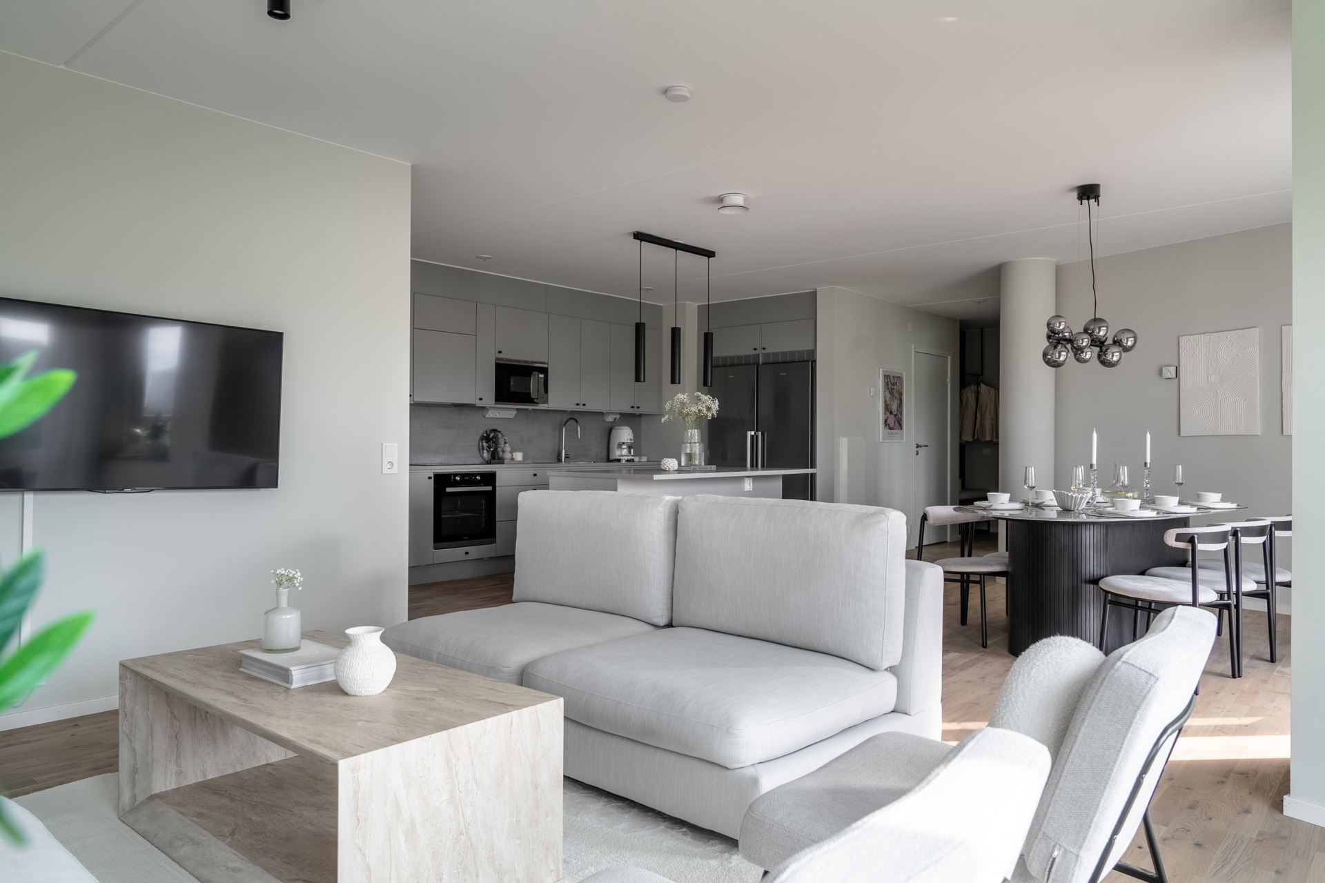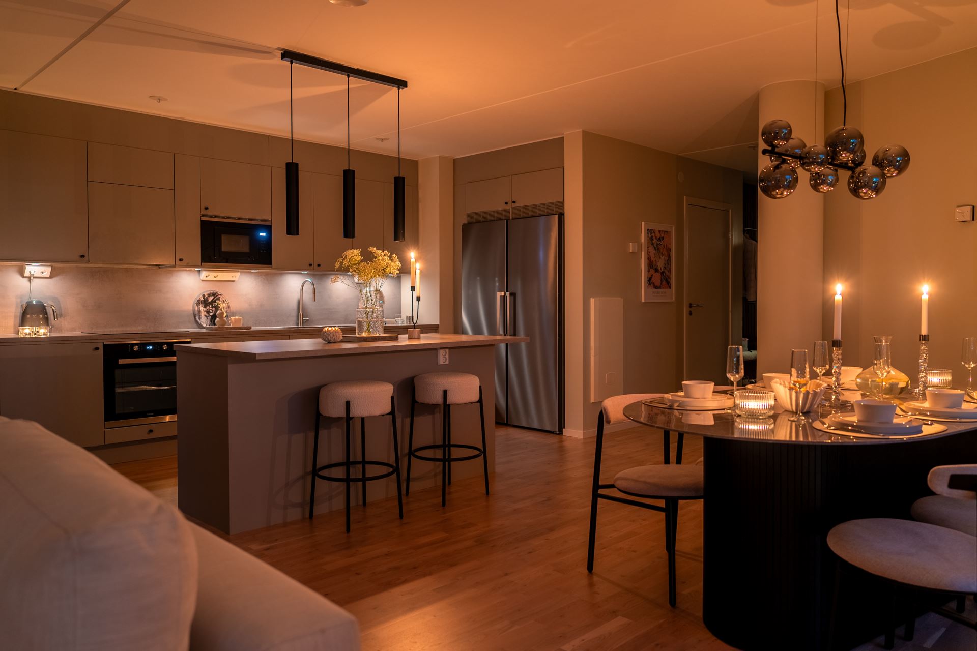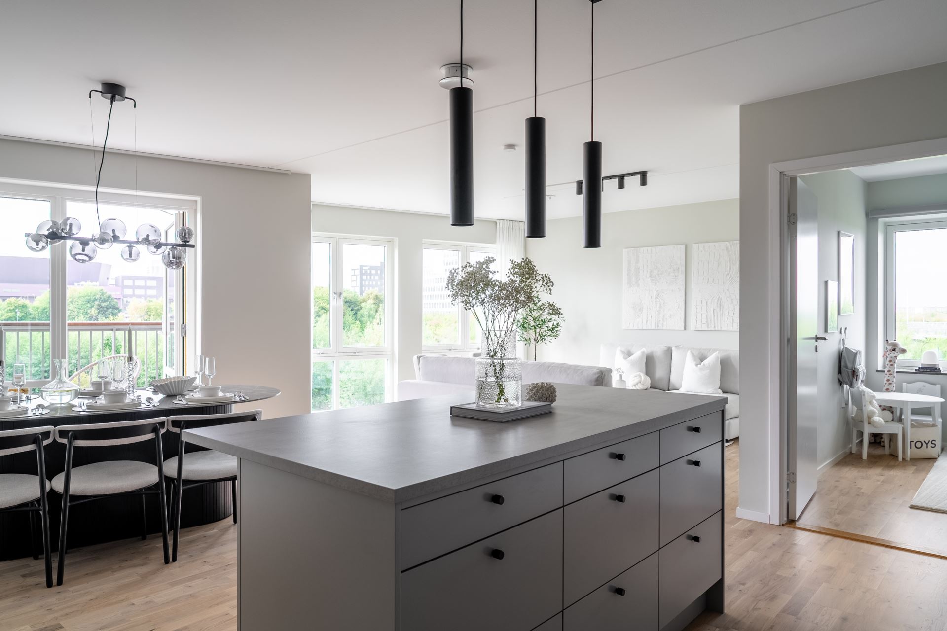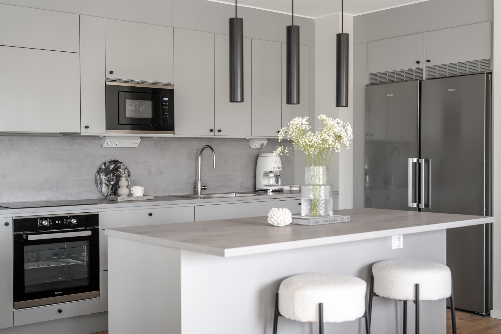 Vidare öppnar lägenheten upp med köket som bjuder på fantastisk rymd och plats för ett stort matbord. Stilrent ljusgråa köksluckor (Vedum) med accentuerade svarta beslag kombinerat med beige bänkskiva och grått stänkskydd. Köket är utrustat med kyl och frys i fullhöjd, induktionshäll, ugn, köksfläkt, mikrovågsugn, extra stor diskho, samt integrerad diskmaskin. Dessutom gott om plats med skåpsförvaring med extra höjd och utmärkta arbetsytor. Samtlig utrustning från Cylinda. Spotlights under överskåpen. Praktisk köksö länkar samman kök och vardagsrum på ypperligt vis och även här finns gott om plats till förvaring i lådor.