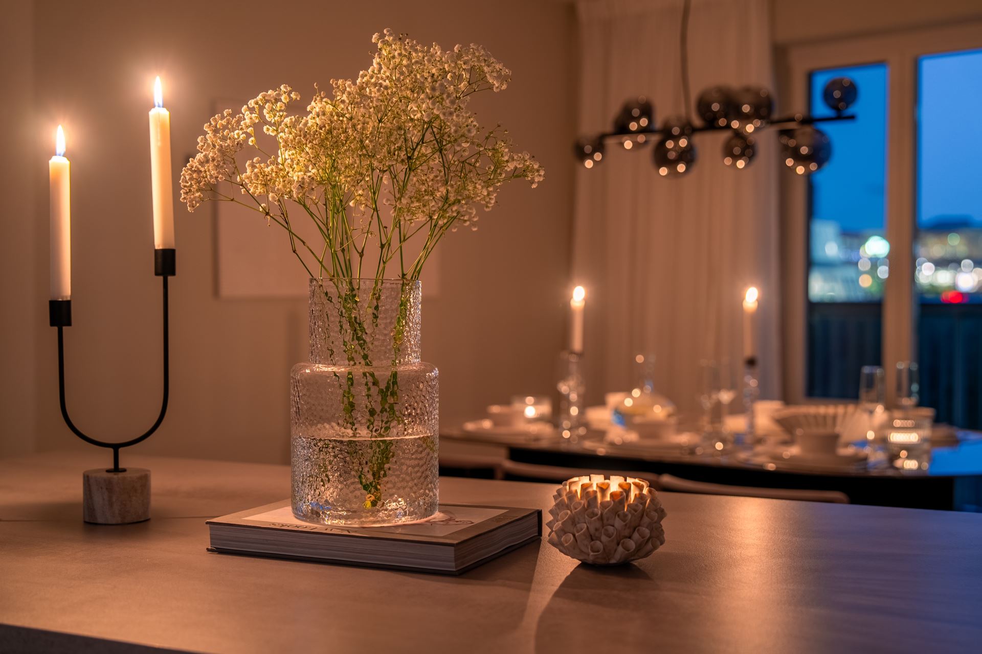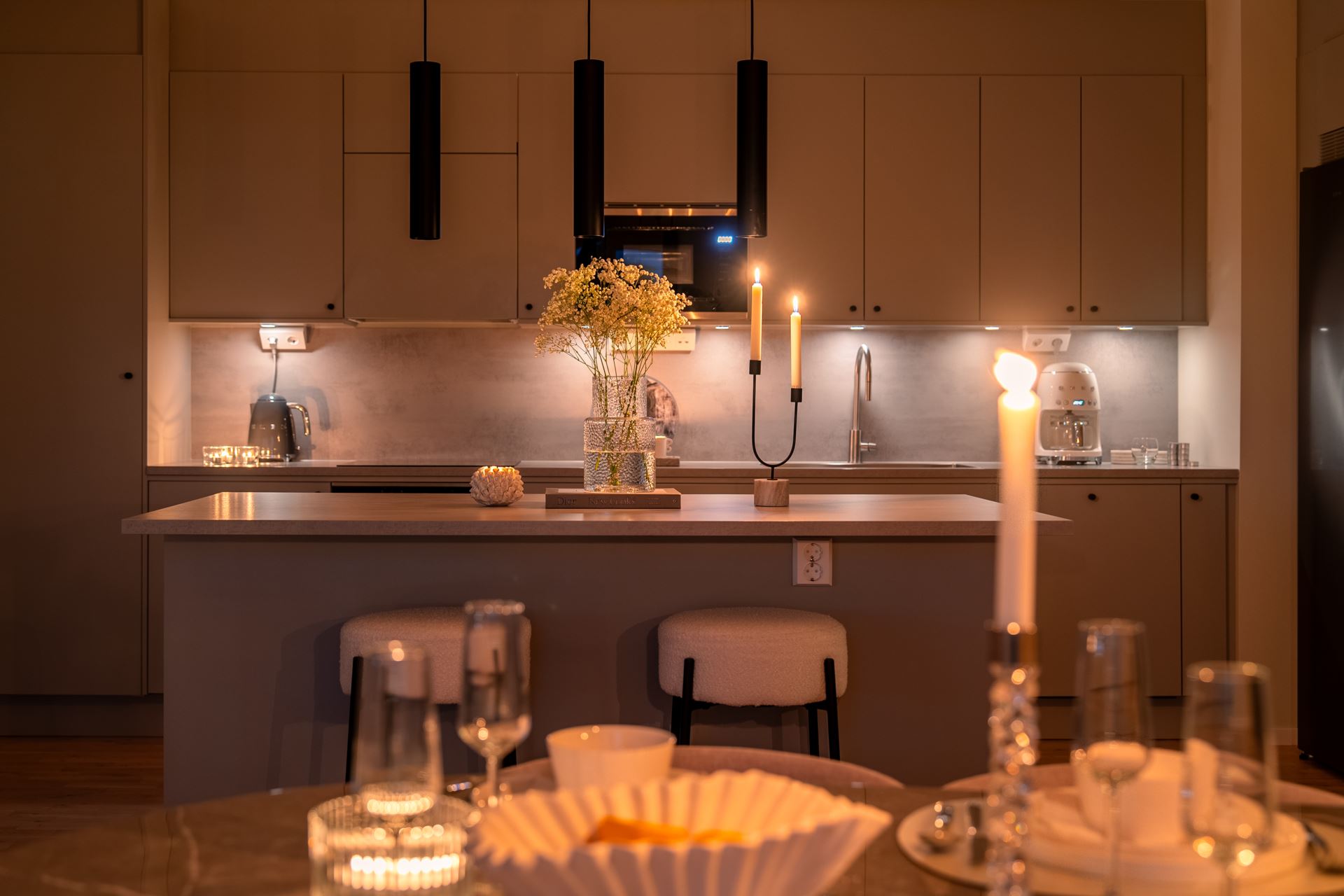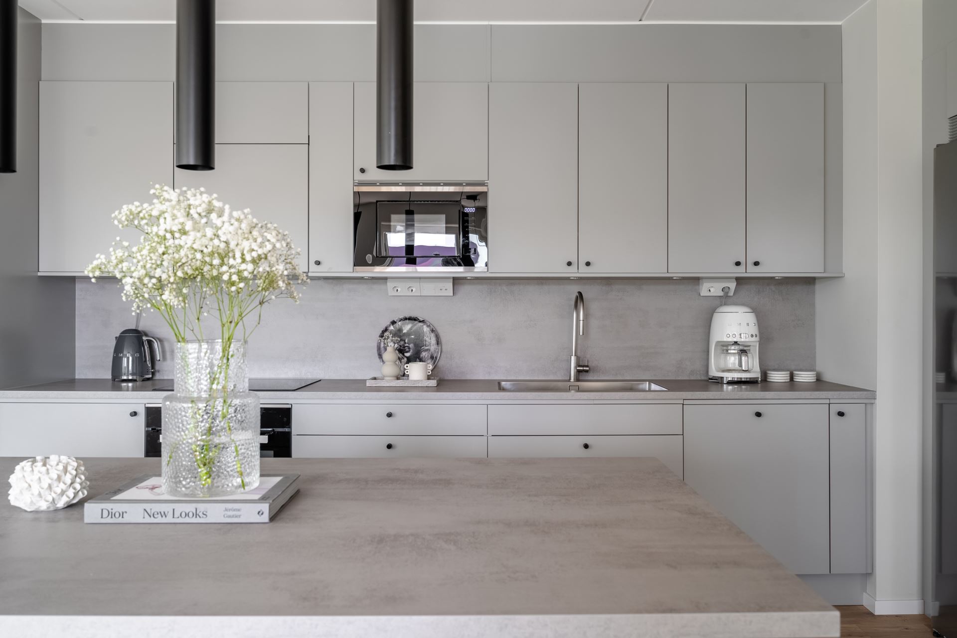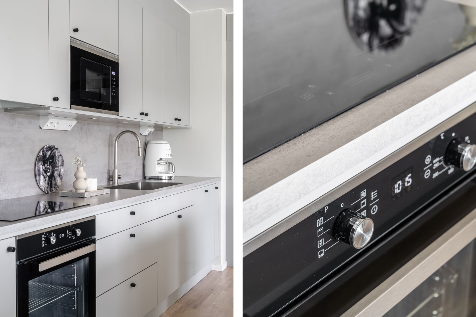 Vidare öppnar lägenheten upp med köket som bjuder på fantastisk rymd och plats för ett stort matbord. Stilrent ljusgråa köksluckor (Vedum) med accentuerade svarta beslag kombinerat med beige bänkskiva och grått stänkskydd. Köket är utrustat med kyl och frys i fullhöjd, induktionshäll, ugn, köksfläkt, mikrovågsugn, extra stor diskho, samt integrerad diskmaskin. Dessutom gott om plats med skåpsförvaring med extra höjd och utmärkta arbetsytor. Samtlig utrustning från Cylinda. Spotlights under överskåpen. Praktisk köksö länkar samman kök och vardagsrum på ypperligt vis och även här finns gott om plats till förvaring i lådor.