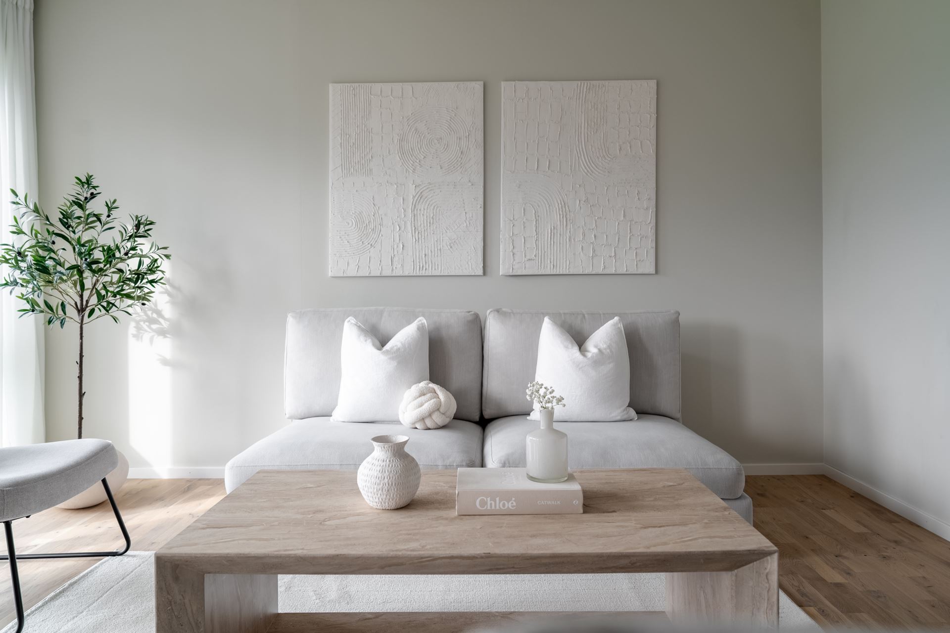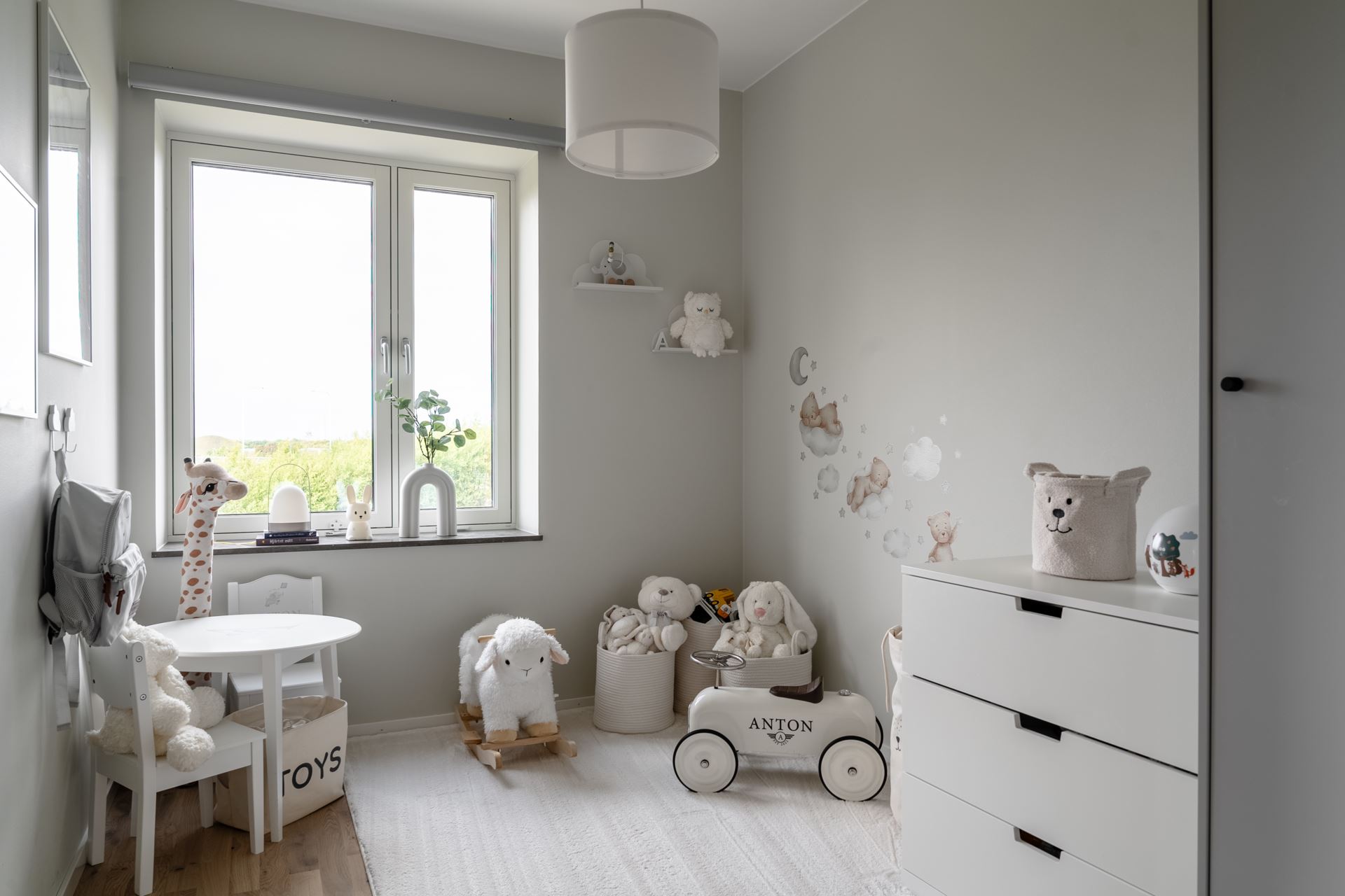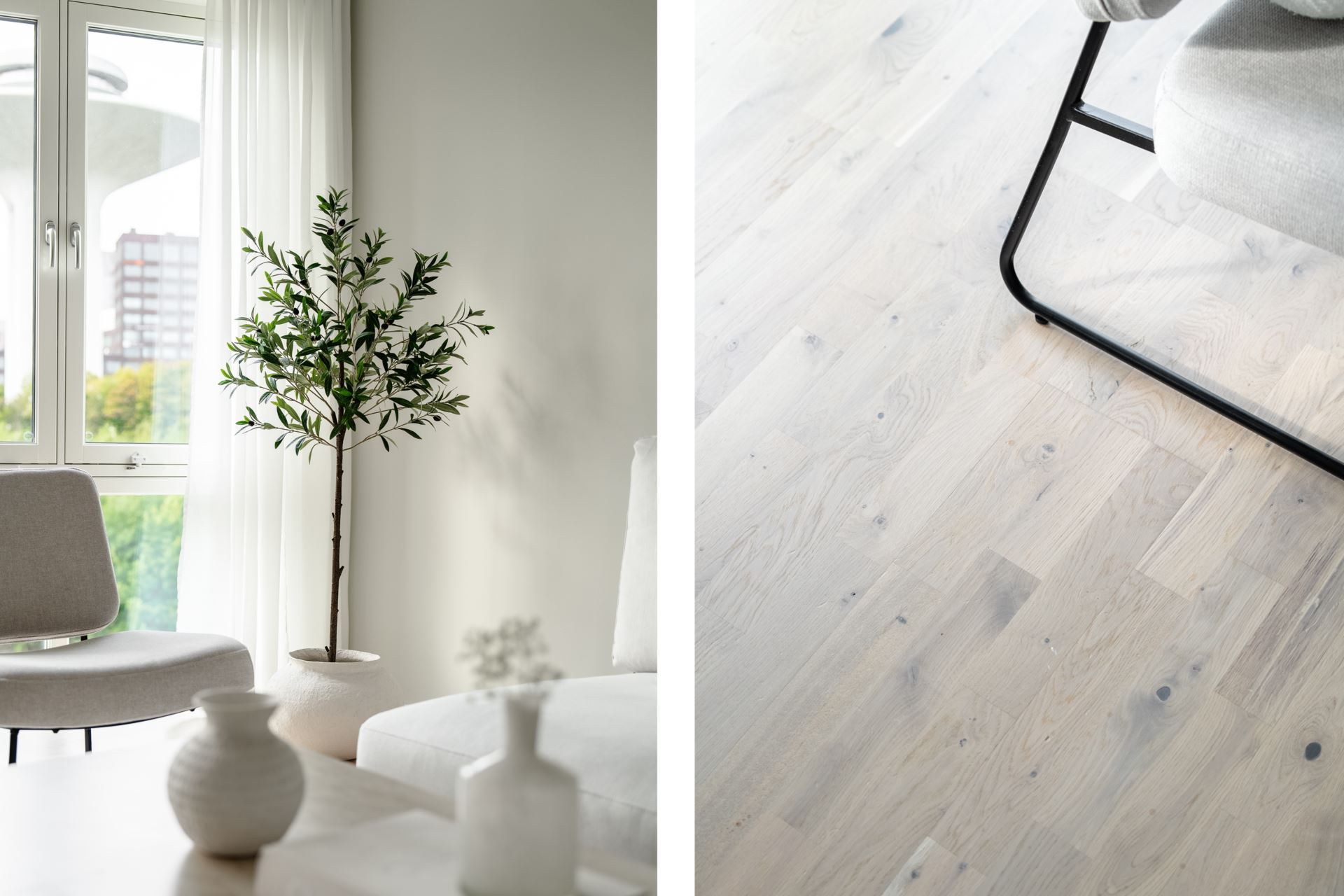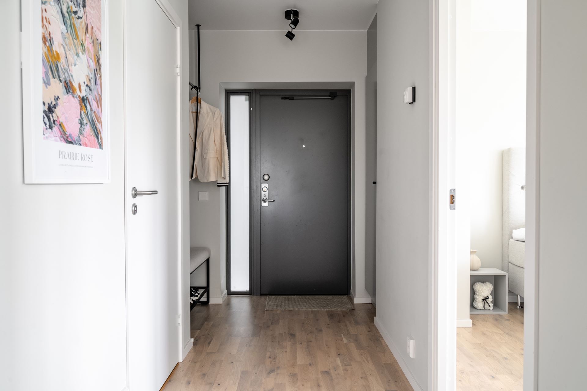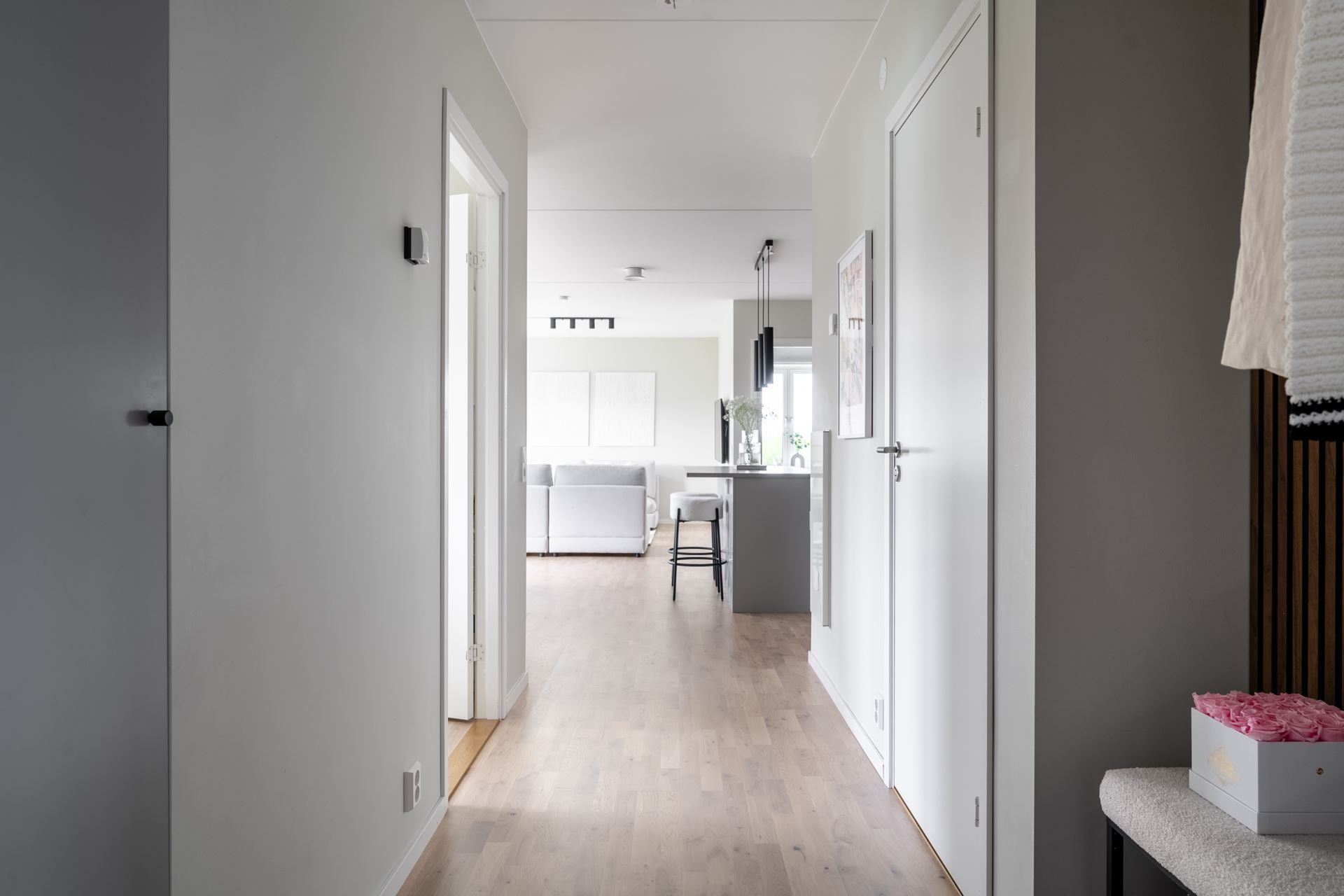 Vi välkomnas in i ett trivsamt hem där allting är minutiöst genomtänkt och där alla detaljer är på plats. På golvet vid entrén vilar vitpigmenterad ekparkett som återfinns i hela bostaden tillsammans med enhetligt ljusgråa väggar och fondvägg med träpanel i hallen. Plats för avhängningsmöjligheter på höger sida och vidare in i hallen finns ytterligare förvaringsutrymme i form av garderober längst med väggen.