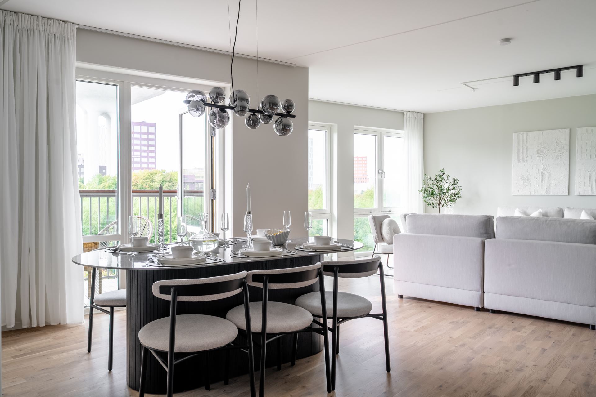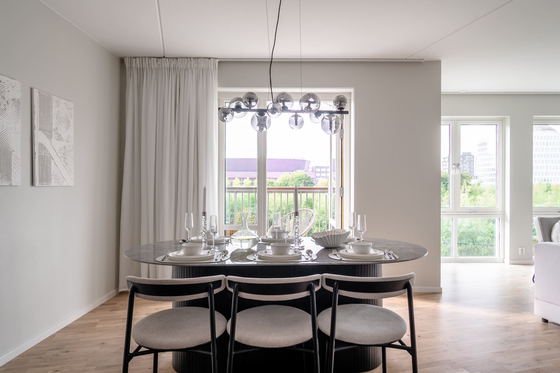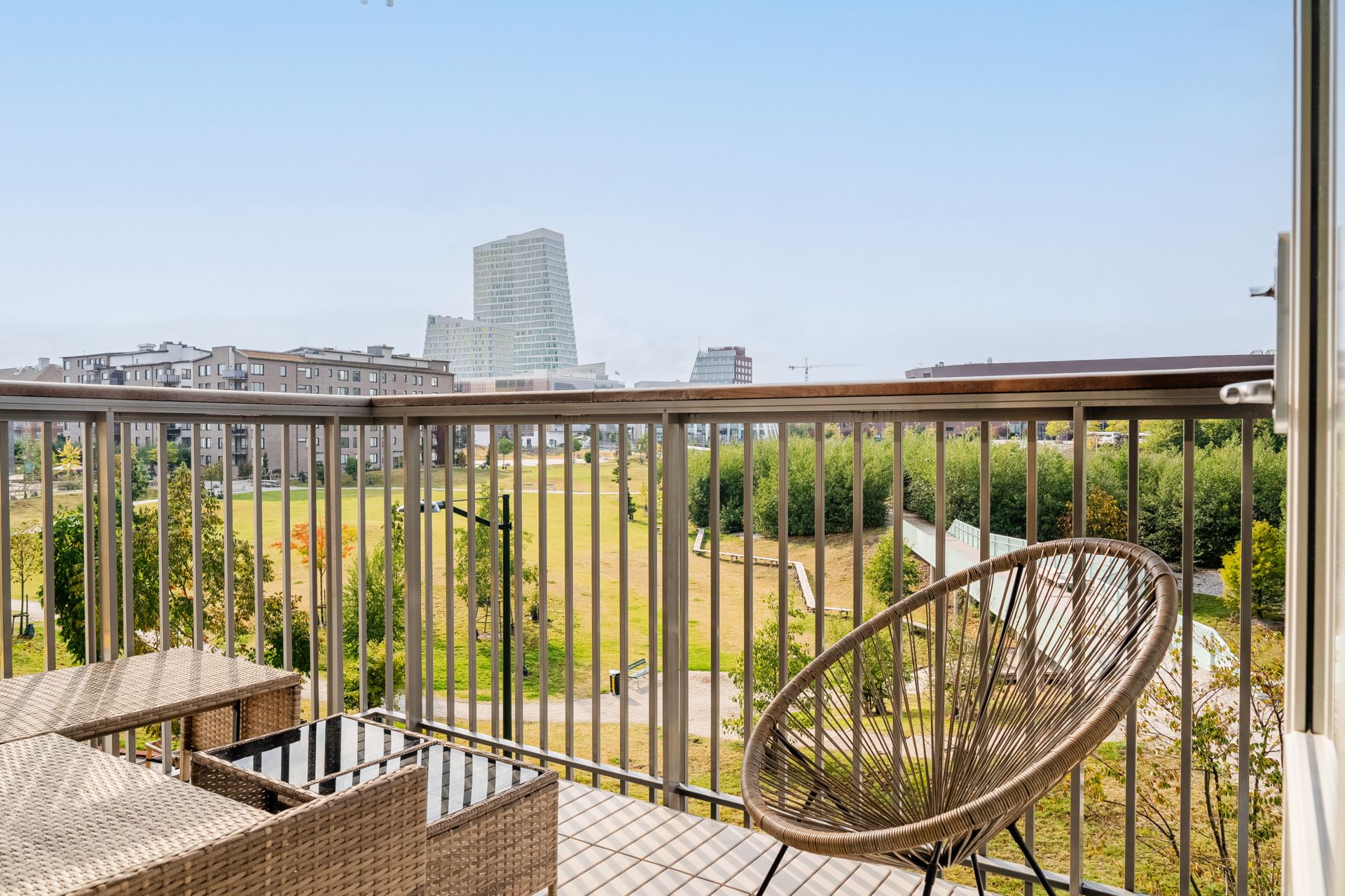 Ljust och trivsamt vardagsrum som enkelt möbleras med soffgrupp, tv och större matbord. Från vardagsrummet finns utgången till den mysiga balkongen, belägen i härligt västerläge där vi kan njuta av många soltimmar och utsikt över den grönskande Dagvattenparken. Ett av de få lägen i området helt fritt från insyn och med svårslagen utsikt!