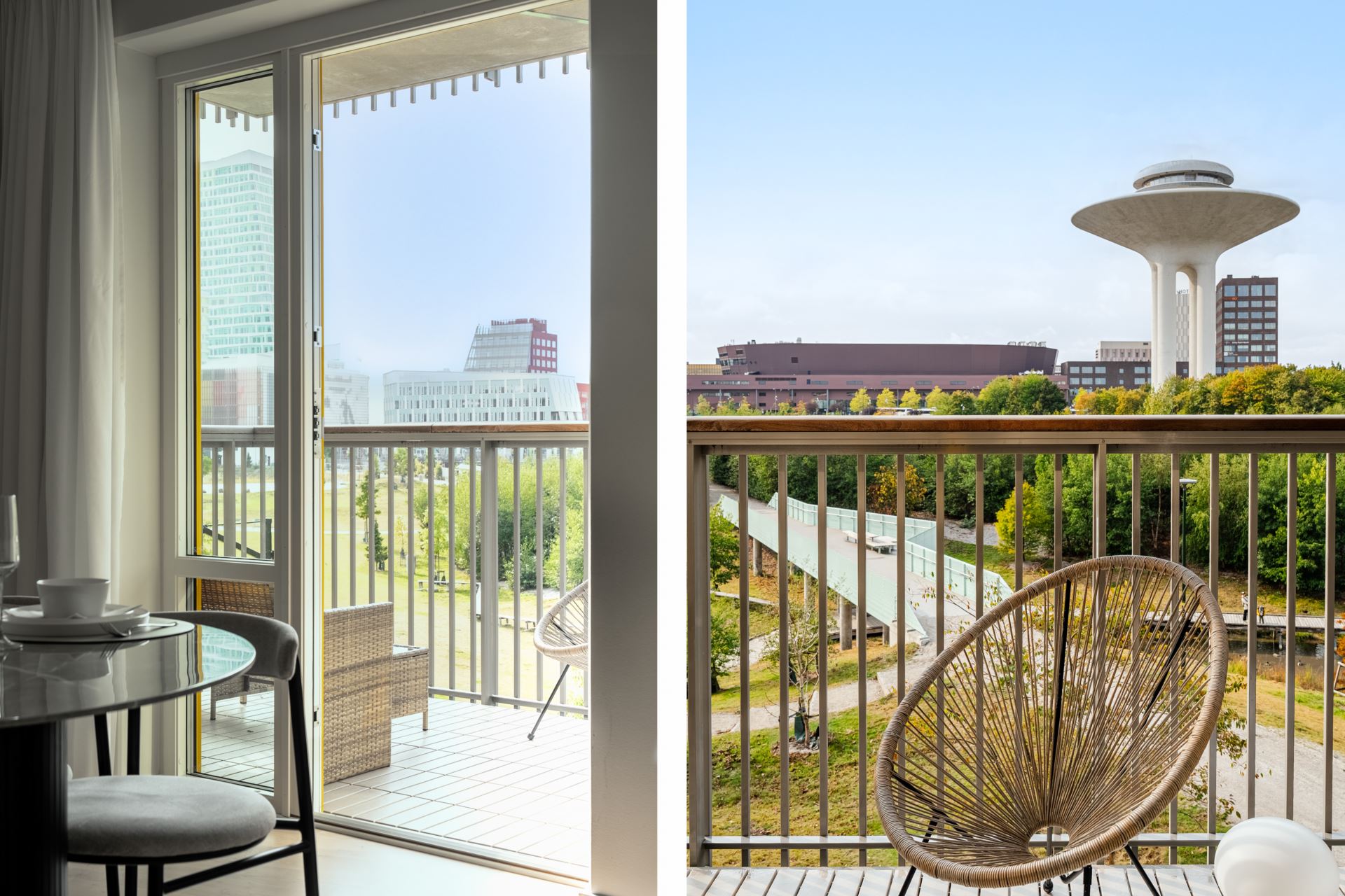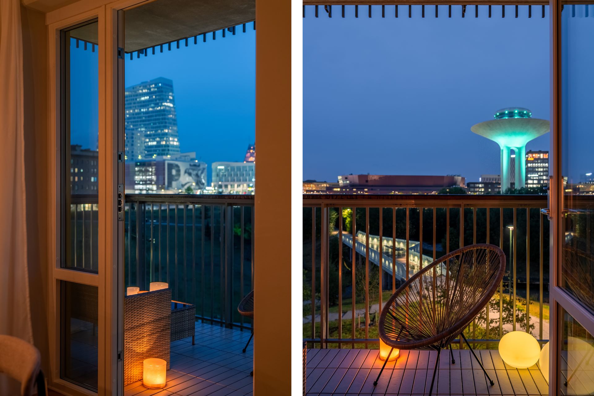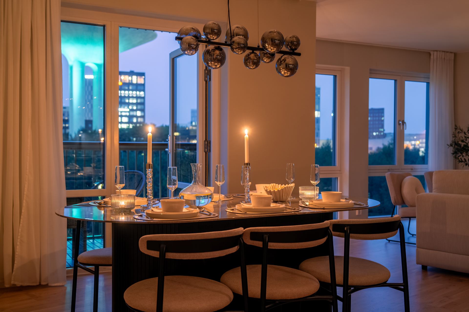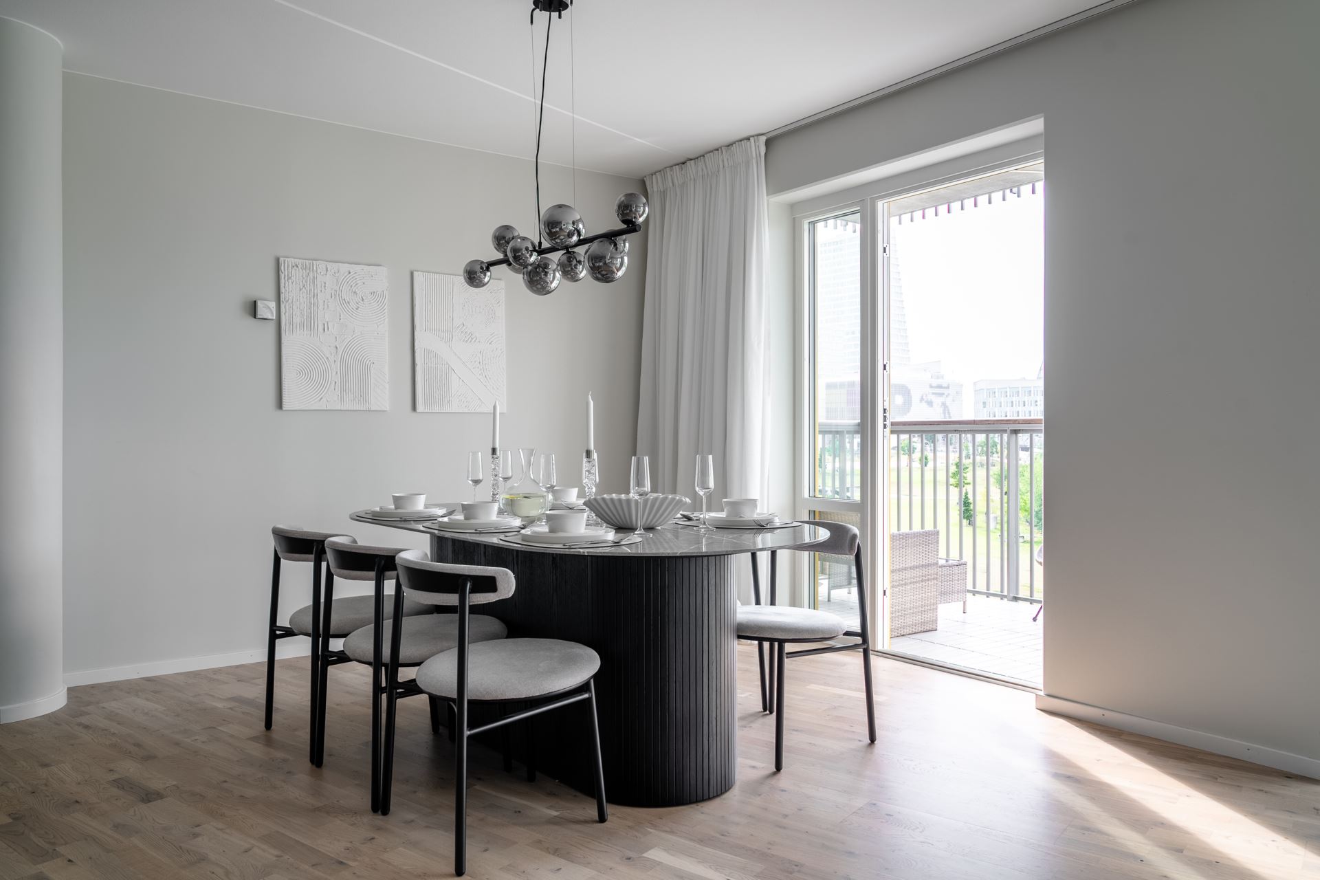 Ljust och trivsamt vardagsrum som enkelt möbleras med soffgrupp, tv och större matbord. Från vardagsrummet finns utgången till den mysiga balkongen, belägen i härligt västerläge där vi kan njuta av många soltimmar och utsikt över den grönskande Dagvattenparken. Ett av de få lägen i området helt fritt från insyn och med svårslagen utsikt!