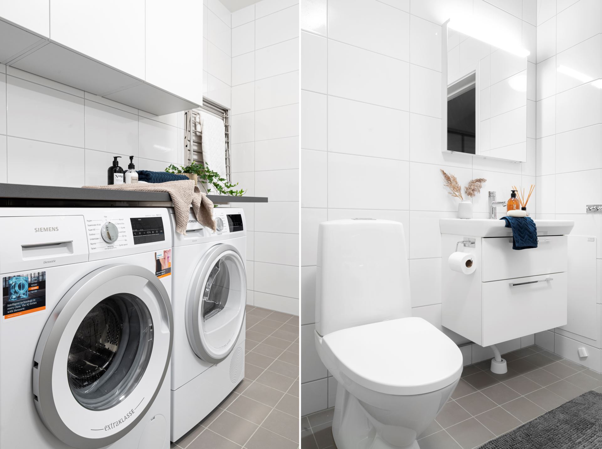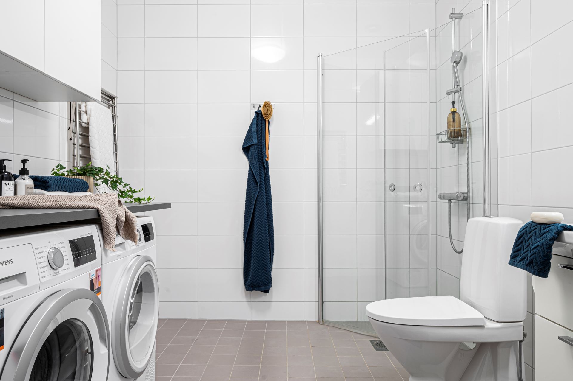 Helkaklat badrum med vitt kakel på väggarna och grått klinkers på golv, utrustat med WC, dusch bakom glasvägg, handfat med kommod och spegel ovanför, tvättmaskin och torktumlare. Bänkyta finns ovanför tvätt, -tork även förvaringsskåp ovanför.