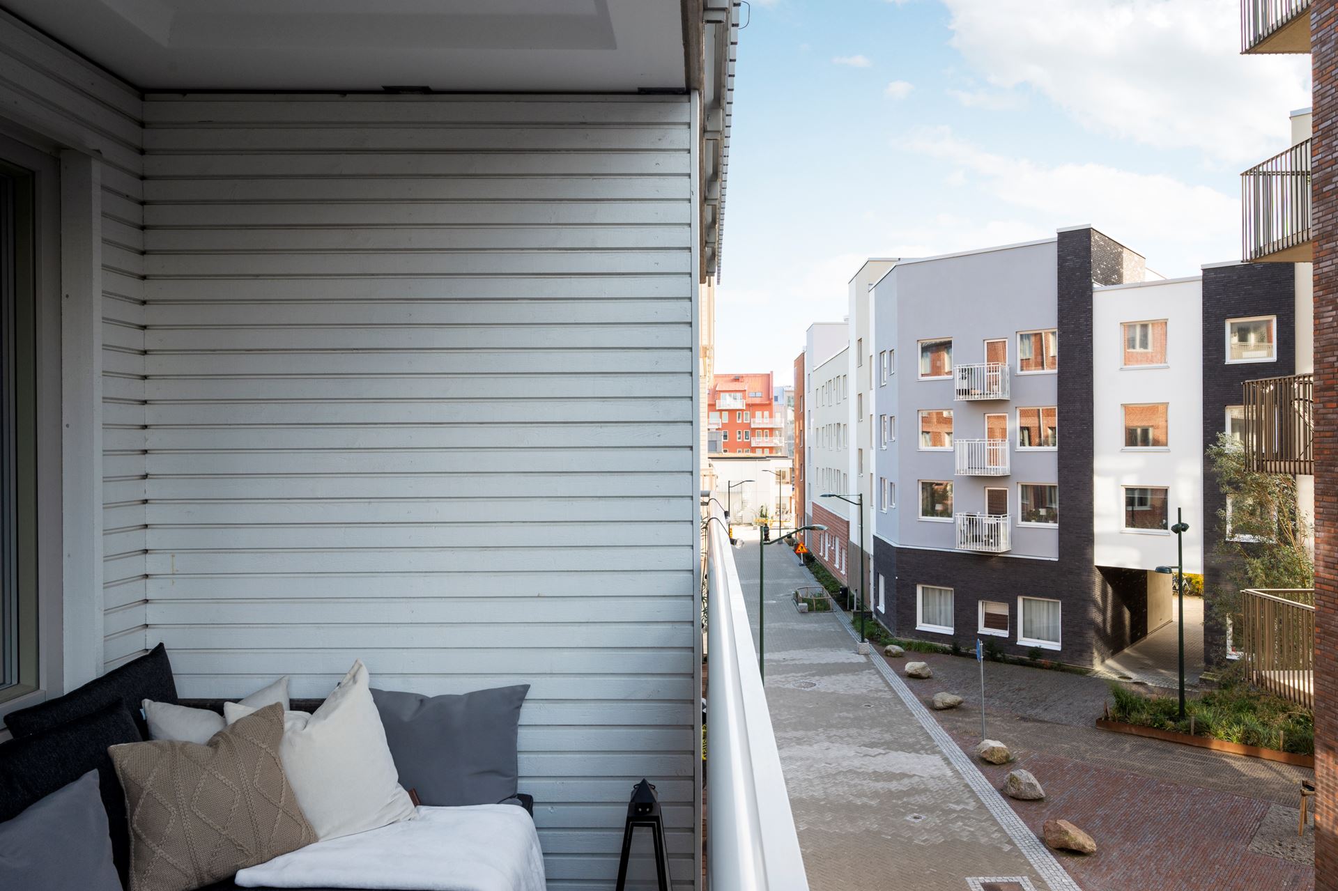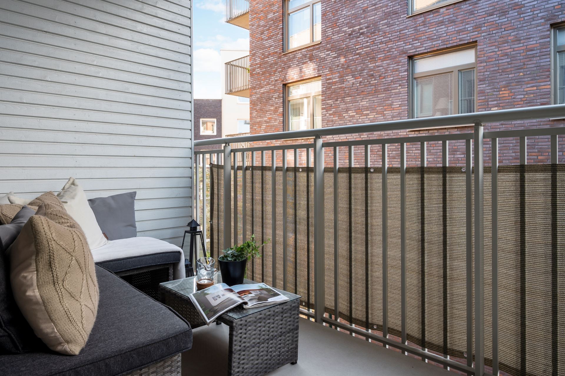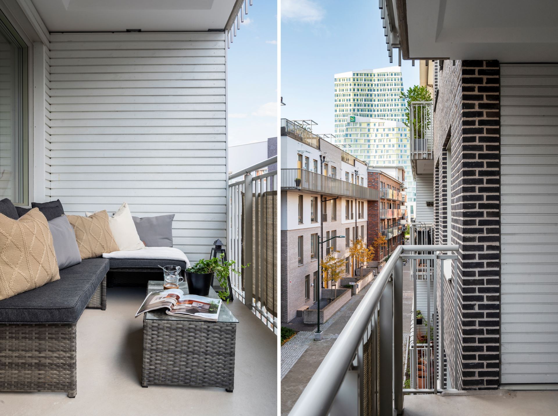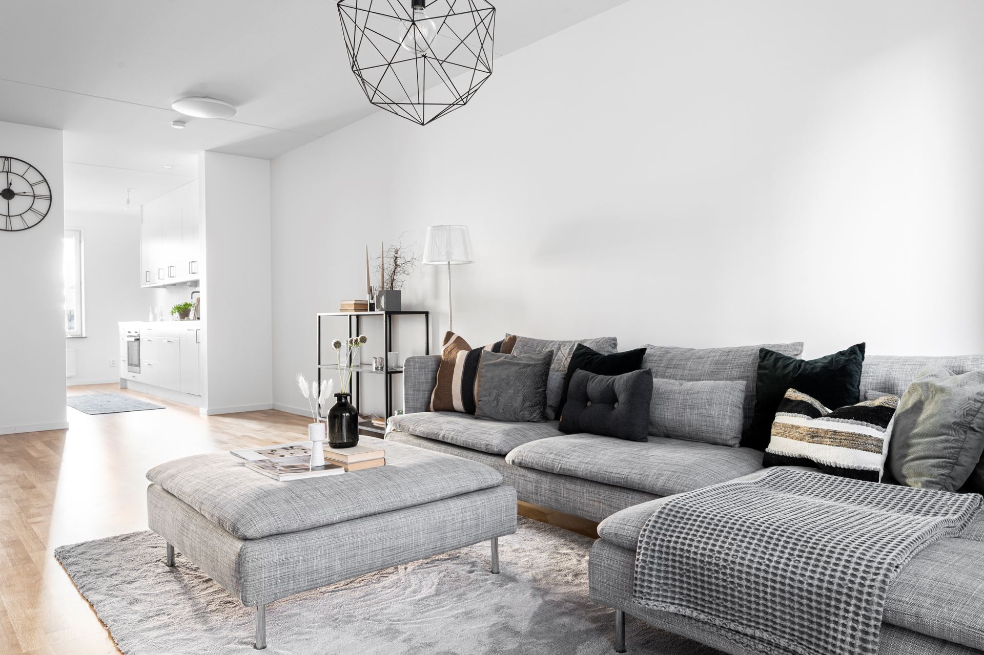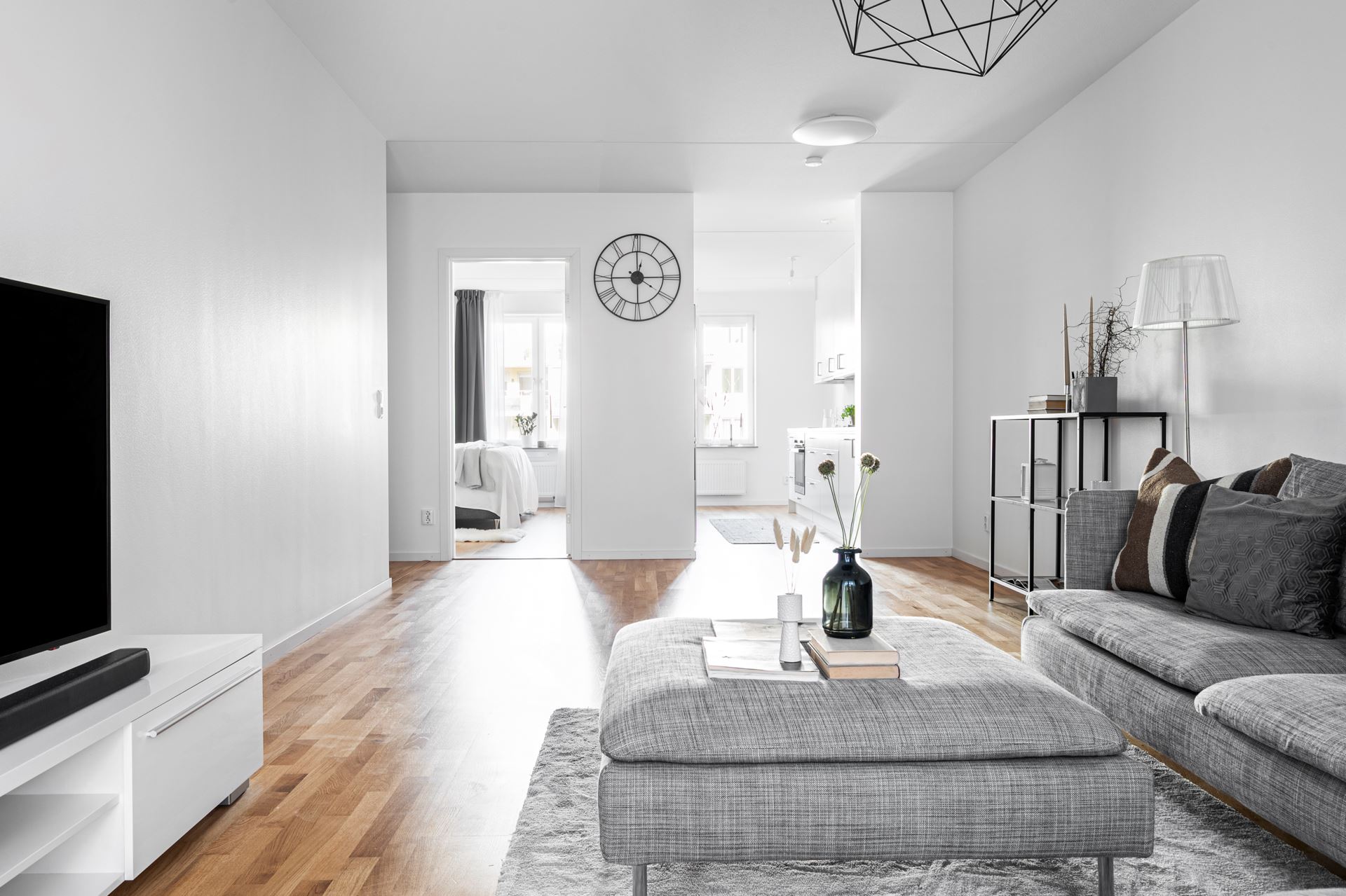Vidare öppnar lägenheten upp med vardagsrum. Rymligt och trevligt rum med ljusinsläpp från fönsterparti, det ger plats för att möblera med större soffgrupp och möjlighet till matplats om så önskas. Från vardagsrummet vi når balkongen som är belägen mot mysig gränd, även här finns gott om plats för utemöblering. I övrigt släta vita väggar som kombineras med snyggt ekparkett som återfinns i hela lägenheten.