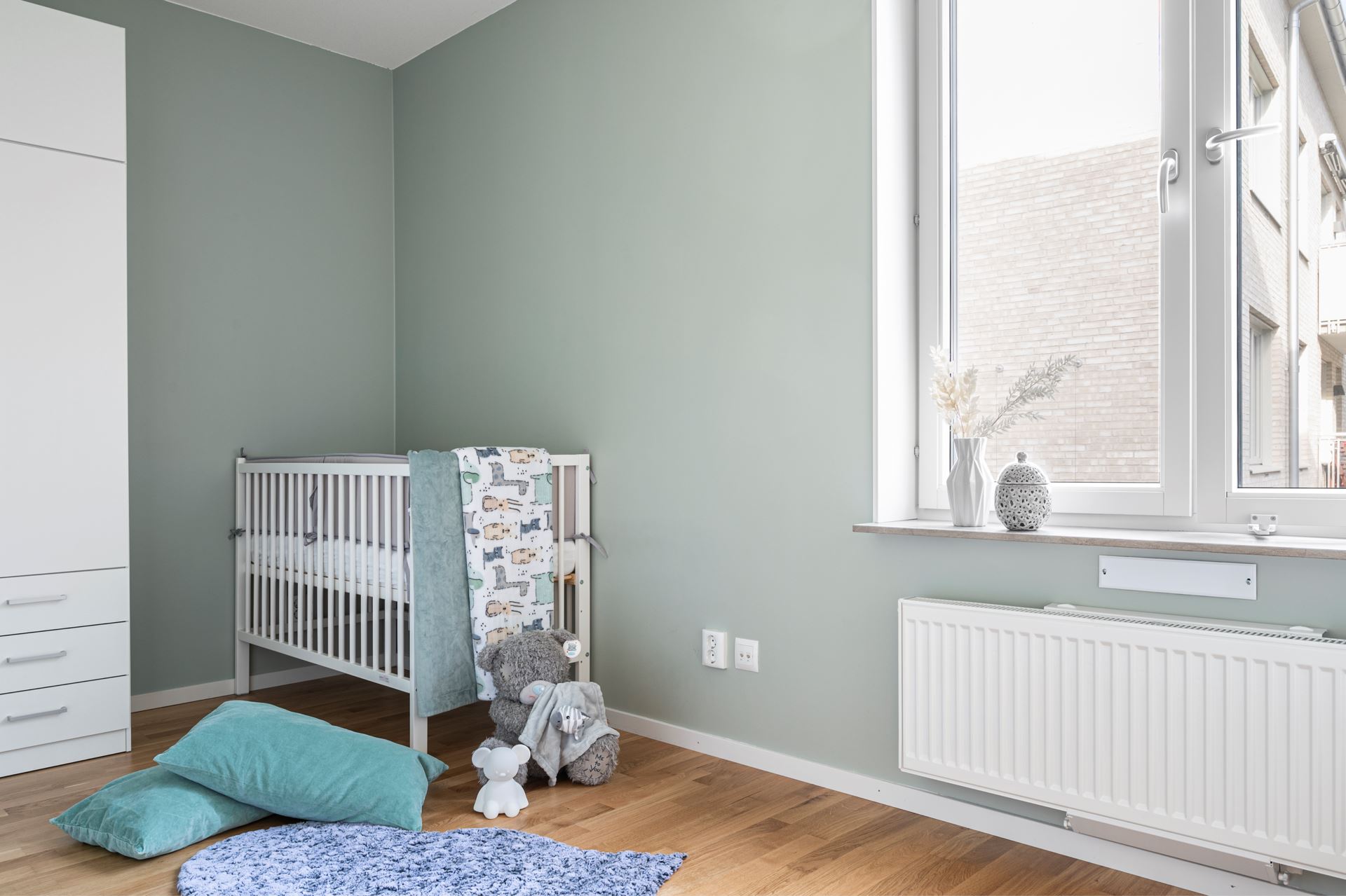 Vänster om hallen hittar vi det första sovrummet. Funkar perfekt som ett barnrum/gästrum där det finns plats för säng och skrivbord, passar även som kontorsrum om så önskas. Här finns även ytterligare plats för förvaringsmöbler.
