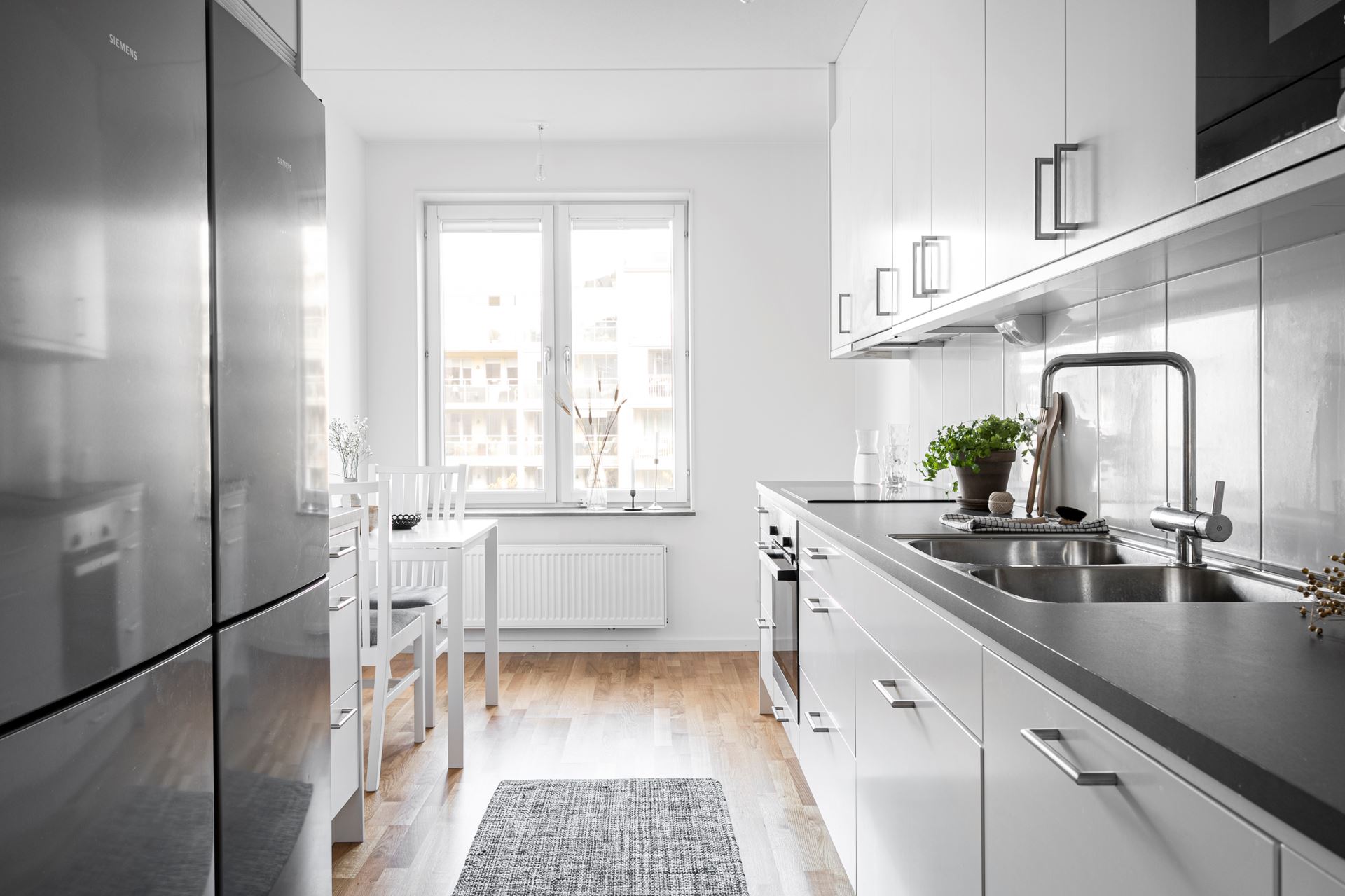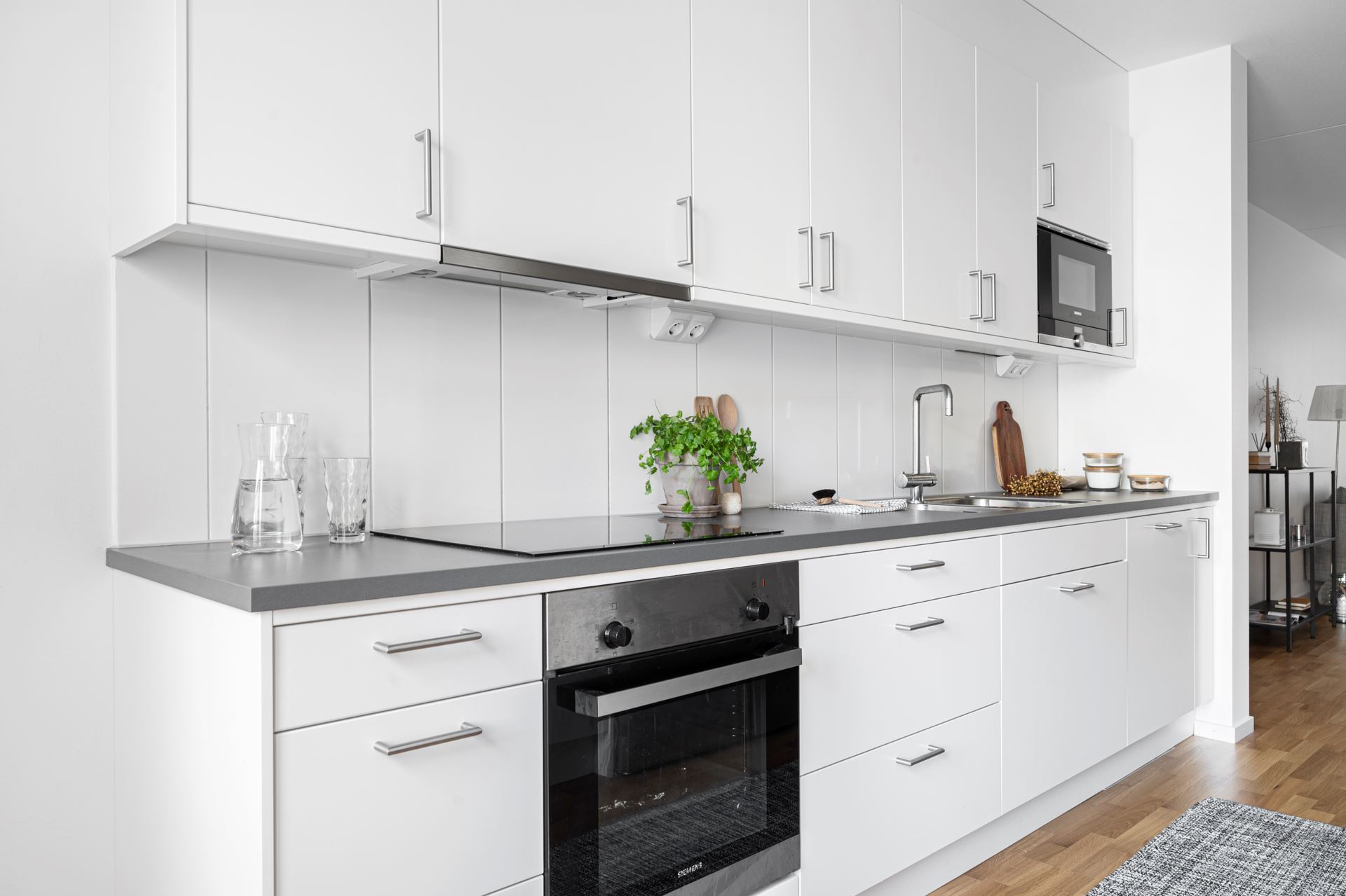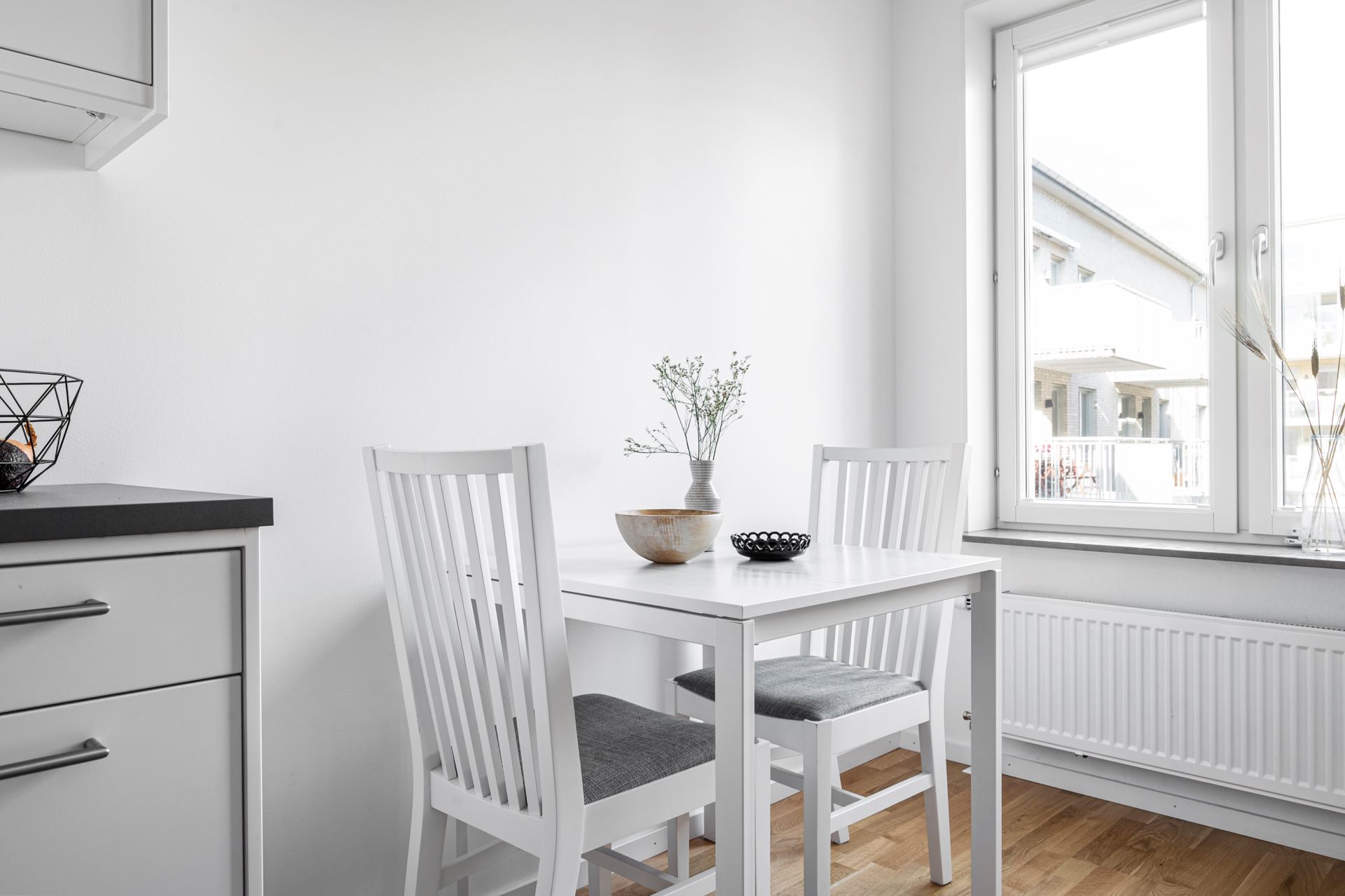 Till vänster om vardagsrummet ligger köket i öppen planlösning. Ett stilrent Vedum-kök, utmärkt förvaringsutrymme bakom vita köksluckor som kombineras med vitt kakel och en grå laminatbänkskiva som arbetsyta. Köket är utrustat med hel kyl och frys, mikrovågsugn, spishäll, köksfläkt och diskmaskin. Här finns plats för mindre matbord mot fönsterparti som tillför extra ljusinsläpp.