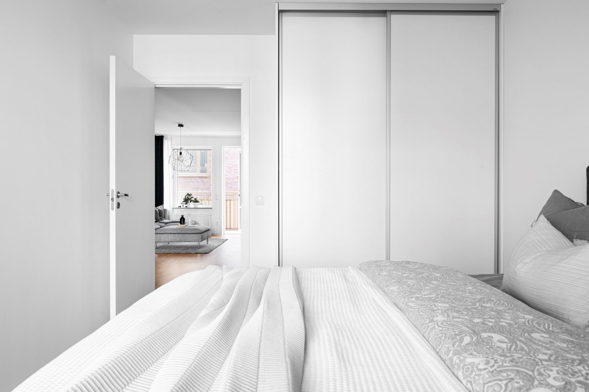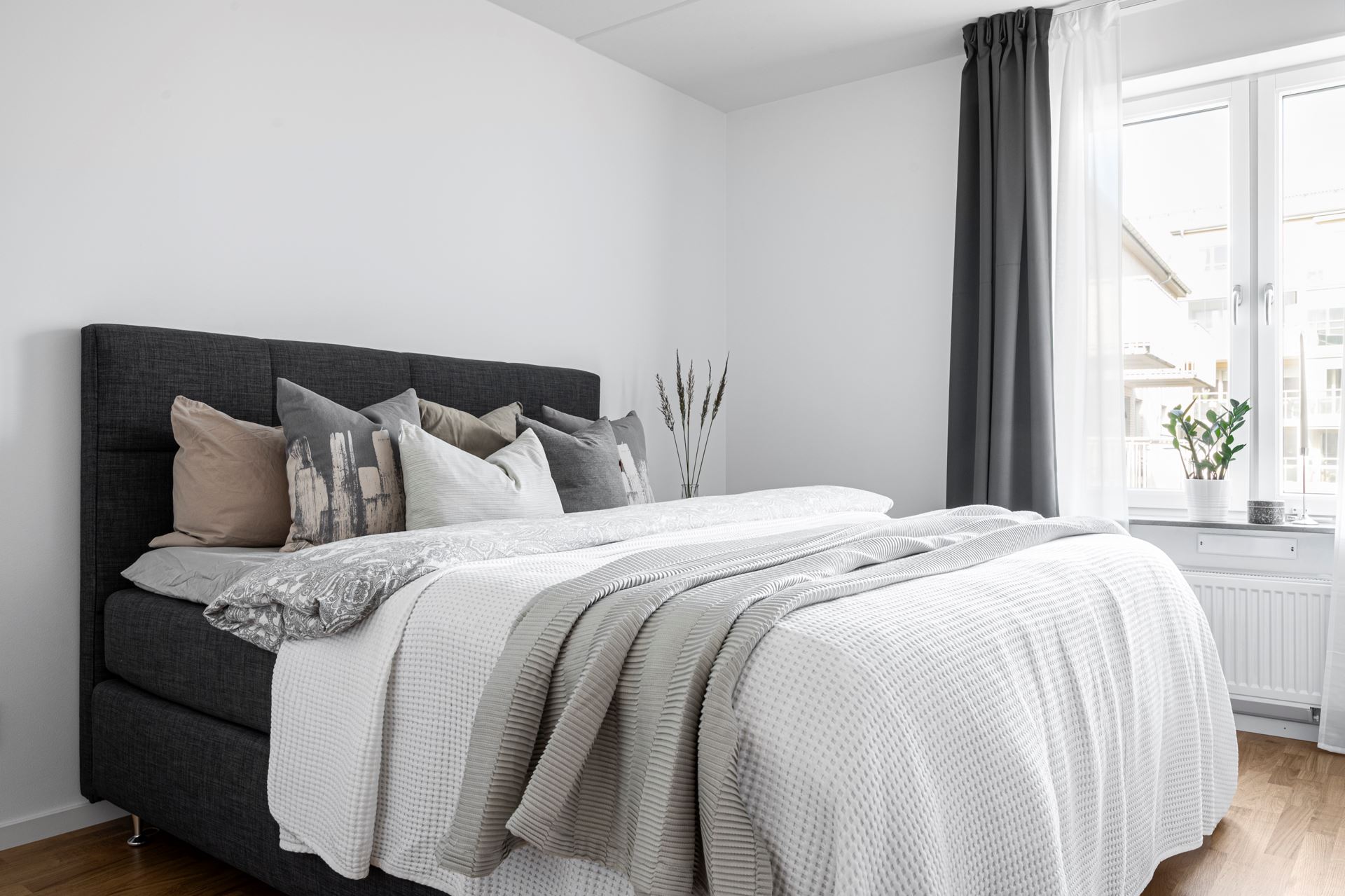 Vägg i vägg hittar vi master bedroom, ett rymligt rum med gott om plats för dubbelsäng, sängbord och mer därtill. Ytterligare förvaringsmöjligheter finns bakom skjutdörrsgarderober.
