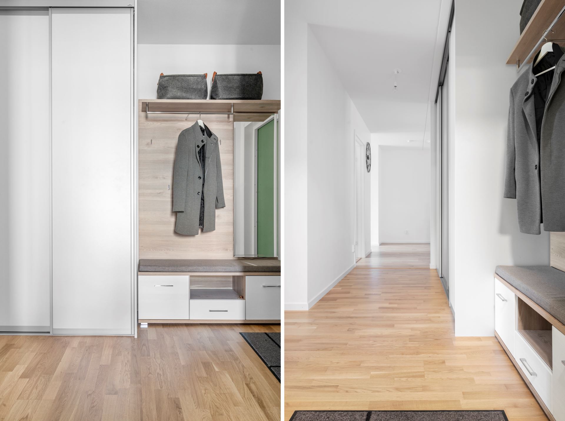 Vi tar hissen upp till tredje våningen och välkomnas av trivsam hallmiljö, med ekparkett på golv som samspelar fint med stilrena vita väggar. Här finns utmärkt plats för avhängningsmöjligheter till höger. Mer förvaringsutrymme hittar vi bakom praktiska skjutdörrsgarderober.