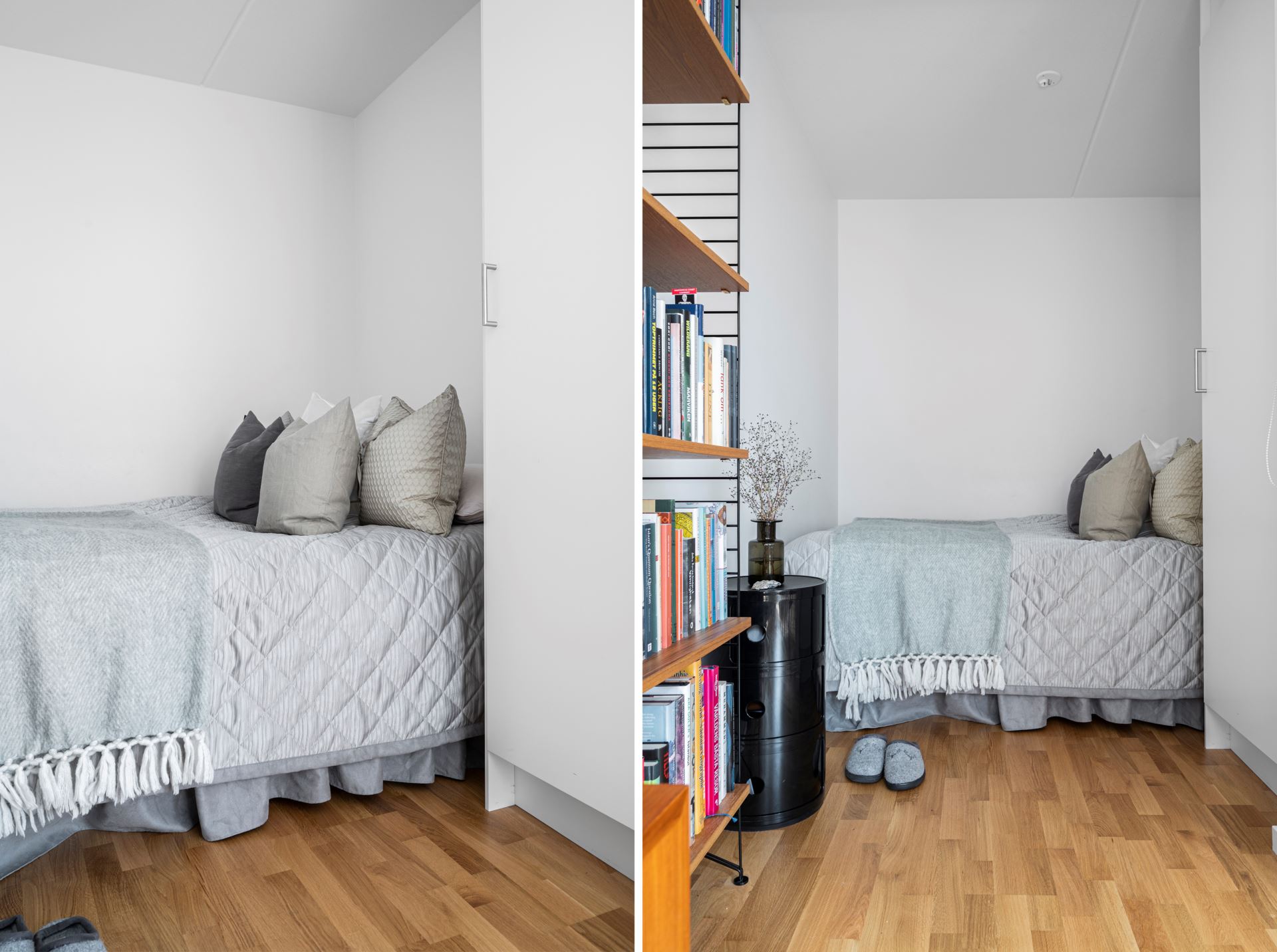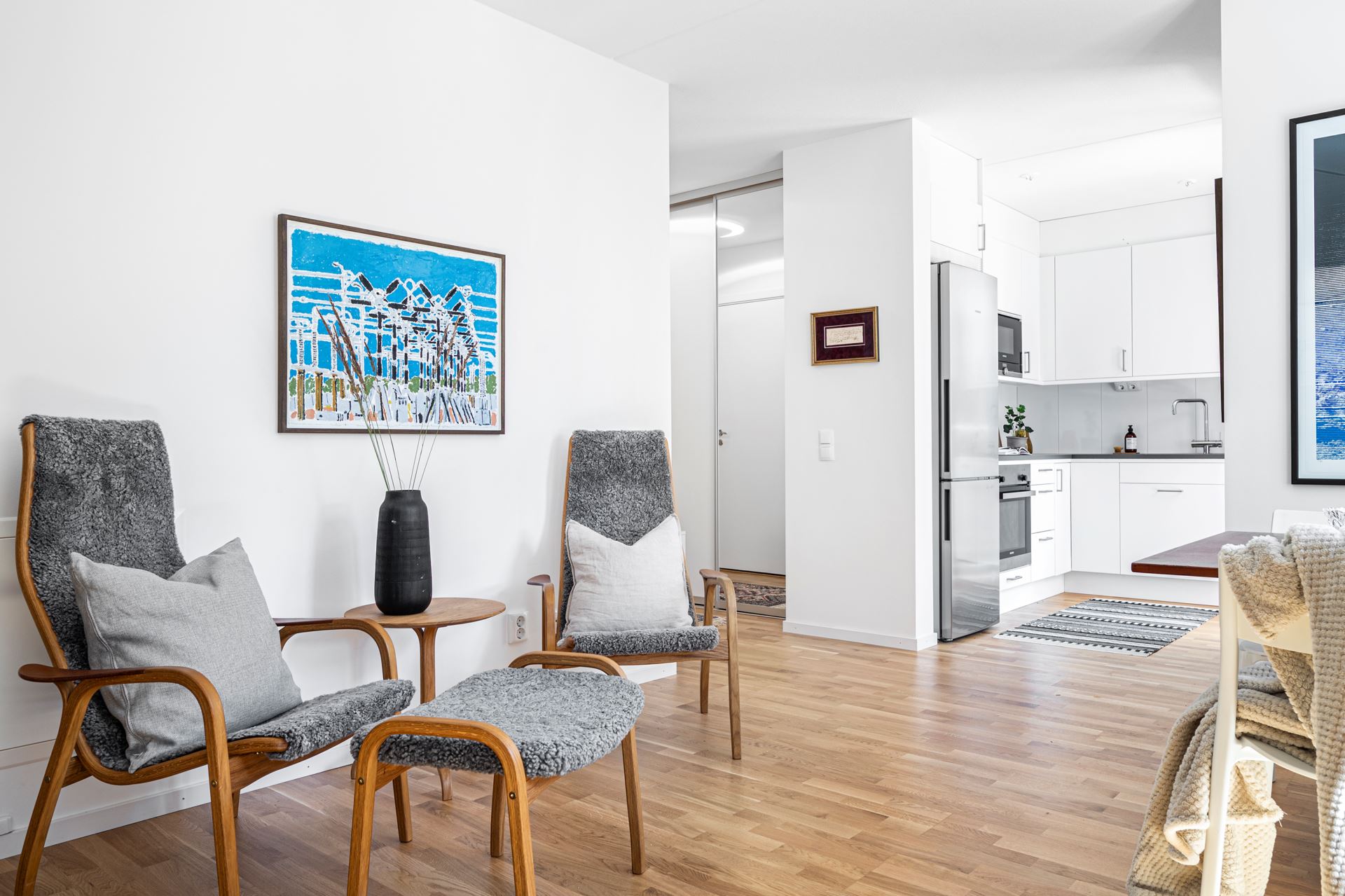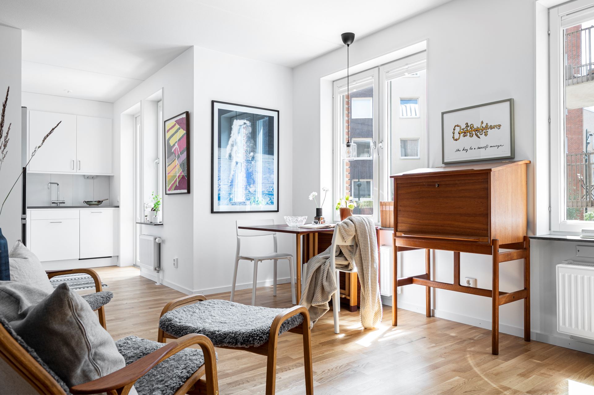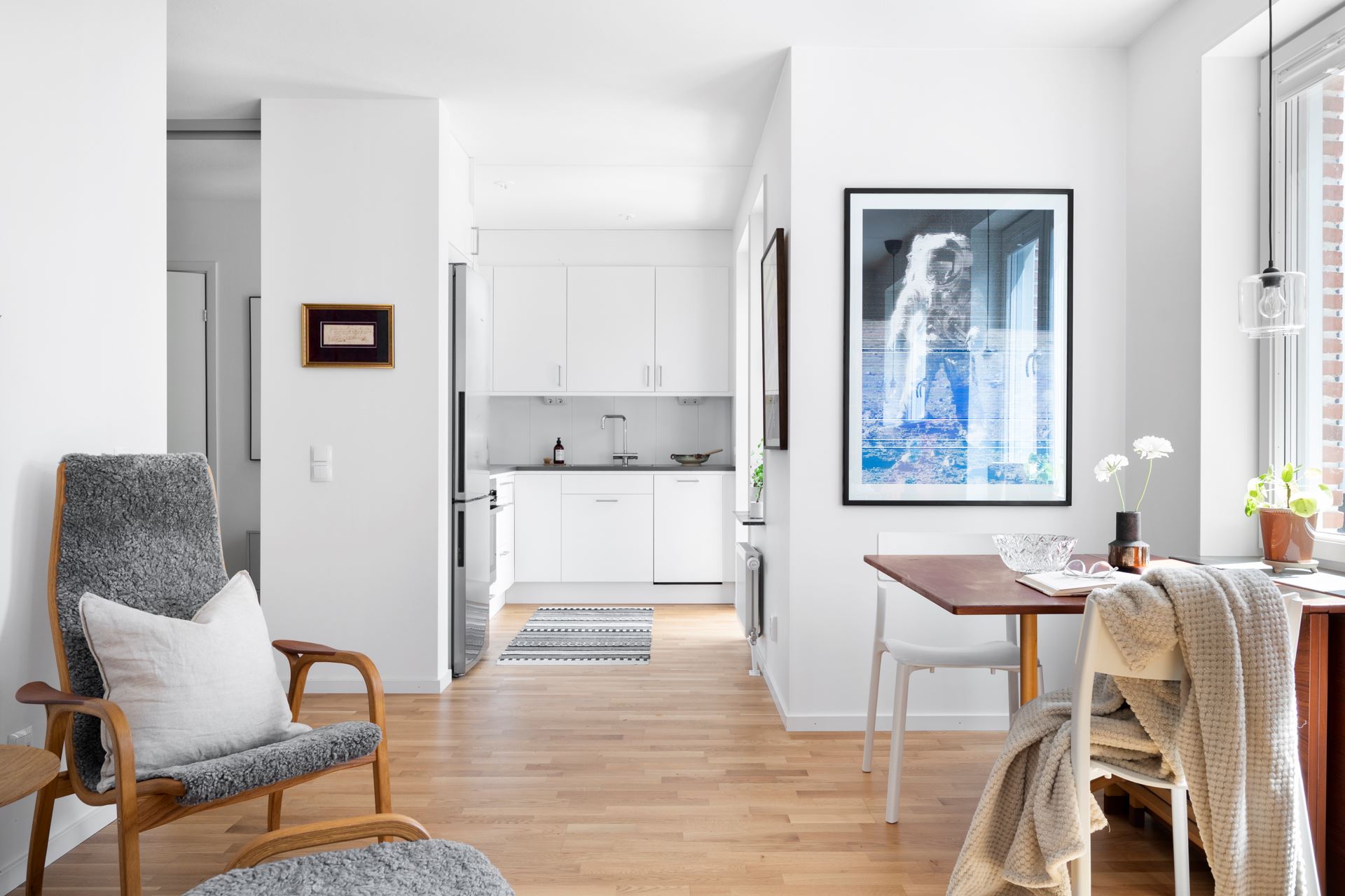 Vidare in öppnar lägenheten upp med allrum som rymmer gott om plats för såväl soffgrupp som matbordshörna. Ekparkett på golv kombineras med släta vita väggar. Praktisk sovalkov där det finns plats för dubbelsäng samt ytterligare garderob till förvaring.
