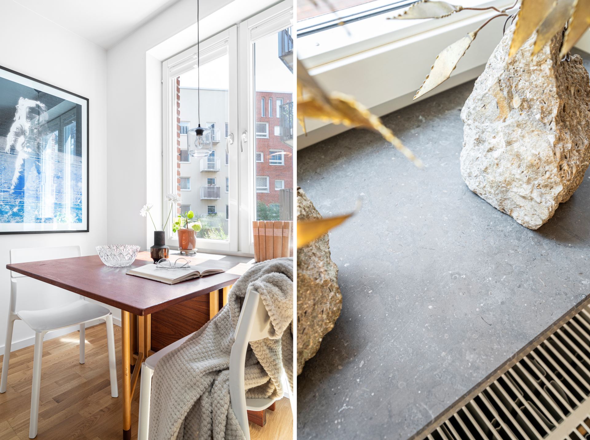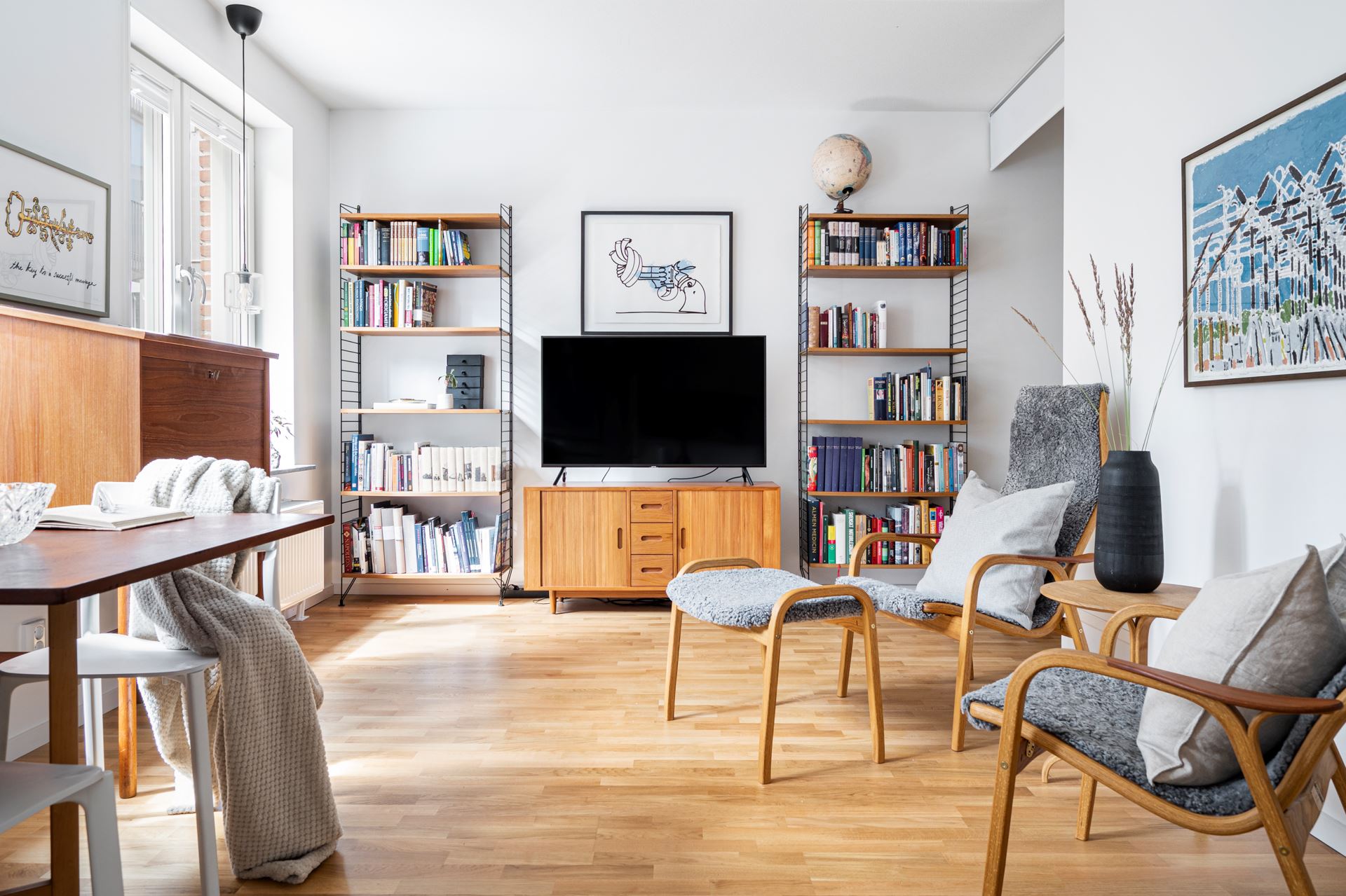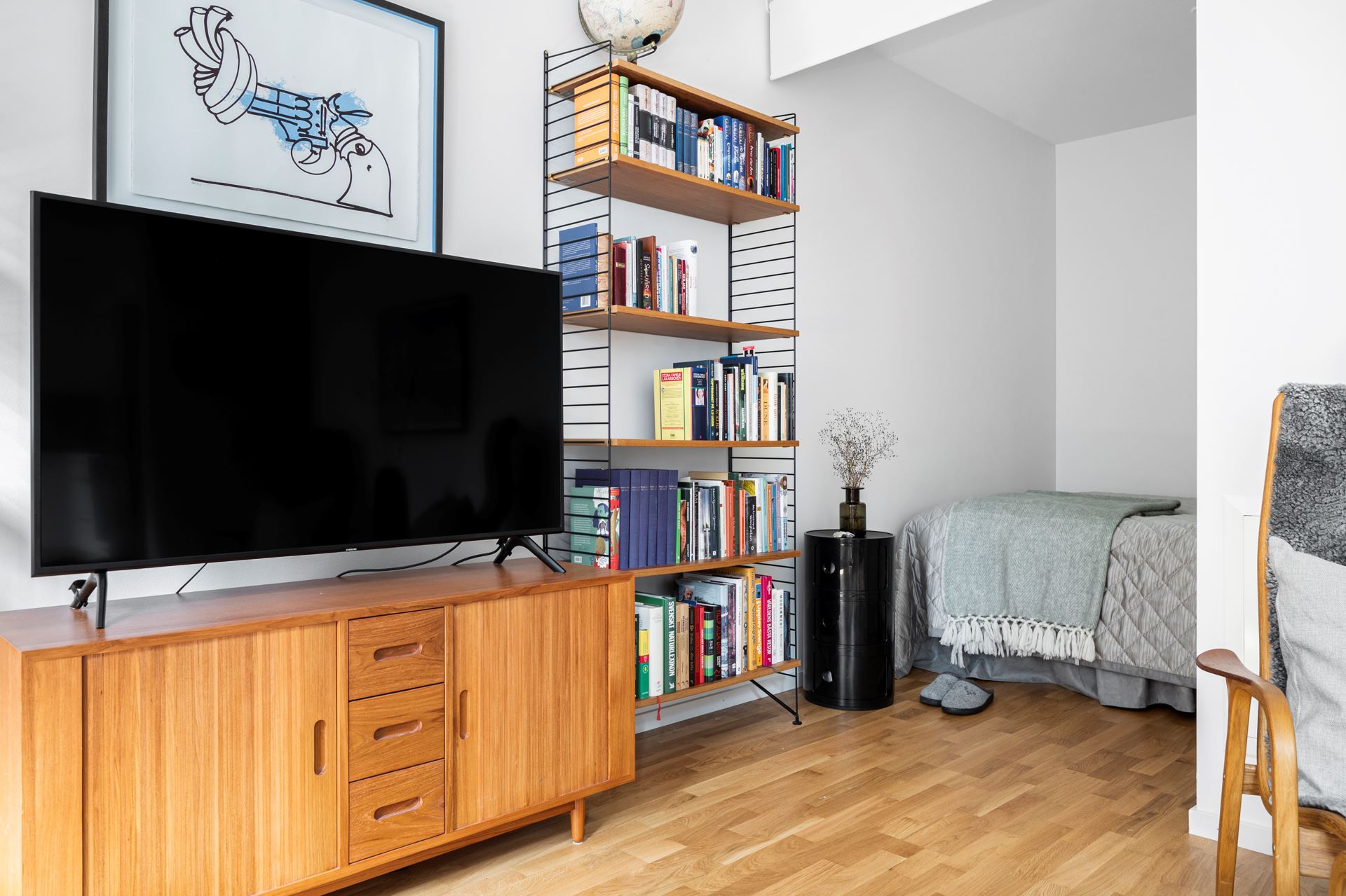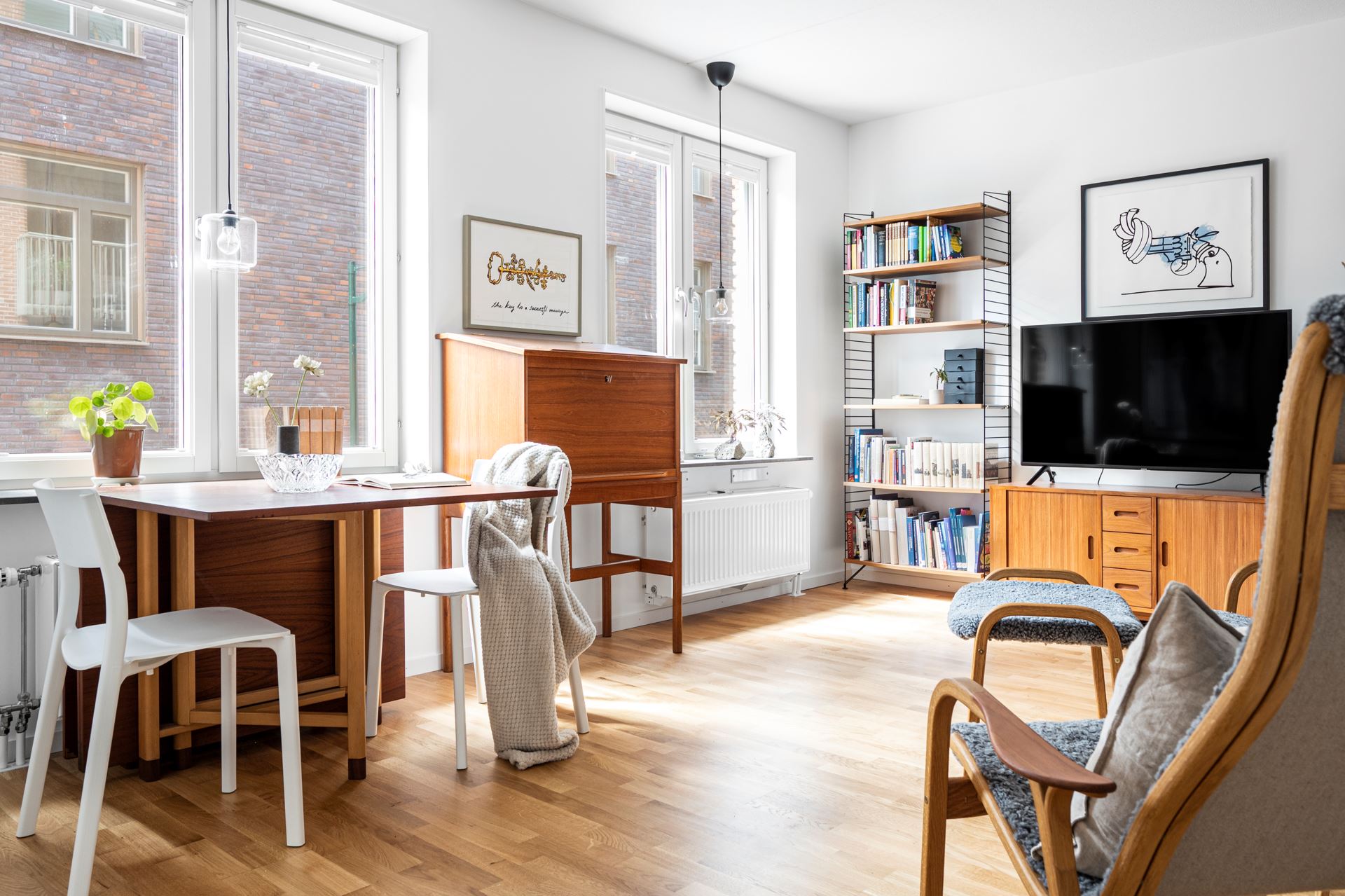Vidare in öppnar lägenheten upp med allrum som rymmer gott om plats för såväl soffgrupp som matbordshörna. Ekparkett på golv kombineras med släta vita väggar. Praktisk sovalkov där det finns plats för dubbelsäng samt ytterligare garderob till förvaring.