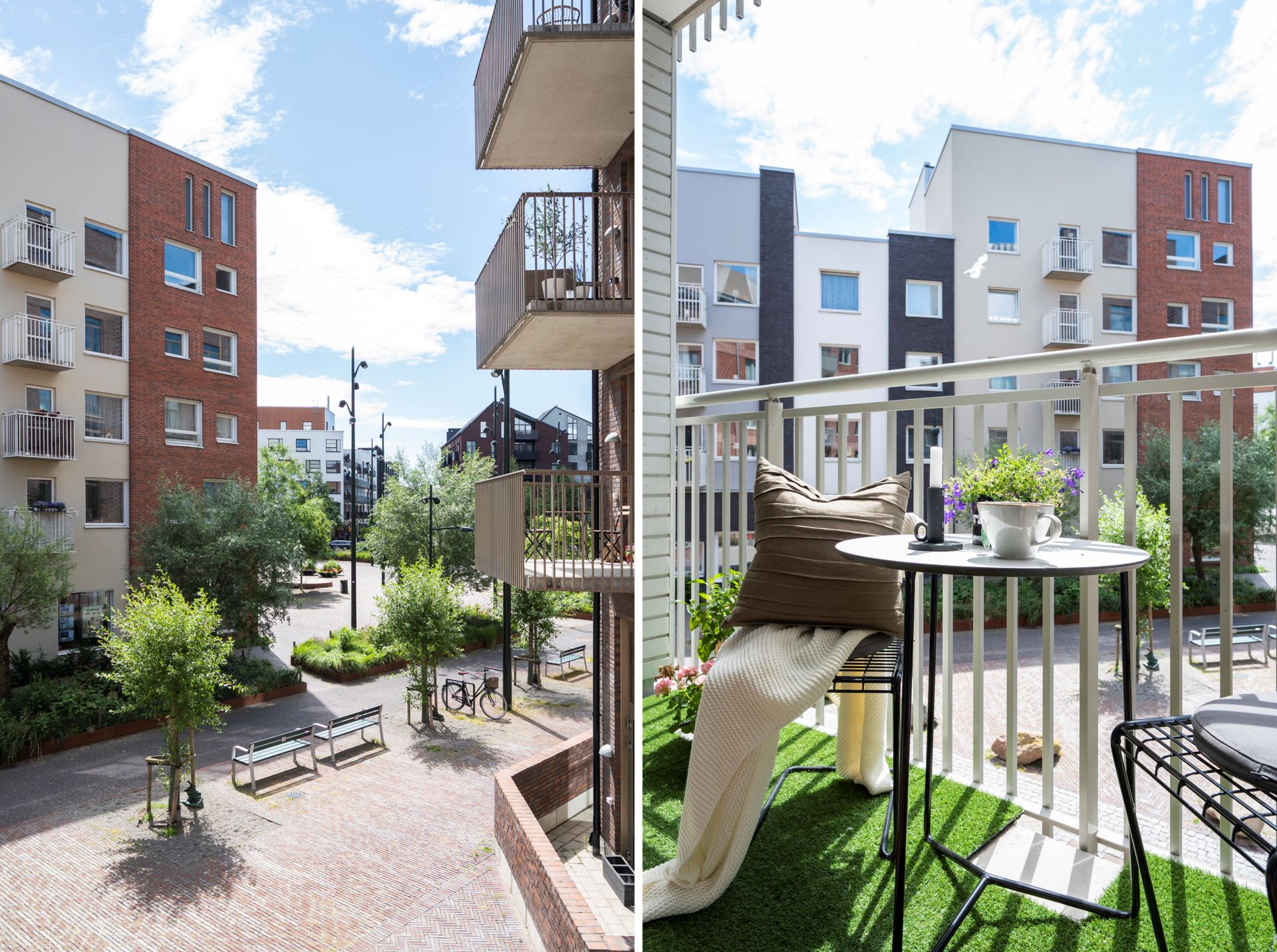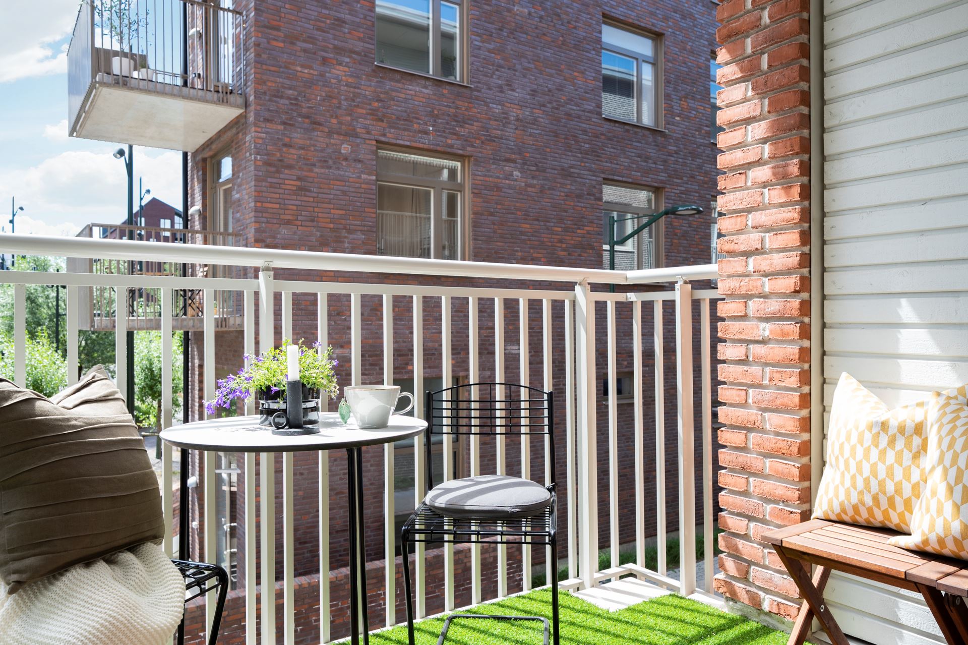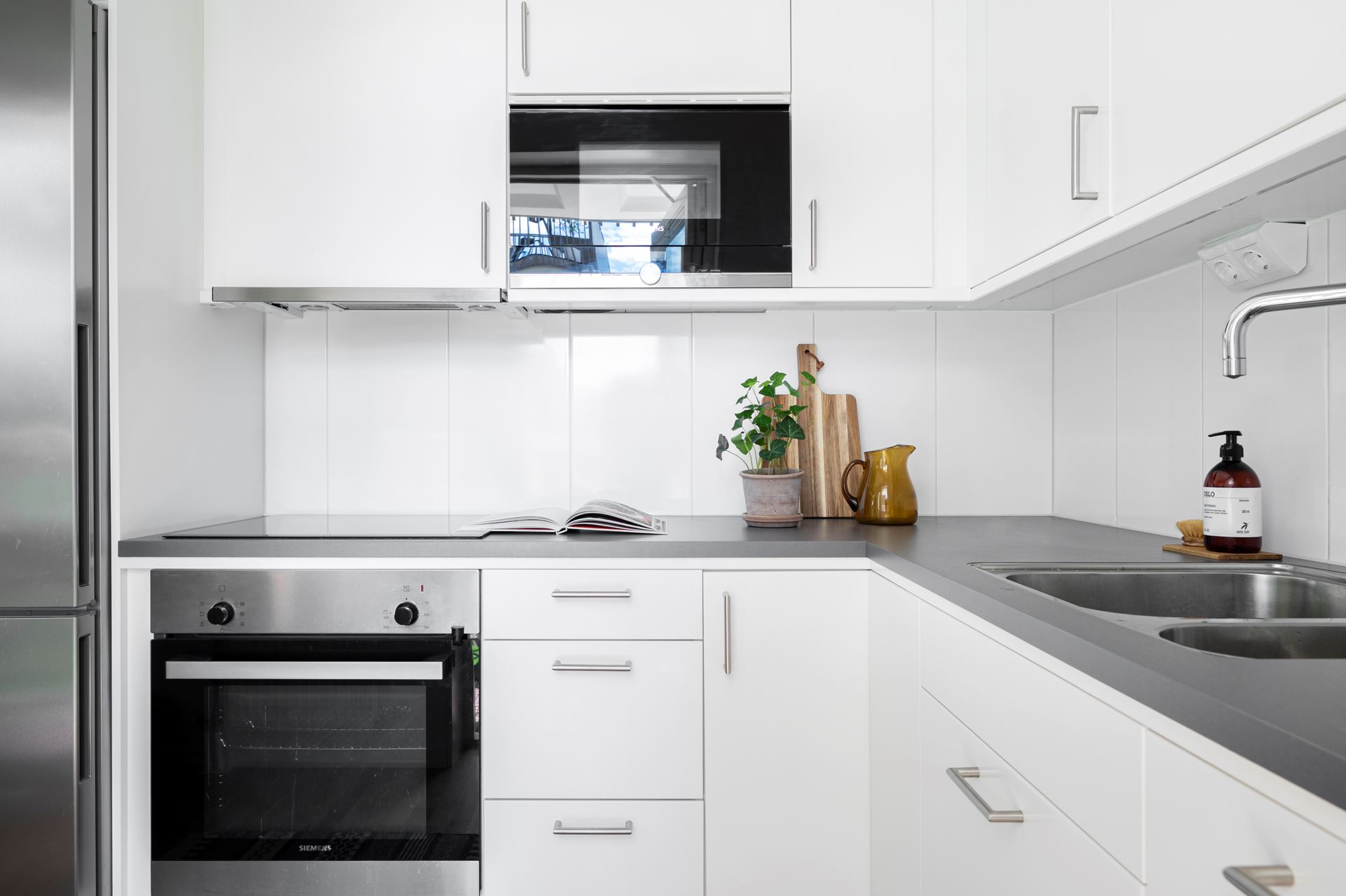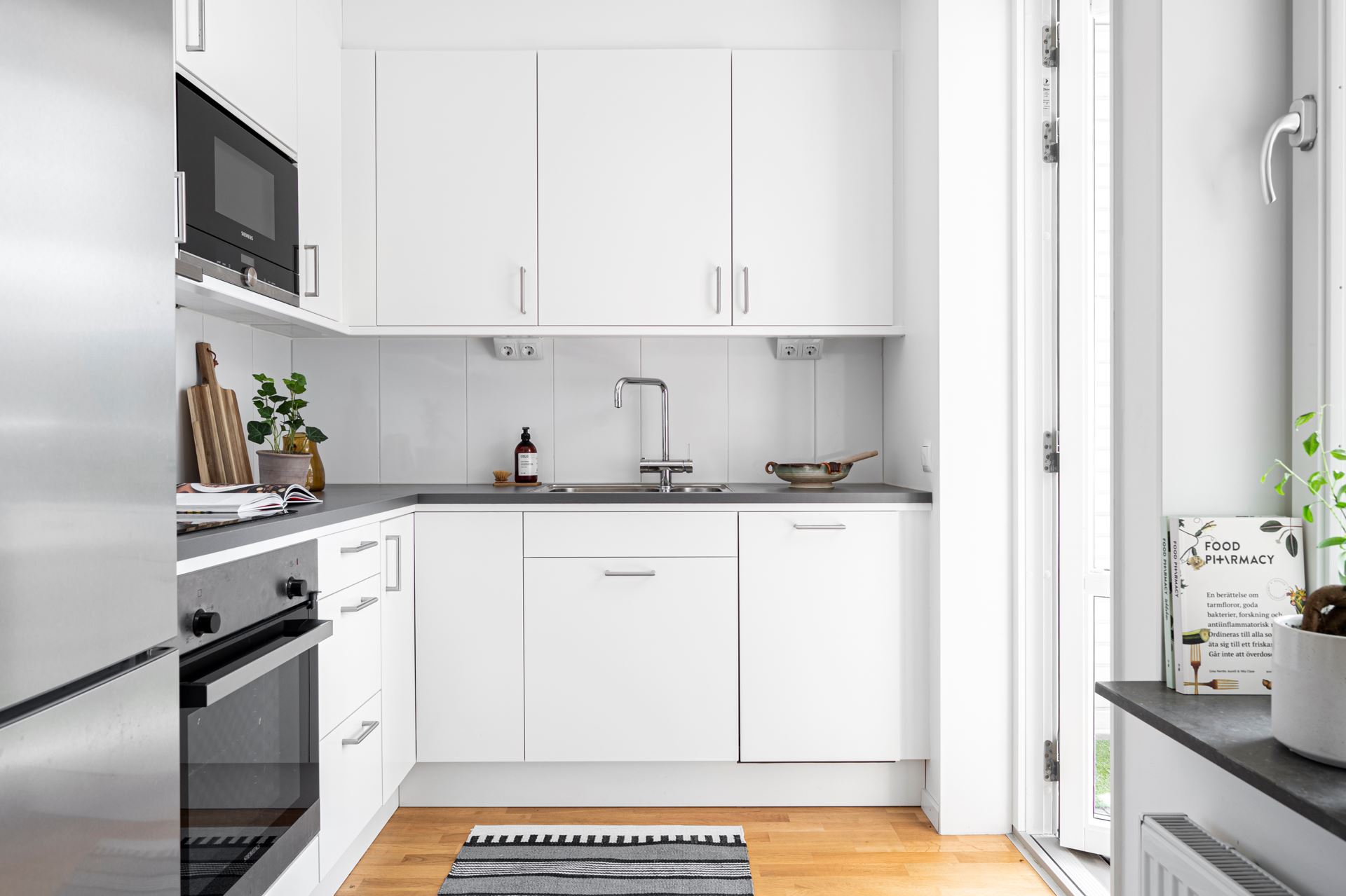 Vita köksluckor (Vedum) kombineras med vitt kakel och grå bänkskiva i laminat. Köket är utrustat med kyl och frys (Siemens), fläkt (Franke), spishäll (Siemens), integrerad diskmaskin (Siemens), mikro och ugn (Siemens). Från köket nås vidare den sköna balkongen belägen i soligt söderläge där vi kan njuta av fri utsikt över Allétorget!