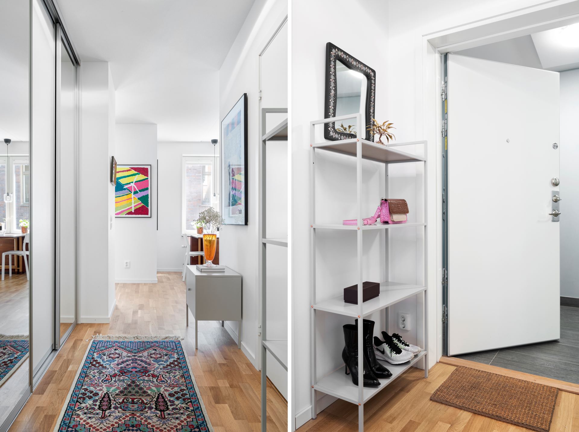 Vi tar hissen till andra våningen där hallen välkomnar med smakfull ekparkett på golv tillsammans med släta vita väggar, vilket är genomgående i hela bostaden. På vänster sida finns gott om plats till förvaring bakom spegelbeklädd skjutdörrsgarderob.