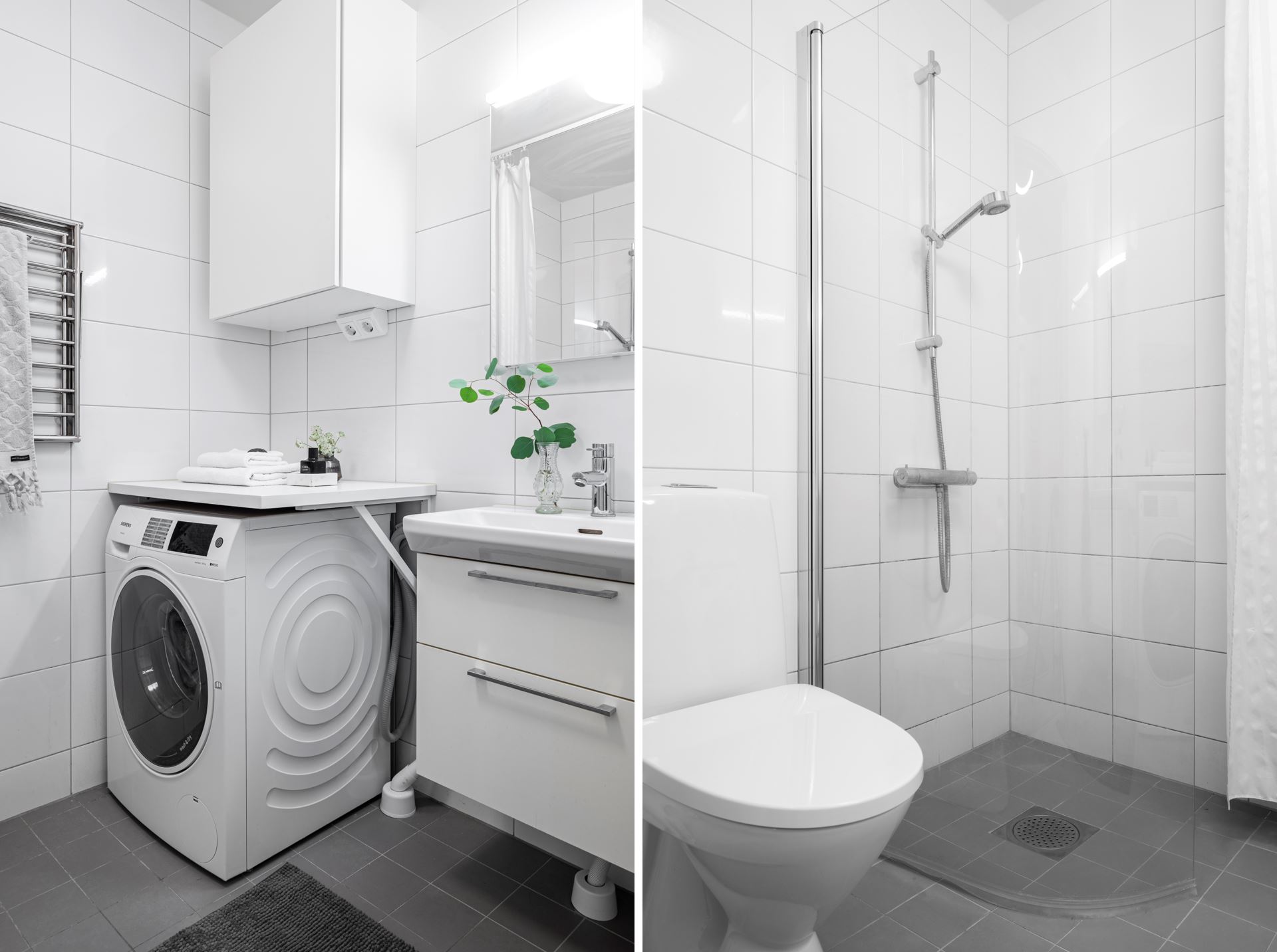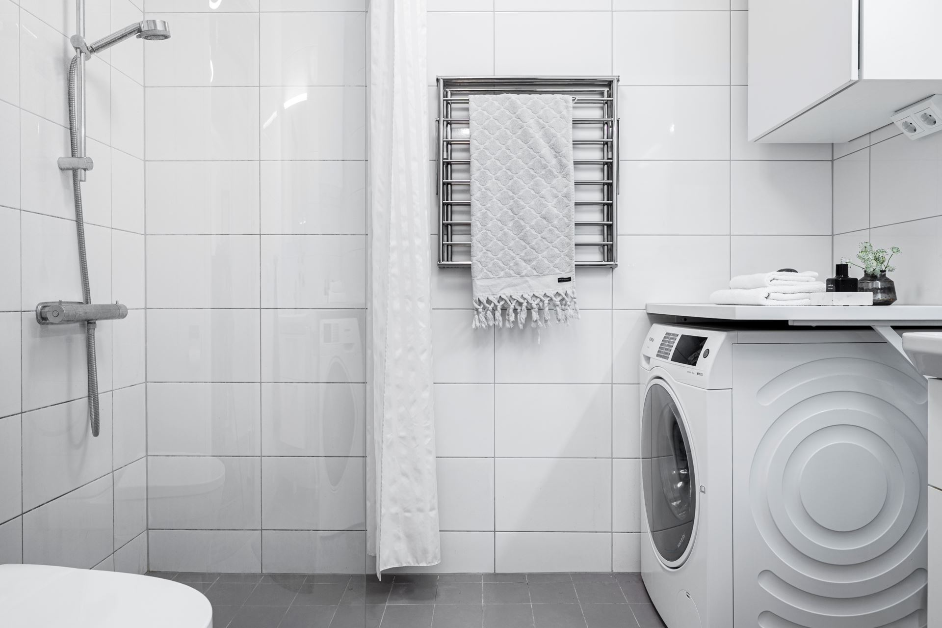 Helkaklat badrum med vitt kakel på väggarna tillsammans med mörkare klinkers på golv. Badrummet är utrustat med wc, handfat med kommod, spegel, dusch bakom glasvägg samt kombimaskin (Siemens).