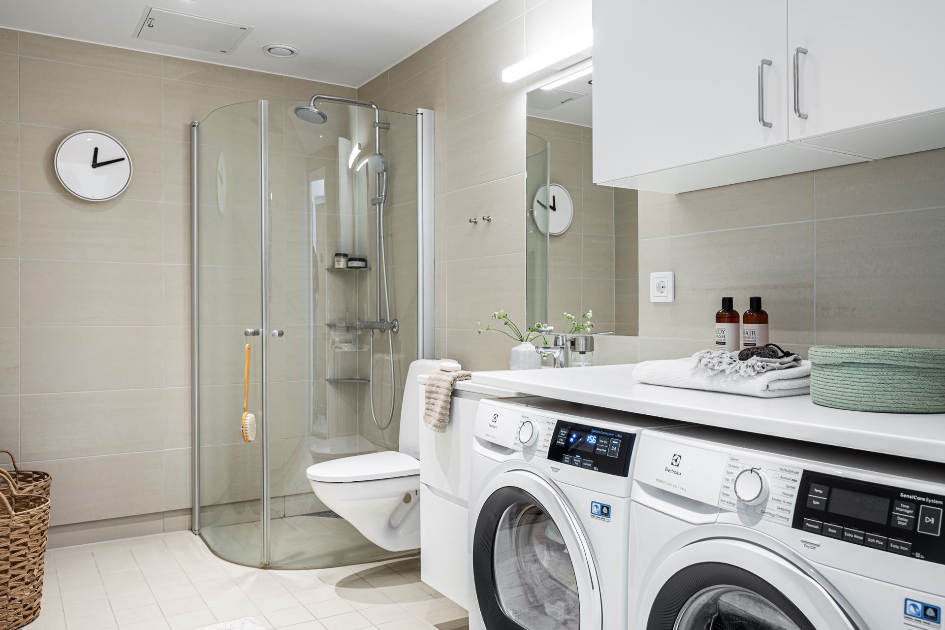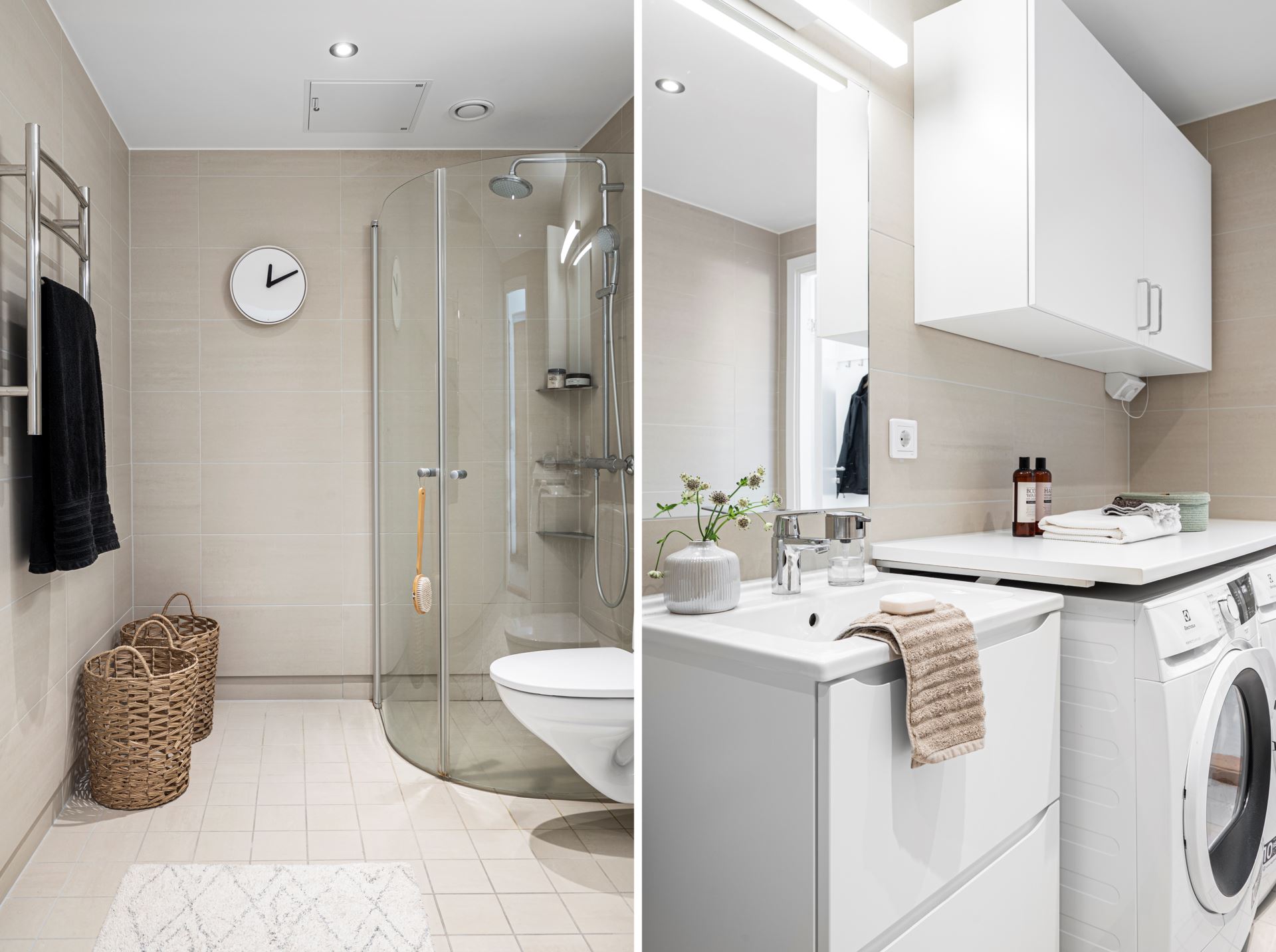 Helkaklad badrumsmiljö som bjuder på genomgående sobert beiga toner, både på kakel och klinkers. Badrummet är utrustat med vägghängd wc, takdusch bakom glasväggar, handfat med kommod, spegel, elektrisk handdukstork, tvättmaskin och torktumlare. Ytterligare skåpsförvaring ovanför tvätt,- och tork samt bänkskiva. Spotlights i tak och golvvärme för ytterligare komfort.