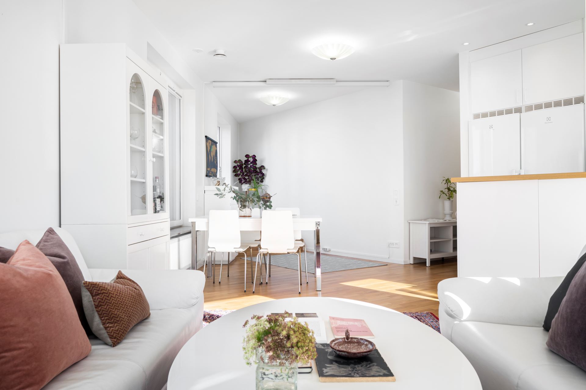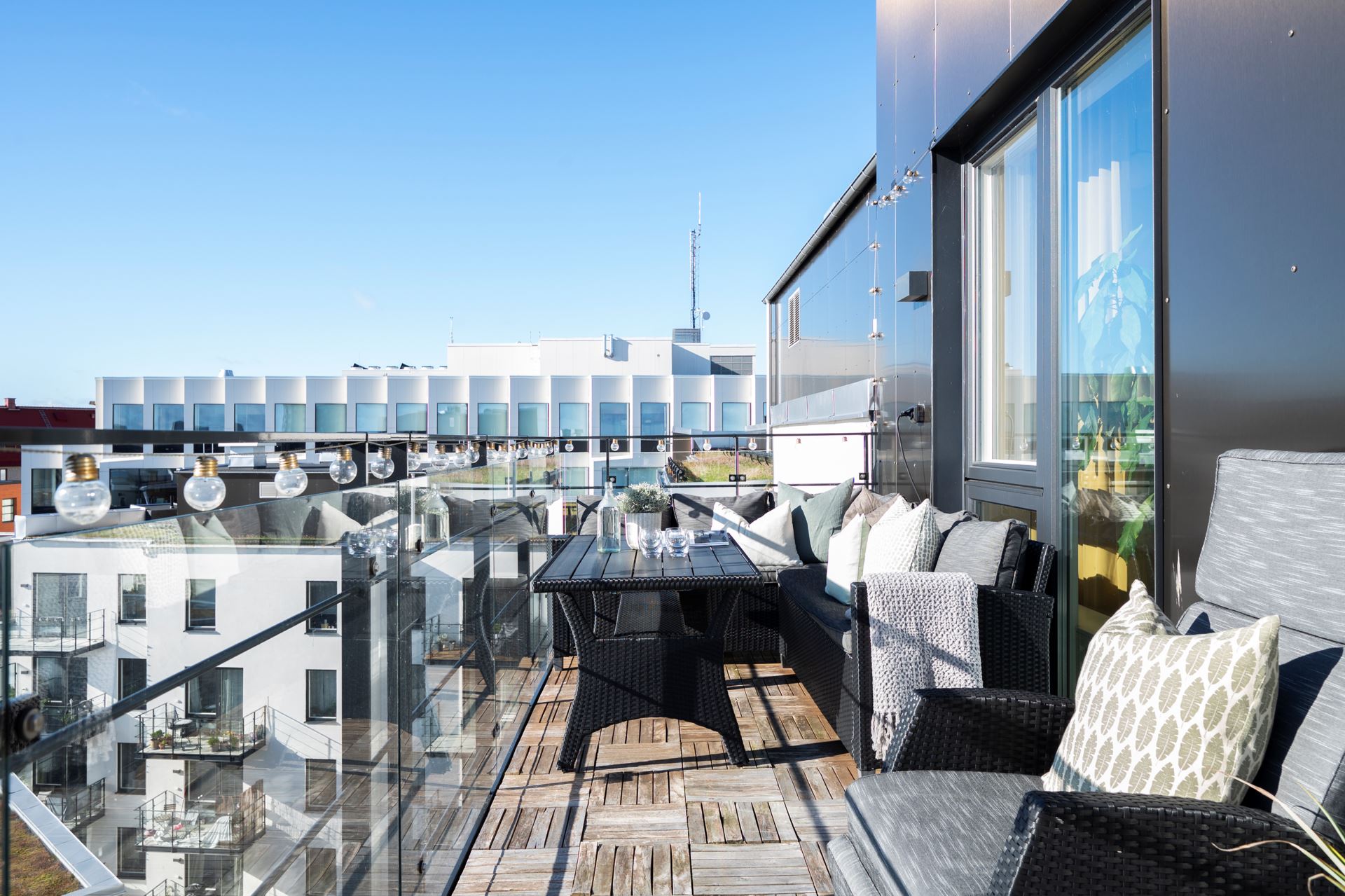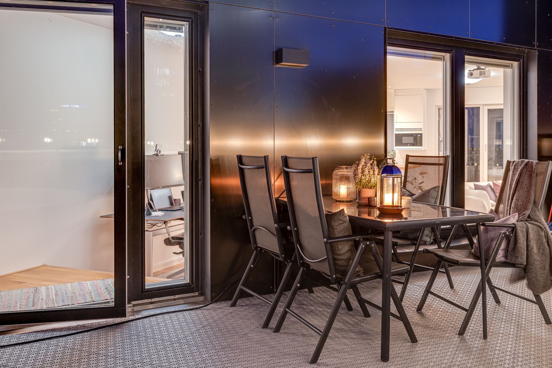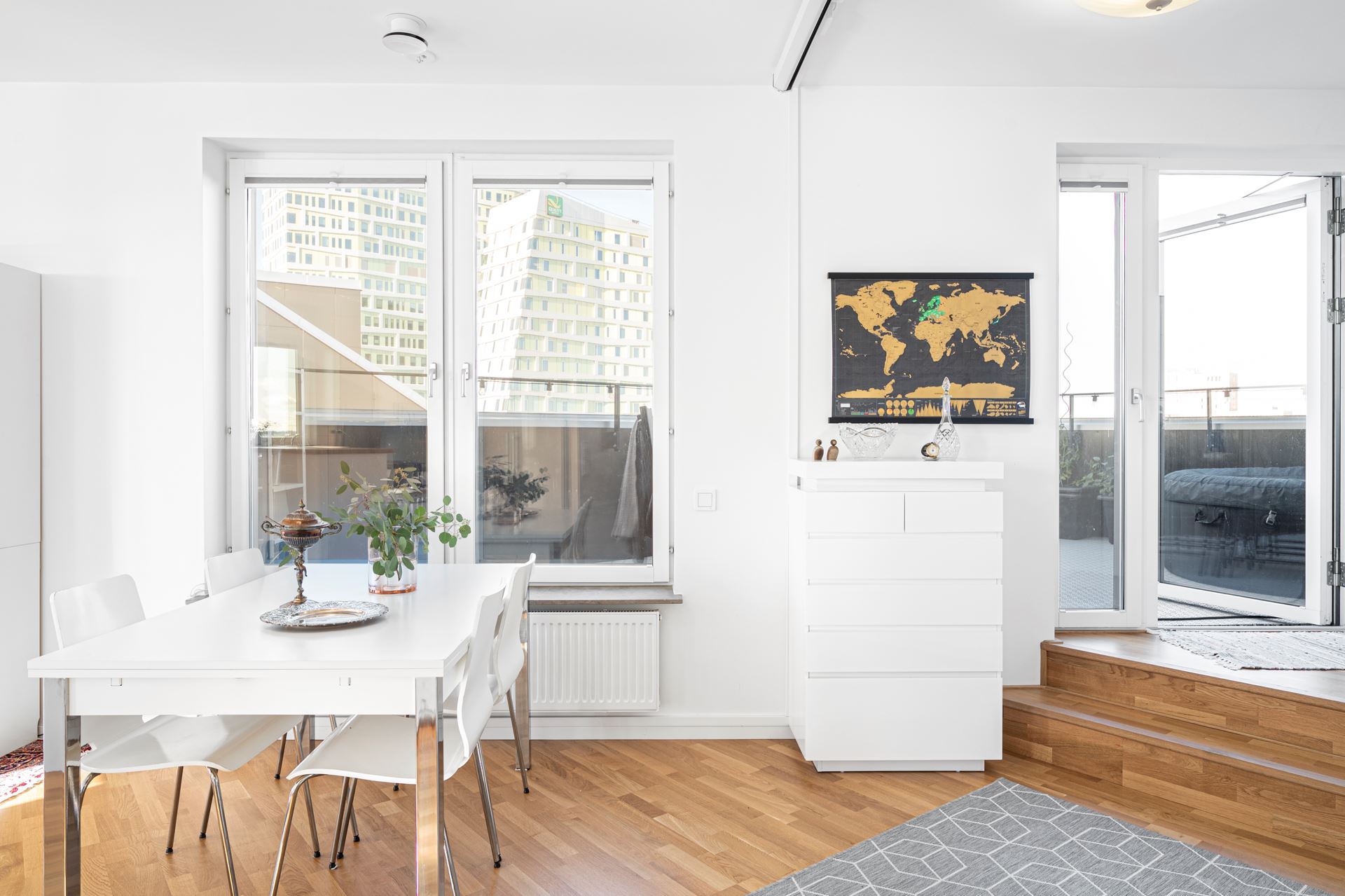 Vidare bjuder vardagsrummet in med ett slående ljusinsläpp ifrån stora fönsterpartier som sträcker sig från golv till tak. Här har vi även utgång till bostadens rymliga och härliga balkong. Här kan enkelt möbleras med såväl soffgrupp som ett större middagsbord på andra änden av rummet utan att den luftiga känslan går förlorad. Från middagsbordet tar vi två trappsteg upp och möts av bostadens helt egen takterrass, den otroligt rymliga takterrassen är perfekt som extra sällskapsyta, och här finns gott om plats för att möblera efter behov.