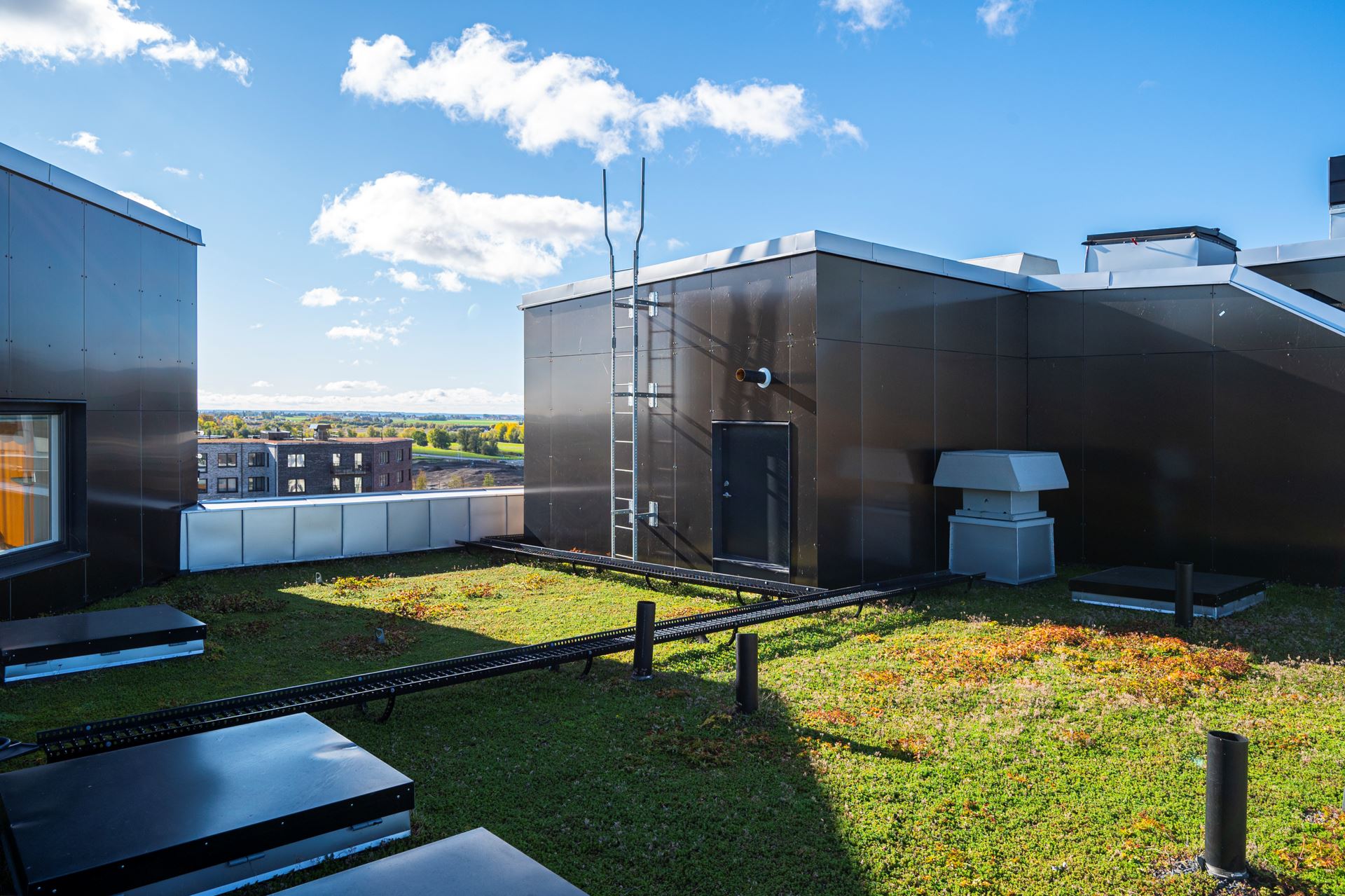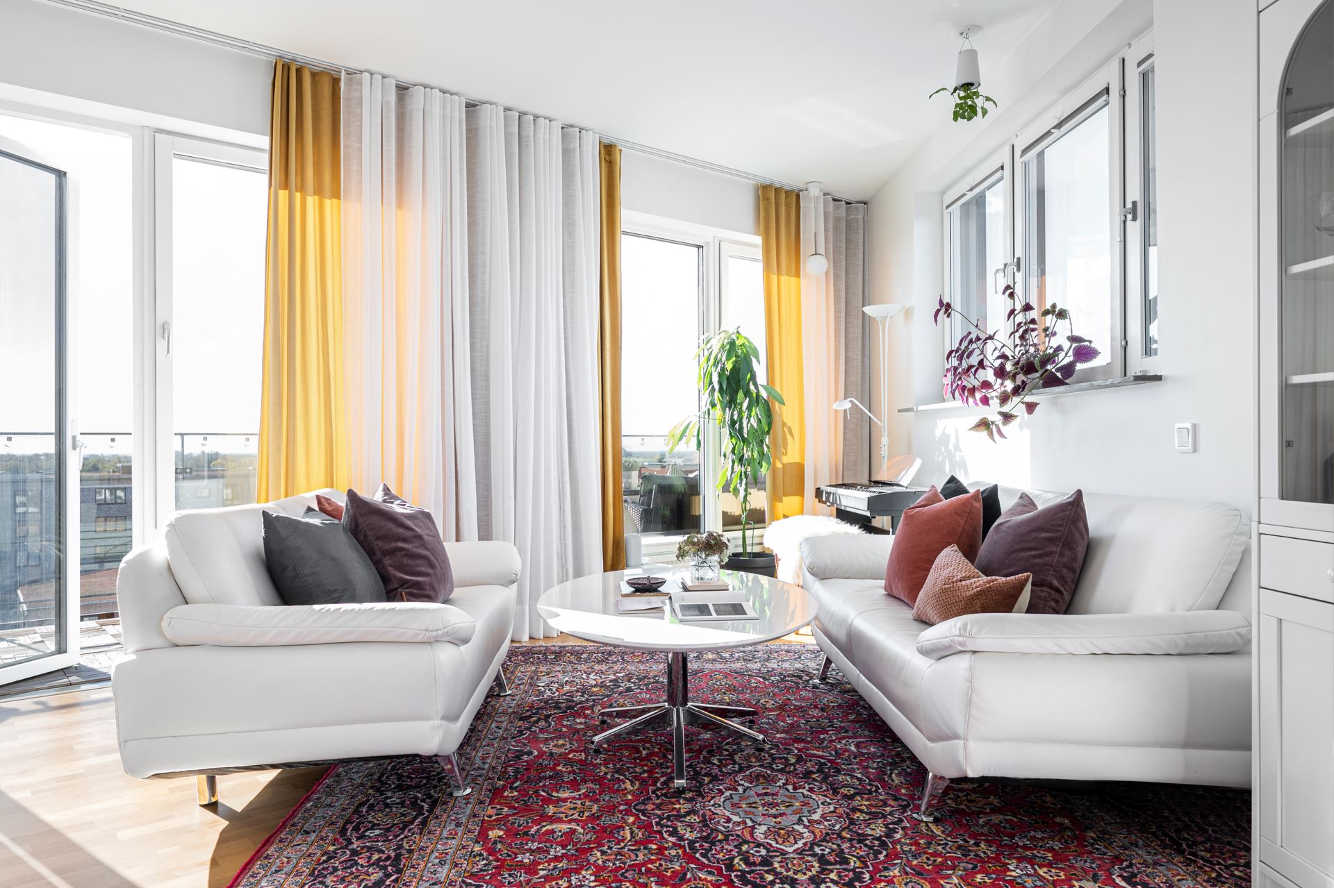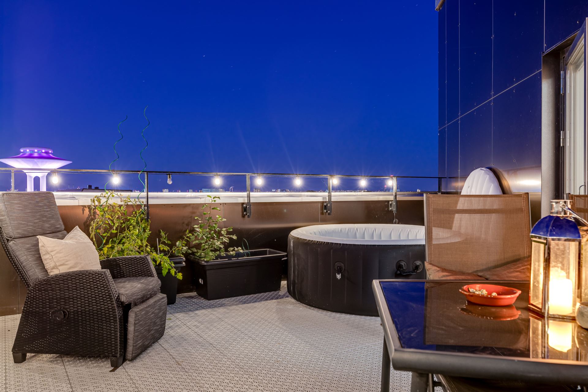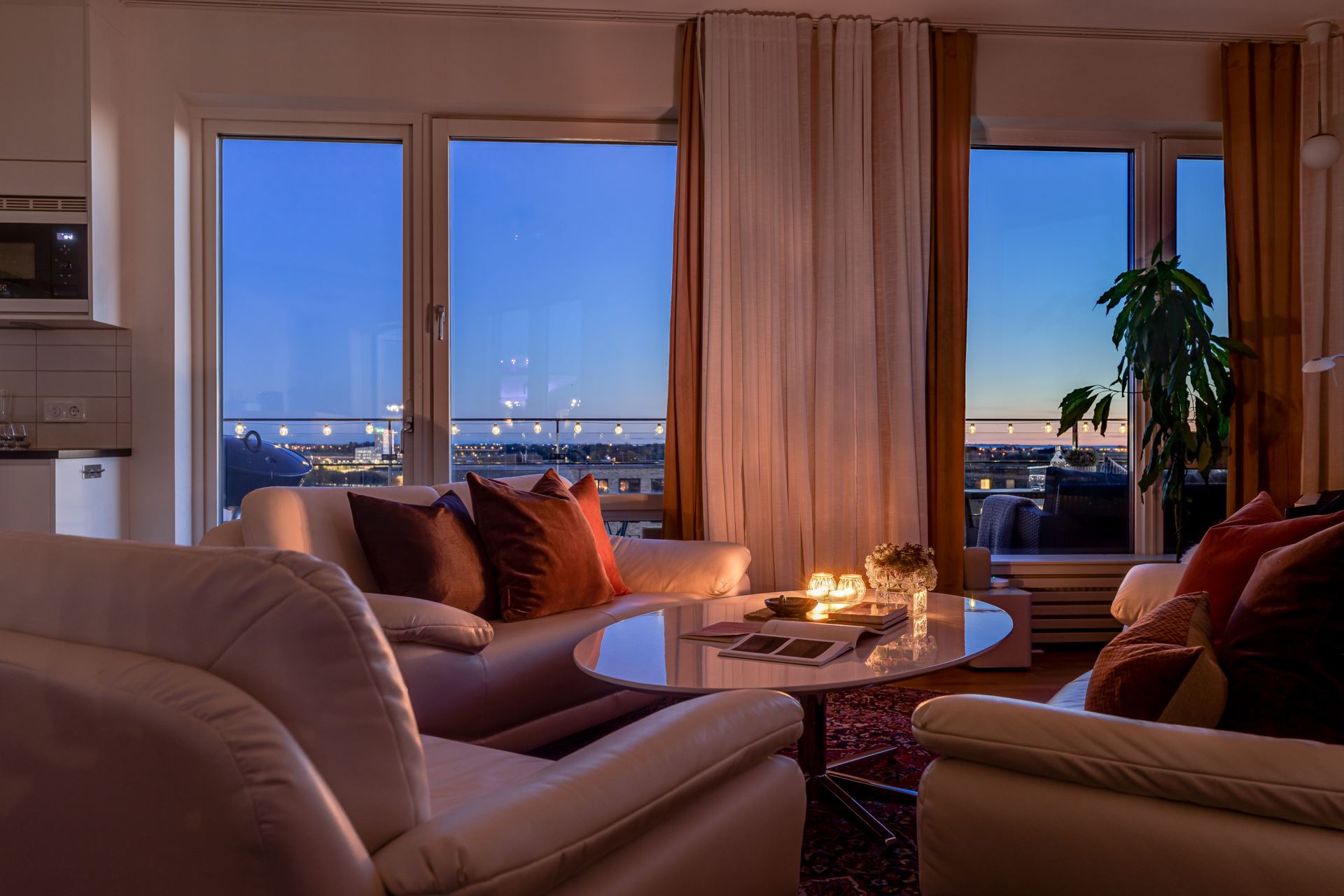 Vidare bjuder vardagsrummet in med ett slående ljusinsläpp ifrån stora fönsterpartier som sträcker sig från golv till tak. Här har vi även utgång till bostadens rymliga och härliga balkong. Här kan enkelt möbleras med såväl soffgrupp som ett större middagsbord på andra änden av rummet utan att den luftiga känslan går förlorad. Från middagsbordet tar vi två trappsteg upp och möts av bostadens helt egen takterrass, den otroligt rymliga takterrassen är perfekt som extra sällskapsyta, och här finns gott om plats för att möblera efter behov.