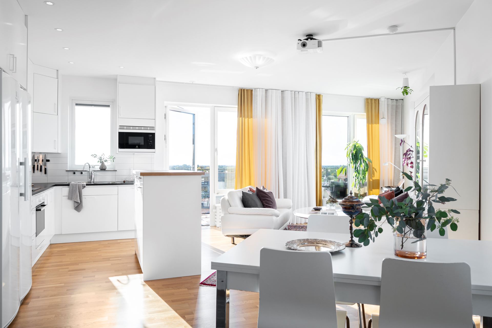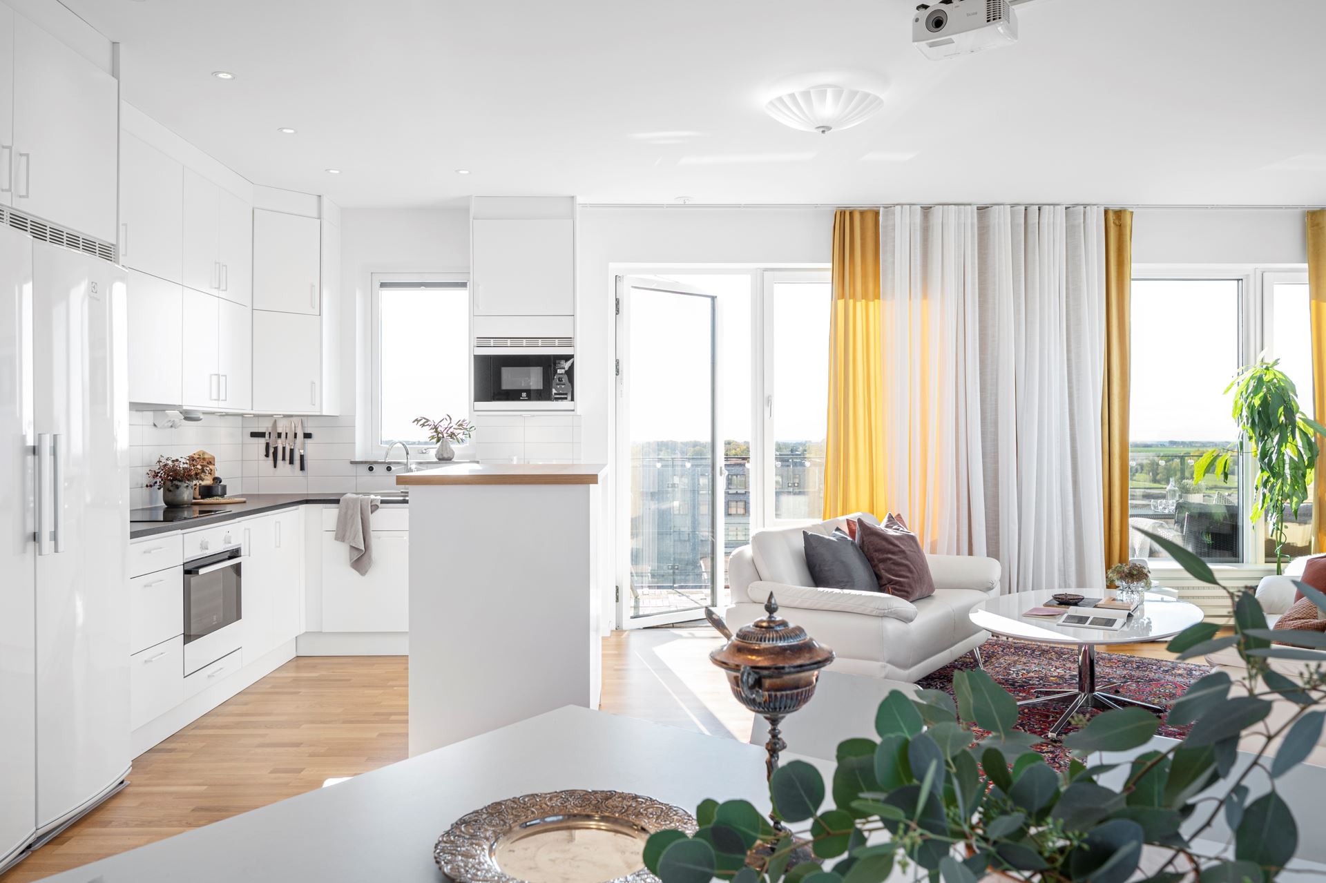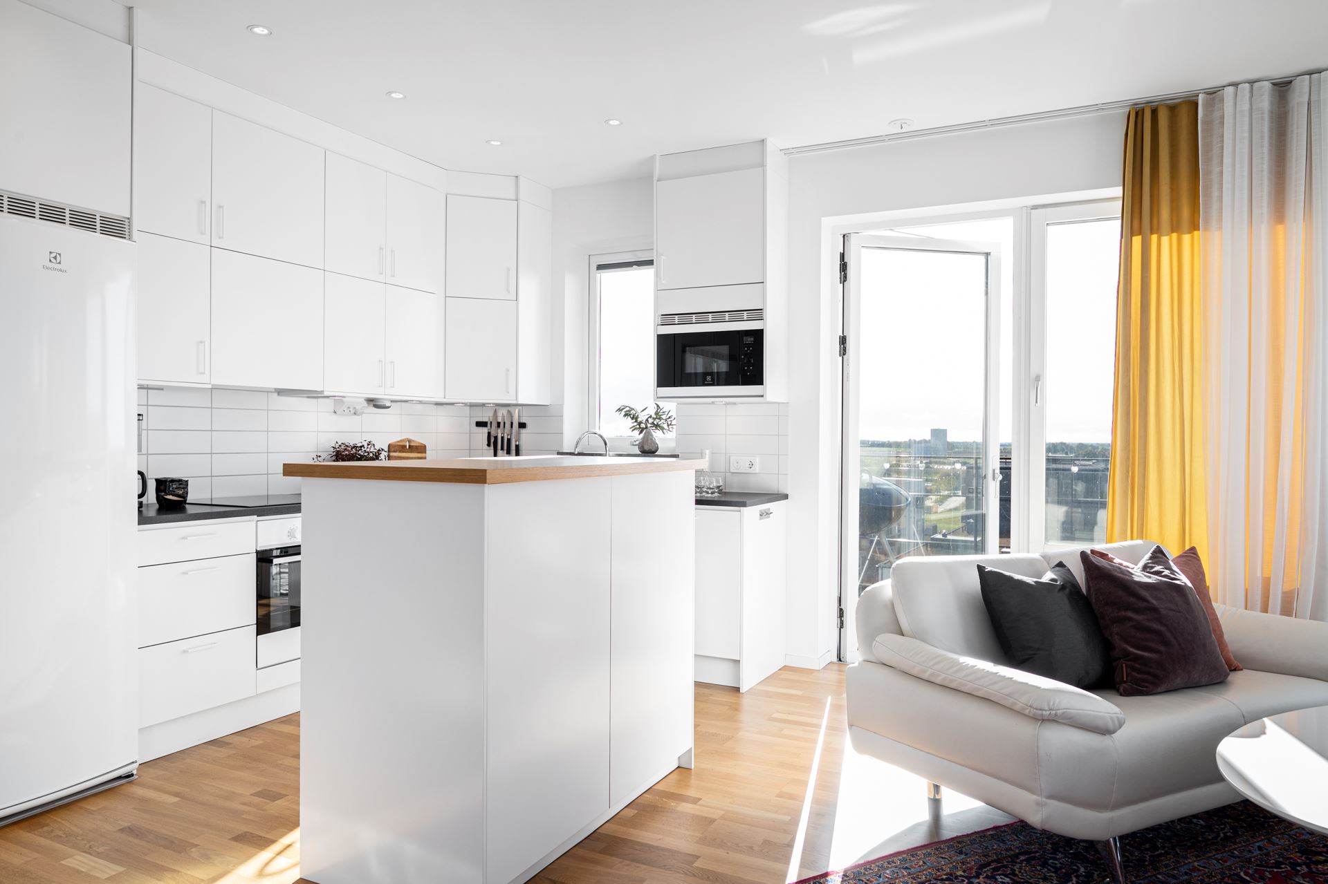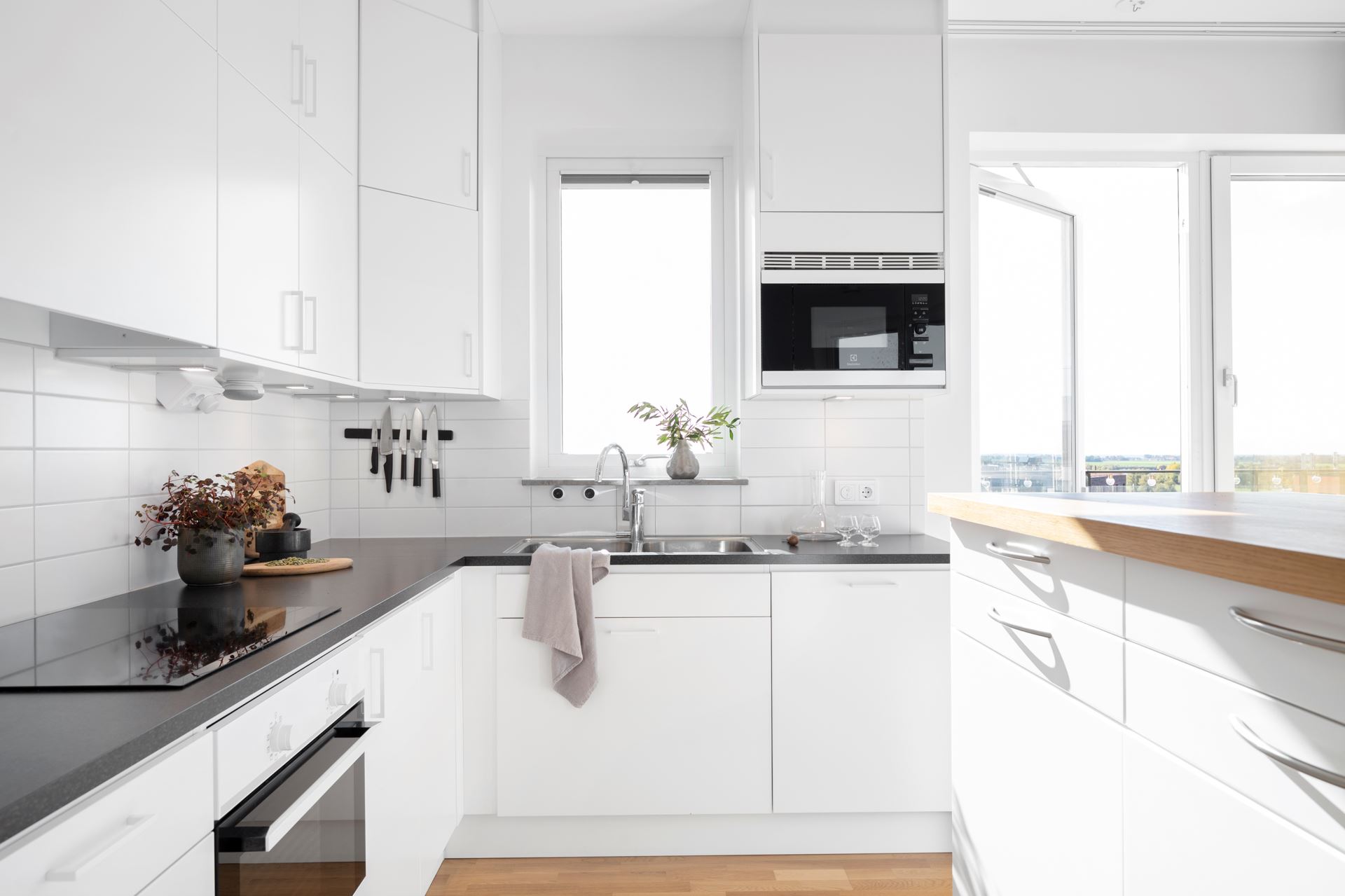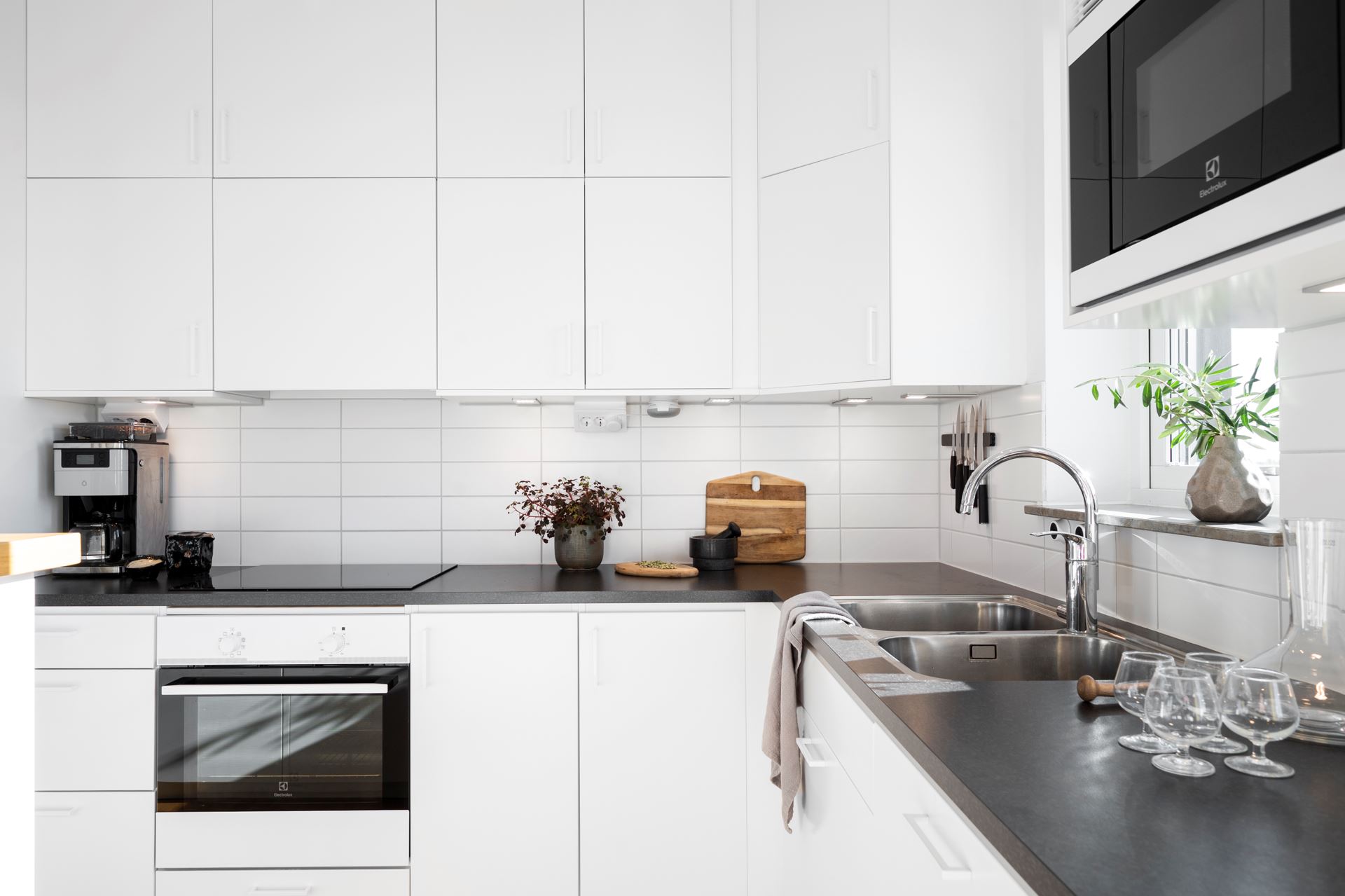 Längre in i bostaden på vänster hand finner vi köket som bjuder på vita profilerade köksluckor (Vedum) tillsammans med vitt kakel och mörk bänkskiva i laminat. Köket är utrustat med kyl och frys, inbyggd mikro, induktionshäll och ugn. Samtlig utrustning i köket är från Siemens, köksfläkt (Franke). För ytterligare arbetsplats och förvaring finns även köksö.