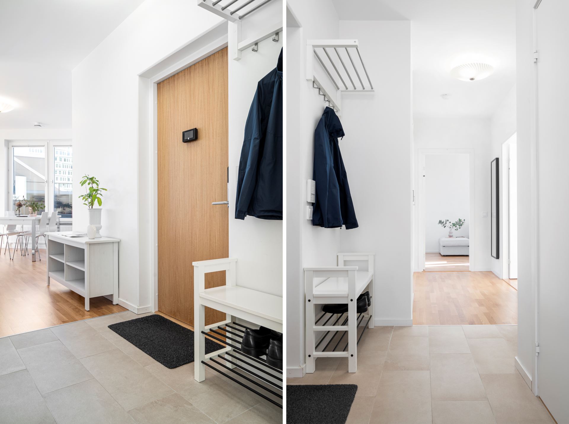 Vi tar hissen högst upp i huset till 8:e våningen där vi välkomnas in i hallen som bjuder på beige klinkergolv tillsammans med ljusa väggar. Släta vita väggar tillsammans med ekparkett på golv, vilket återfinns enhetligt i hela bostaden. Ytterligare plats till förvaring finns i form av garderober längre in.