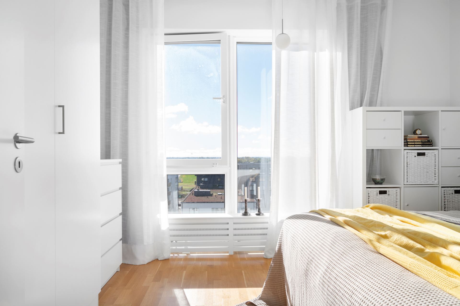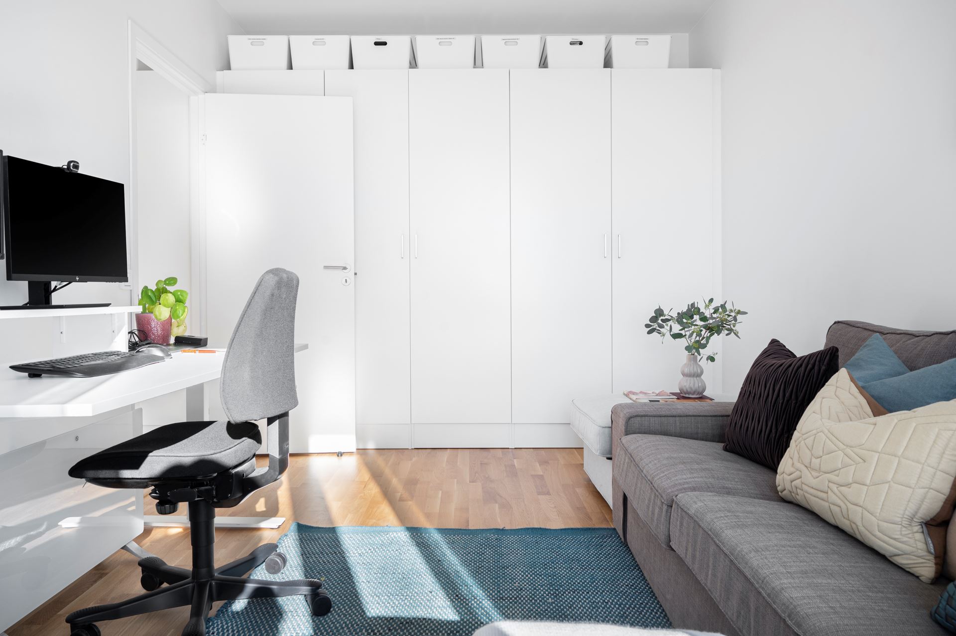 Det första sovrummet kan nyttjas perfekt som barnrum, hemmakontor eller gästrum. Vita släta väggar tillsammans med ekparkett på golv. Platsbyggd garderobslösning längs med ena sidan av rummet. Även här får vi otroligt ljusinsläpp tack vore de stora fönsterpartierna.