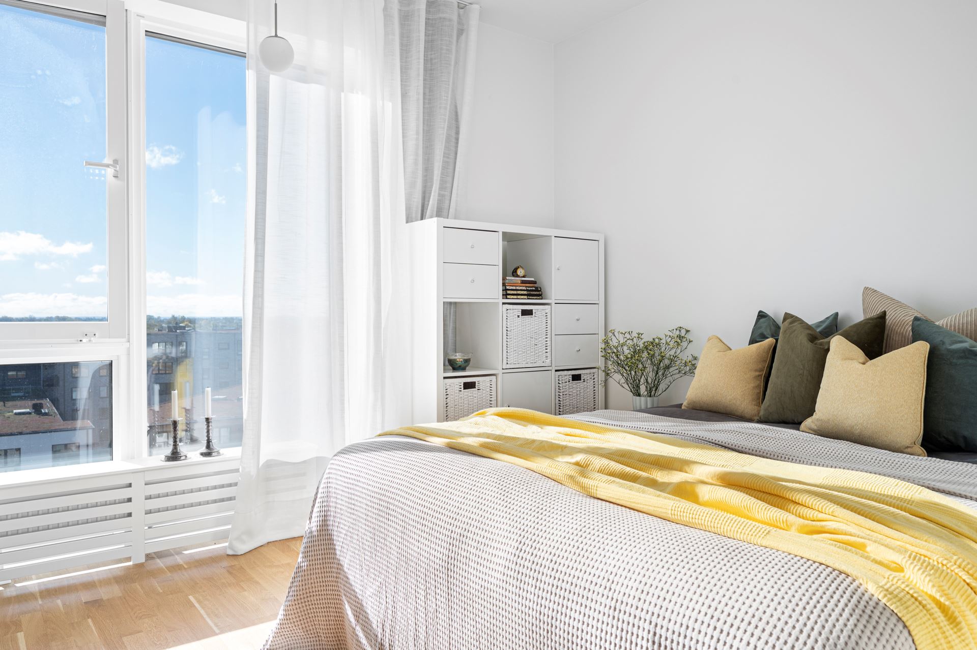 Vägg i vägg hittar vi det andra sovrummet. Ett behagligt sovrum som med lätthet inrymmer dubbelsäng och tillhörande möblemang. Rikligt med ljusinsläpp ifrån stora fönster med överliggande ljus. Även här finns platsbyggd garderobslösning.