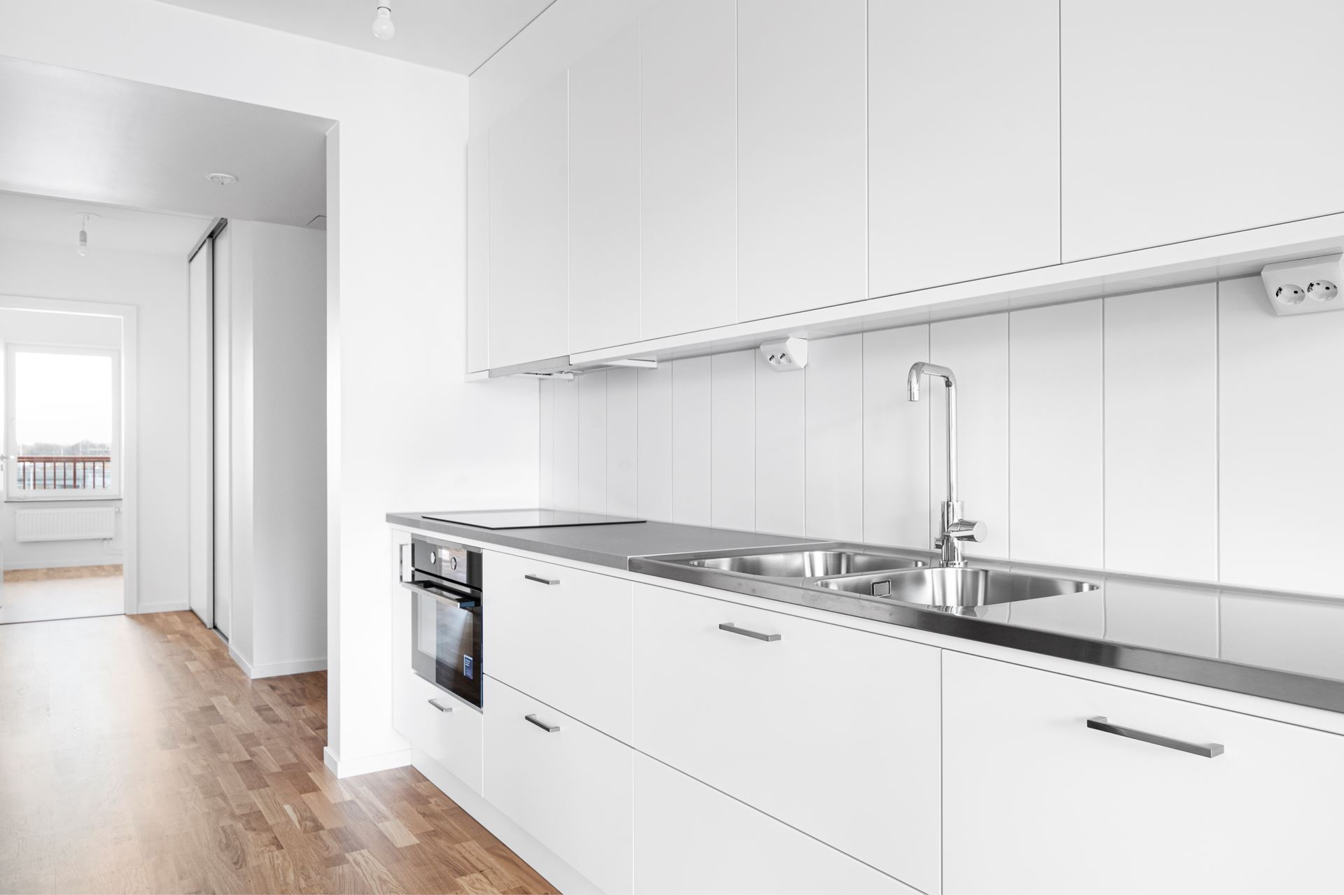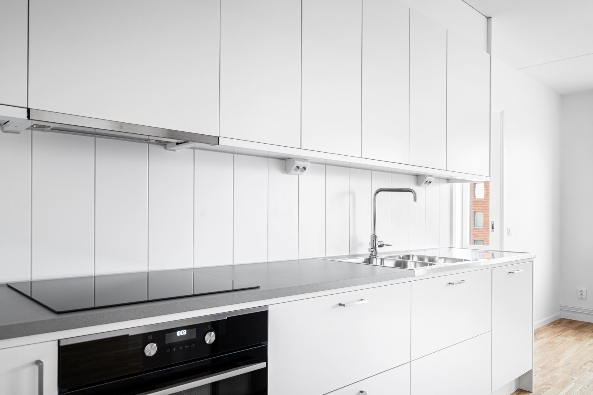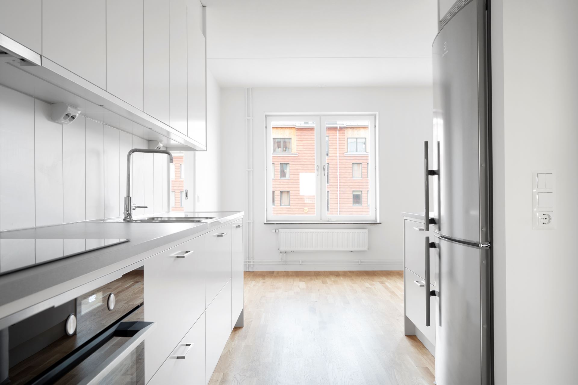 Vita köksluckor (Vedum) kombineras med grå bänkskiva i laminat och bakkantslist i laminat (150 mm) ovan. Köket är utrustat med kyl och frys i rostfritt, diskmaskin, induktionshäll, kombiugn med mikro. Samtlig maskinpark från Electrolux.