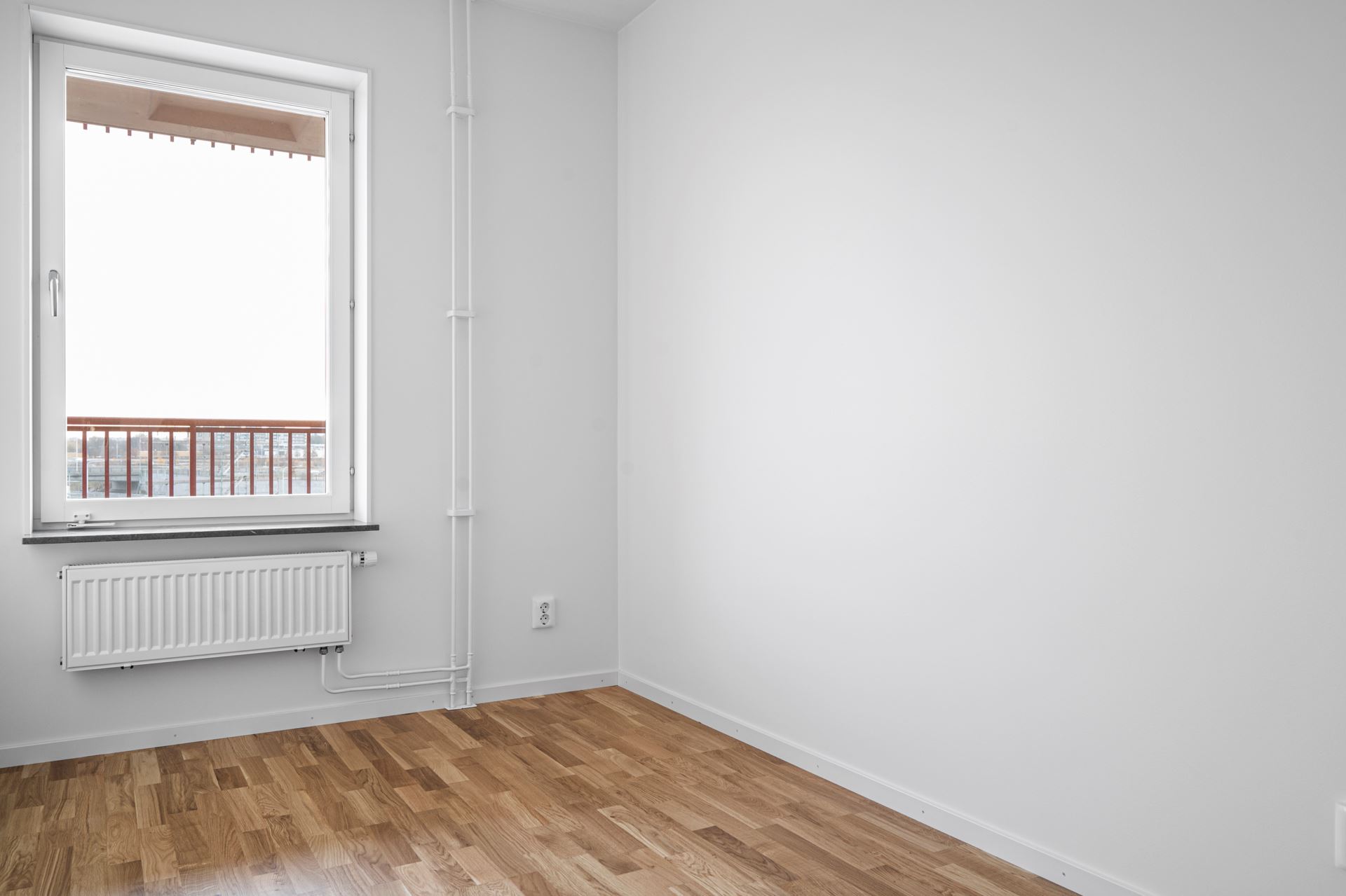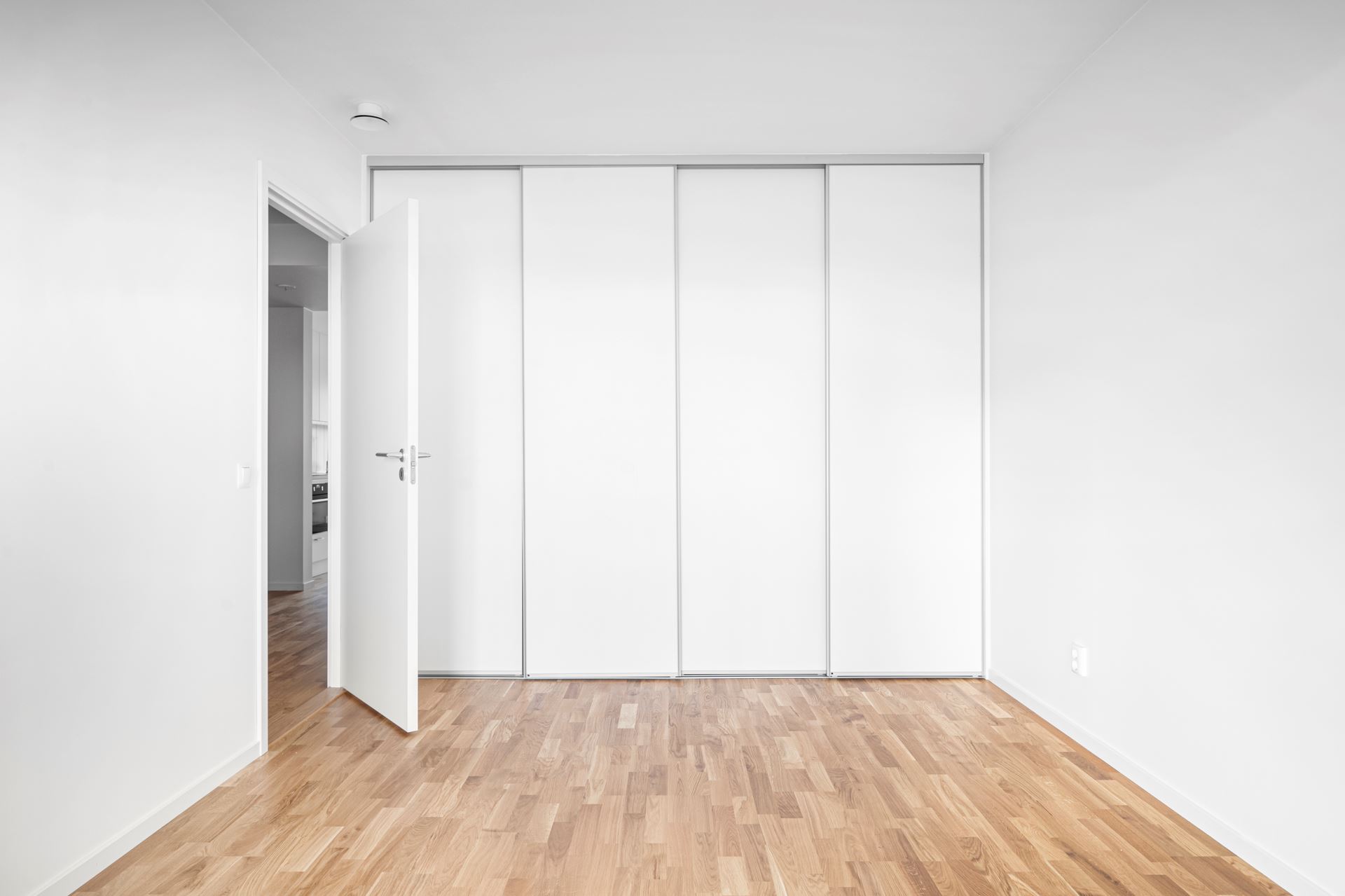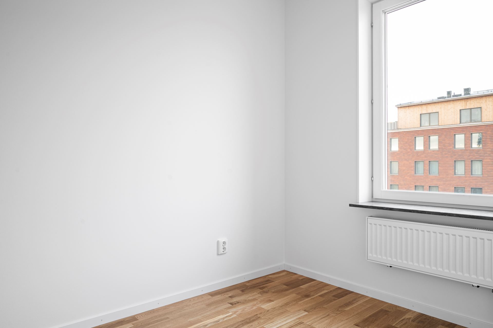 Vägg i vägg finns det mindre sovrummet som passar perfekt som barnrum, gästrum eller ett utmärkt hemmakontor. Även här finns ekparkett på golv och släta vita väggar, liksom i resterande av lägenheten.
