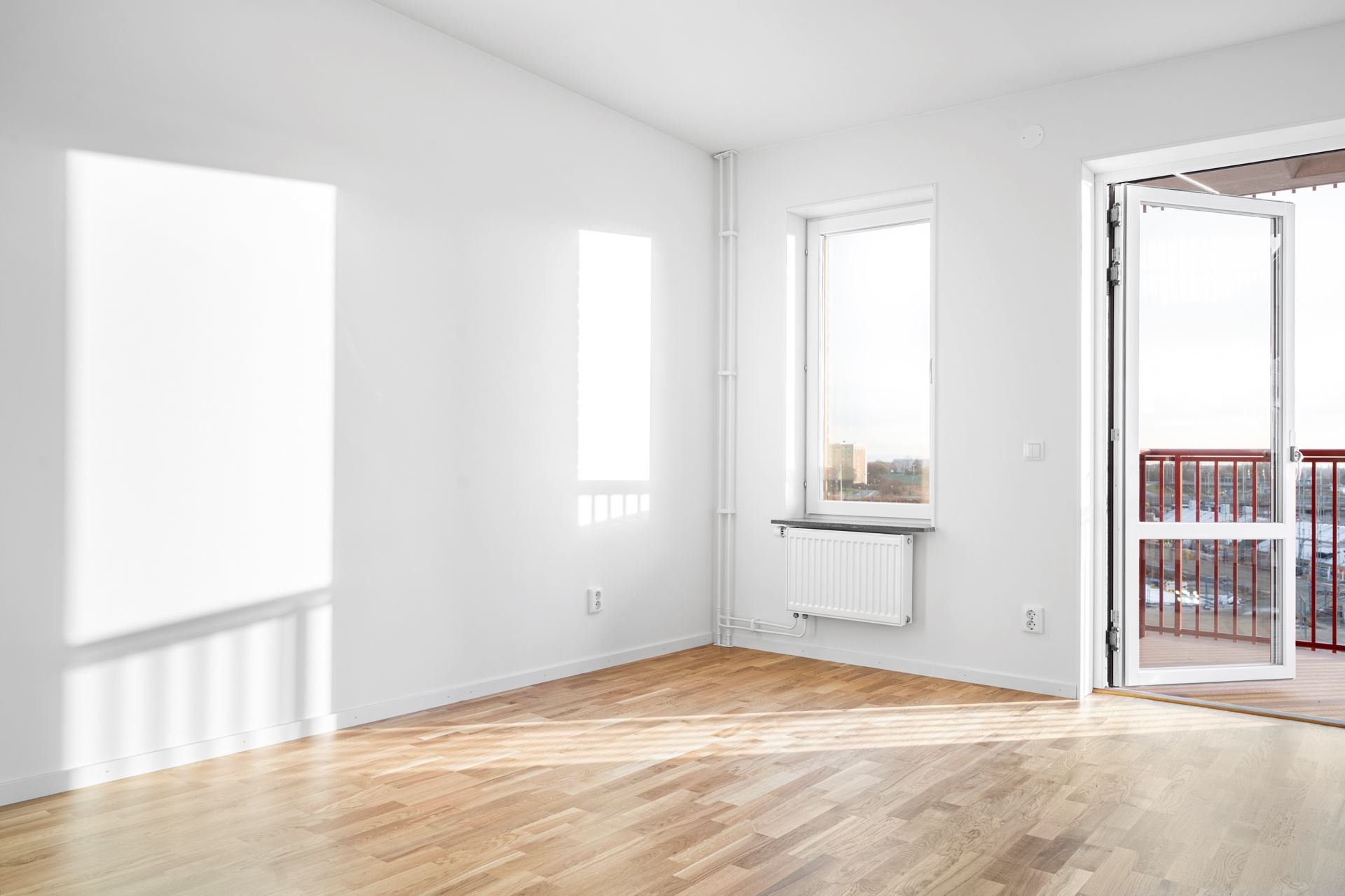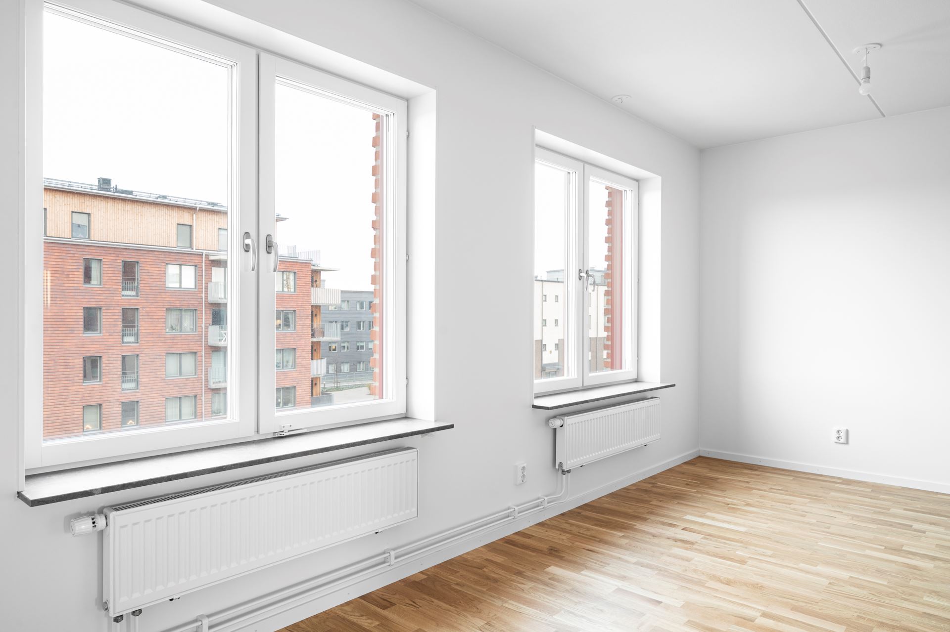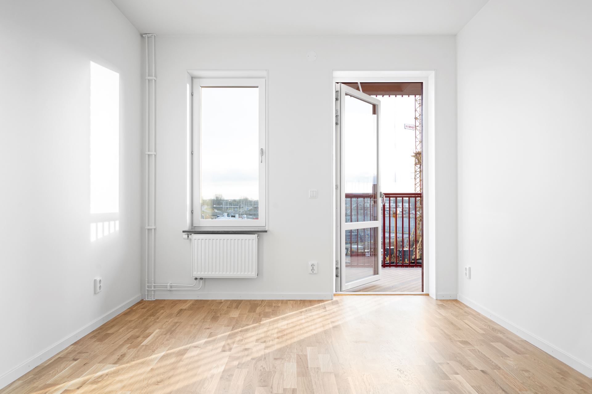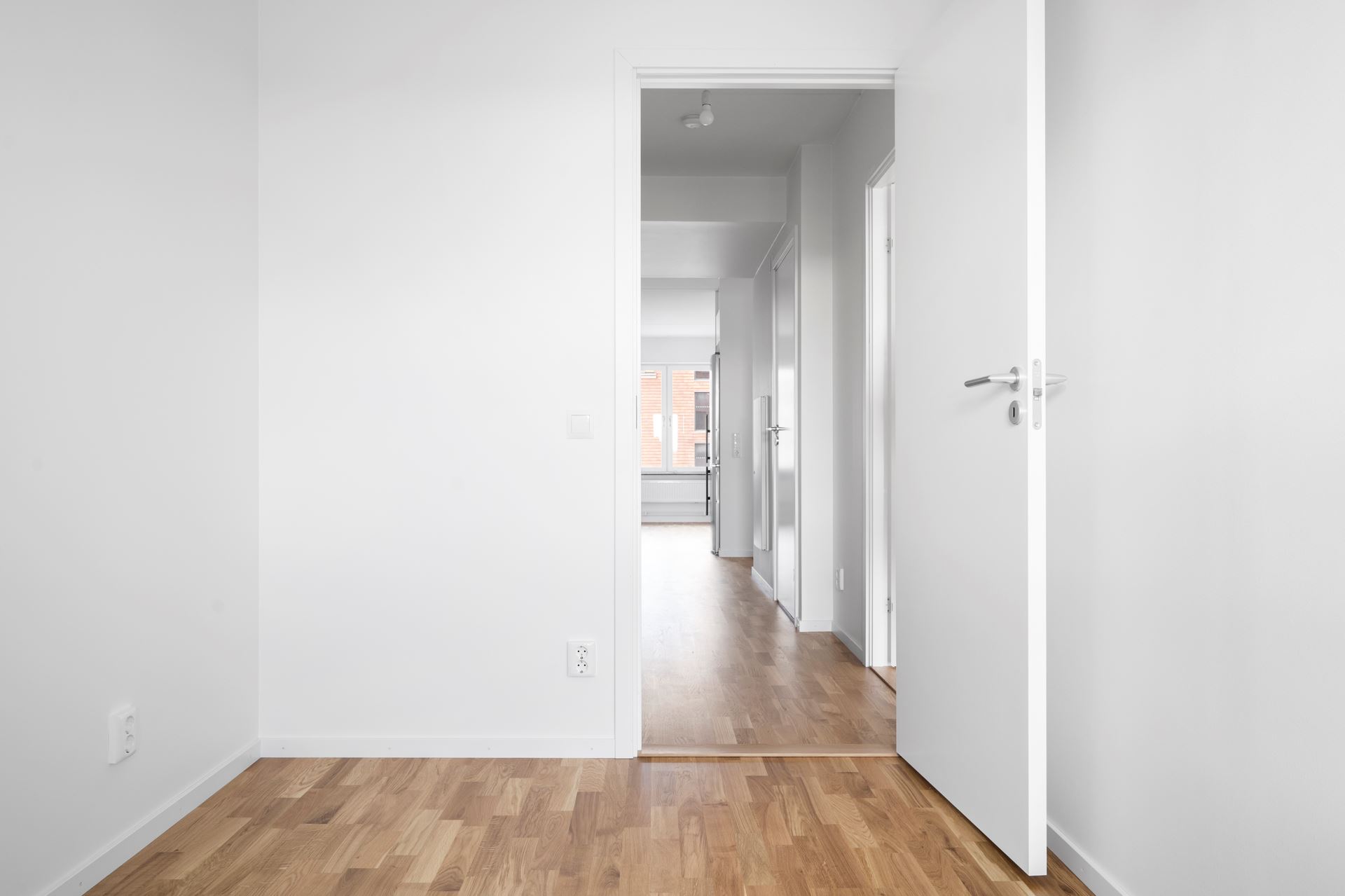 Vägg i vägg finns det mindre sovrummet som passar perfekt som barnrum, gästrum eller ett utmärkt hemmakontor. Även här finns ekparkett på golv och släta vita väggar, liksom i resterande av lägenheten.