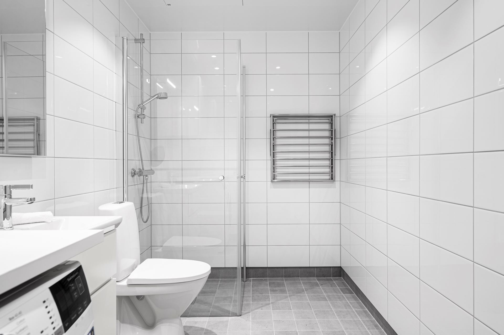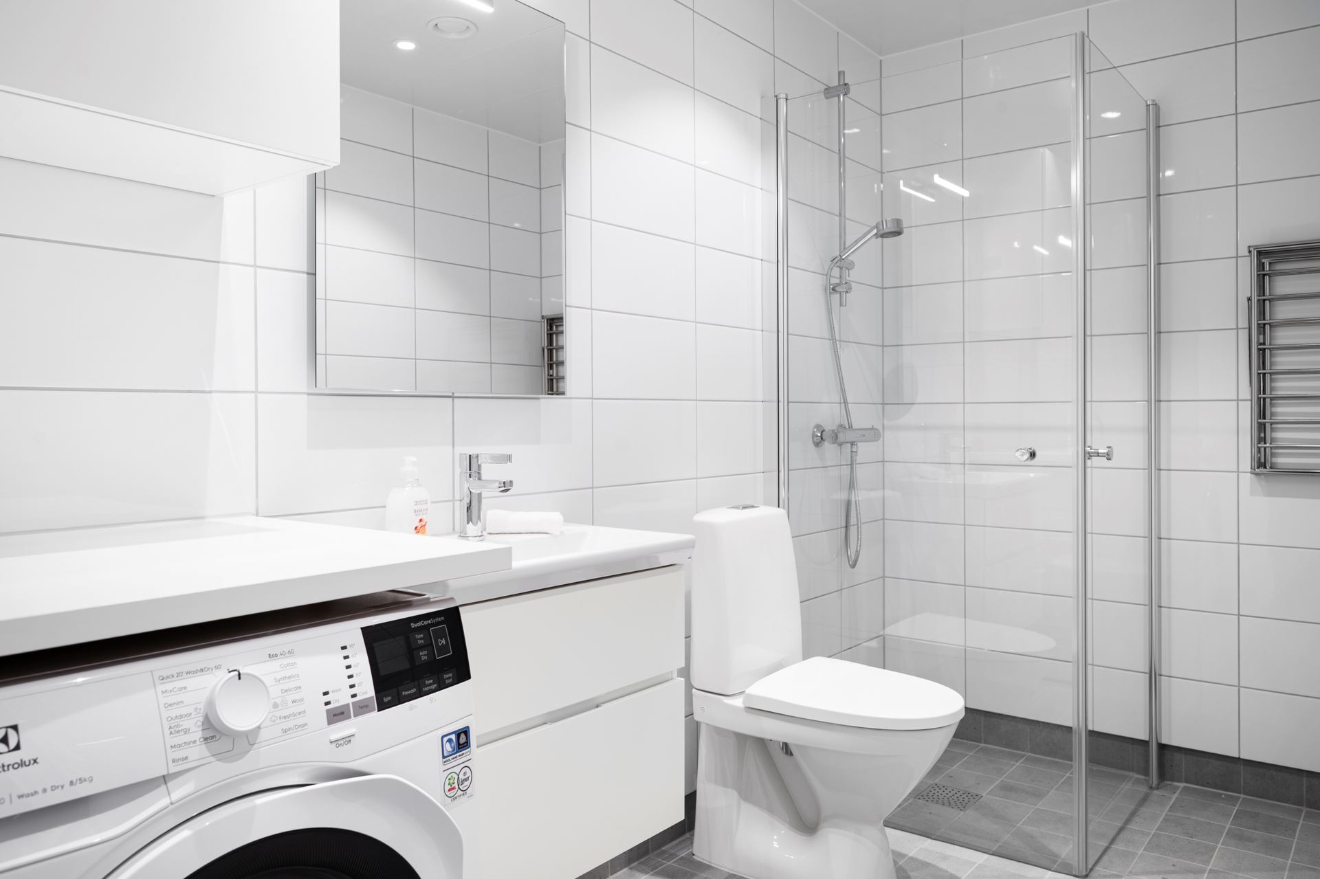 Helkaklat badrum med vitt kakel på väggarna tillsammans med gråa klinkers på golv. Badrummet är utrustat med dusch bakom glasvägg, handfat med kommod, spegel med belysning, infällda spotlights i tak vägghängd torkställning.