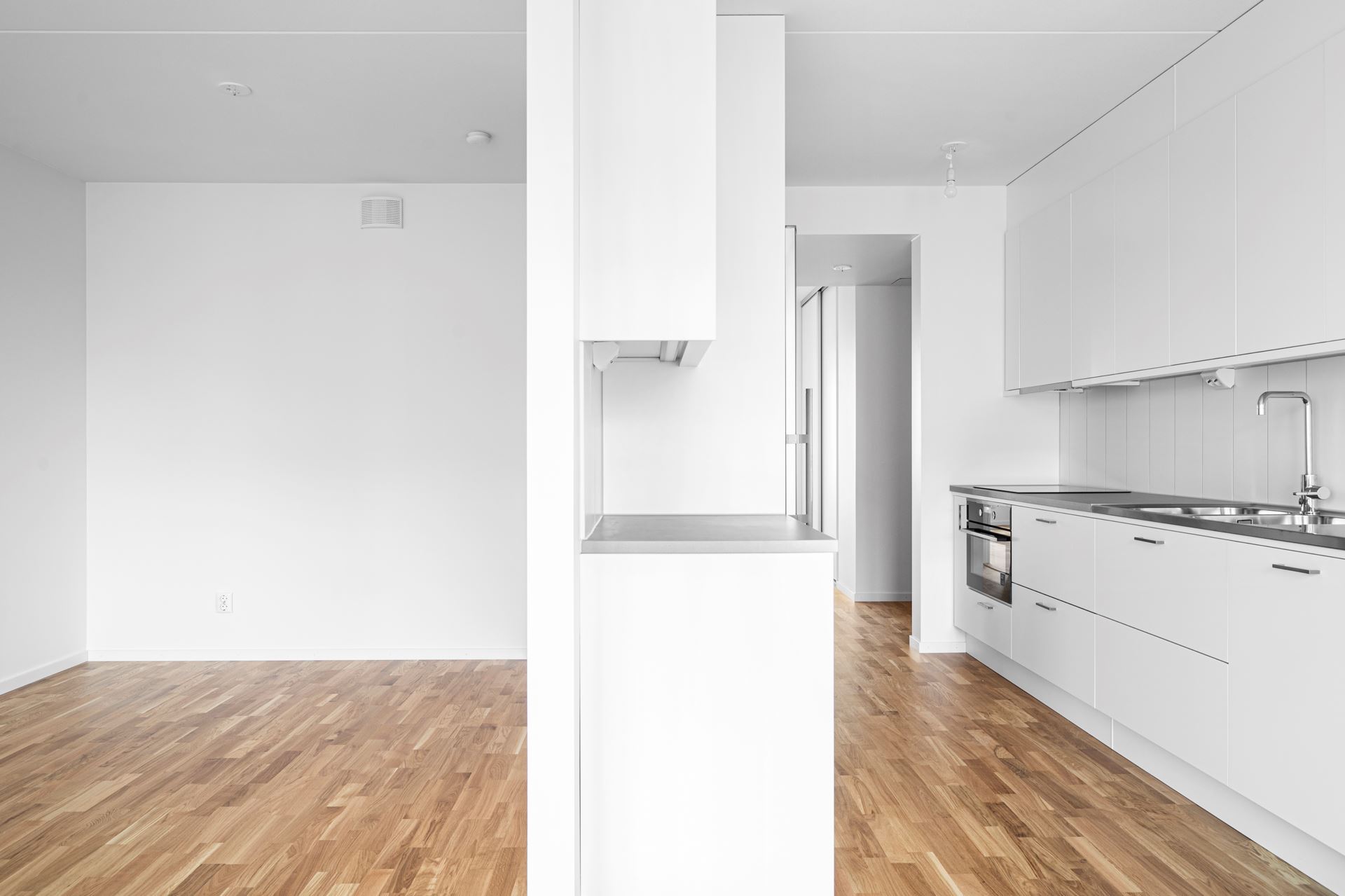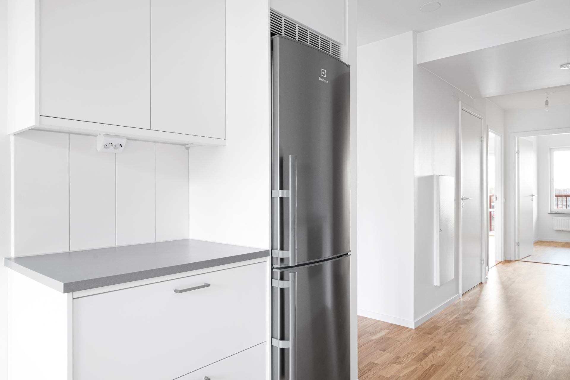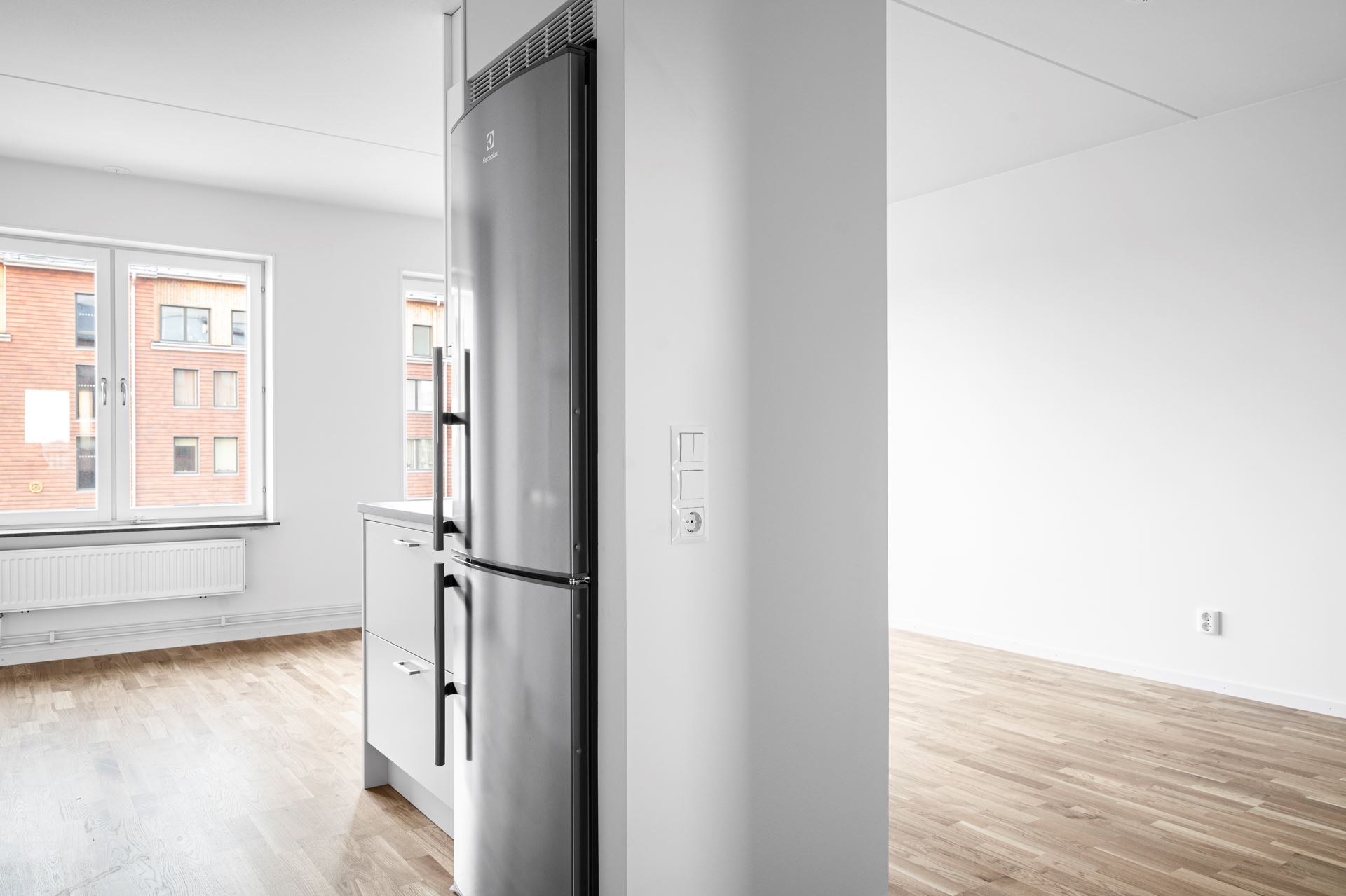 Vidare öppnar lägenheten upp med öppen planlösning mellan kök och vardagsrum. Härligt ljusinsläpp i rummet i kombination med optimalt planerade kvadratmeter. Vardagsrummet kan enkelt möbleras med soffgrupp och matbord mot köksdelen. Praktisk vägg bakom kyl/frys skärmar av kök och vardagsrum men ändå bibehålls den luftiga känslan och öppna planlösningen.
